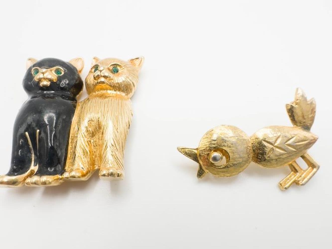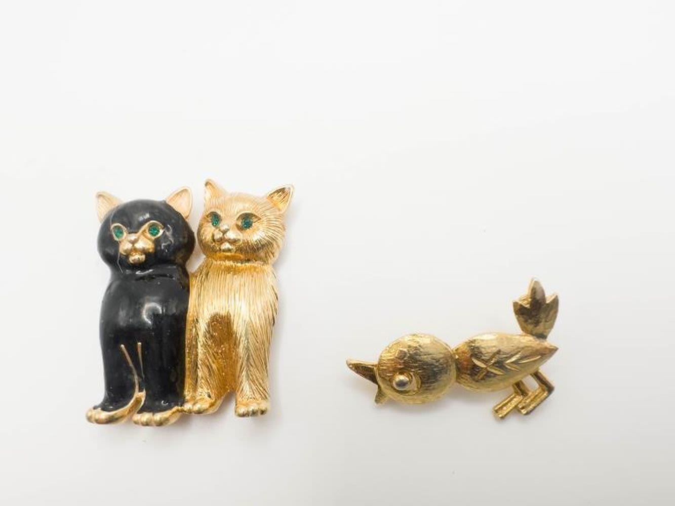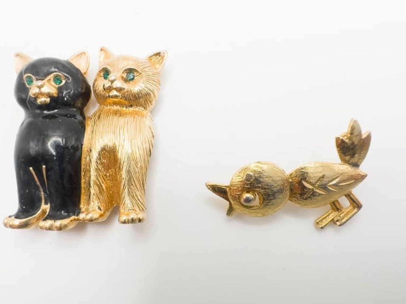 DUBARRY SINGED BIRD BROOCH AND CATS BROOCH WITH GREEN EYES