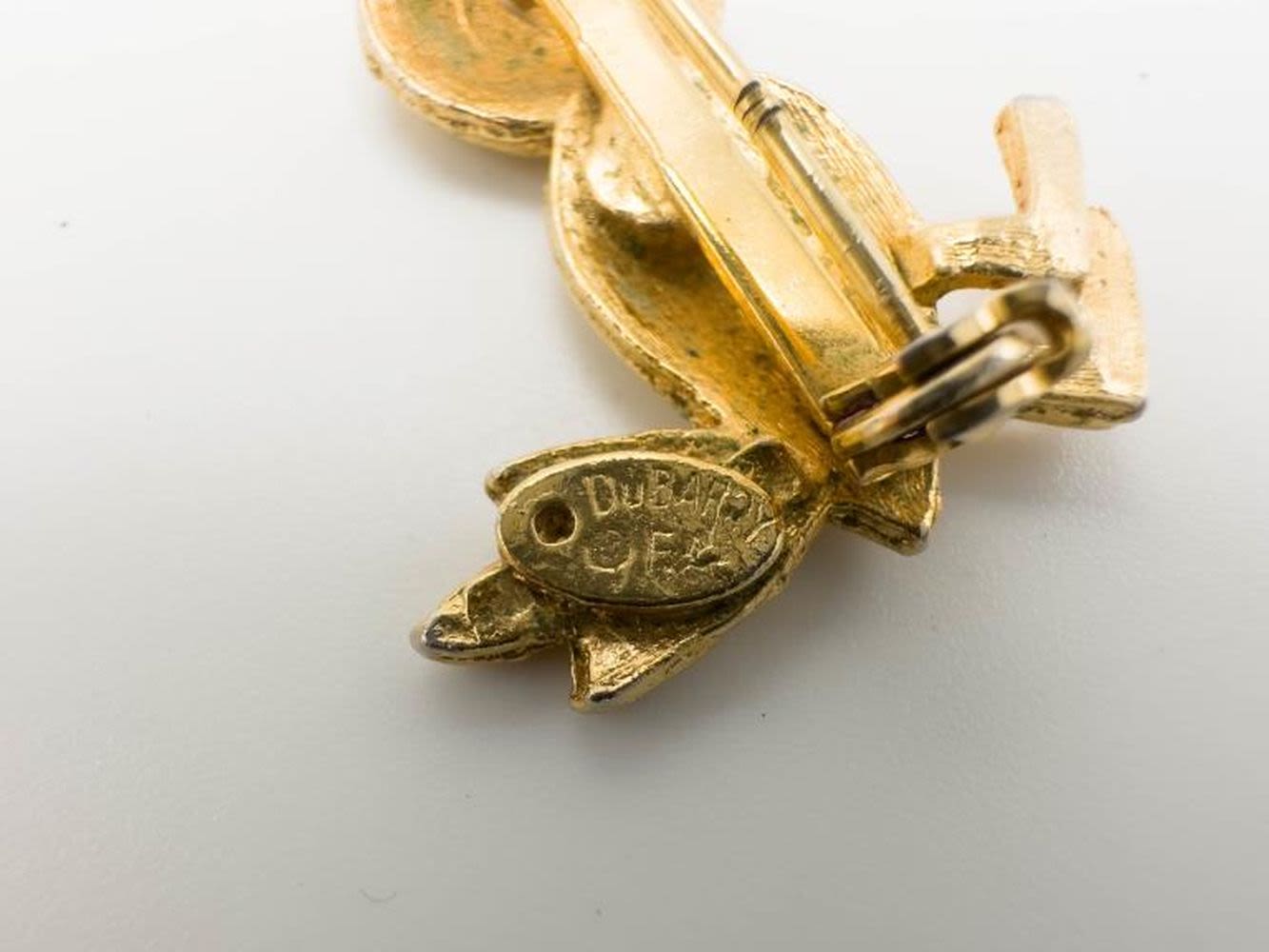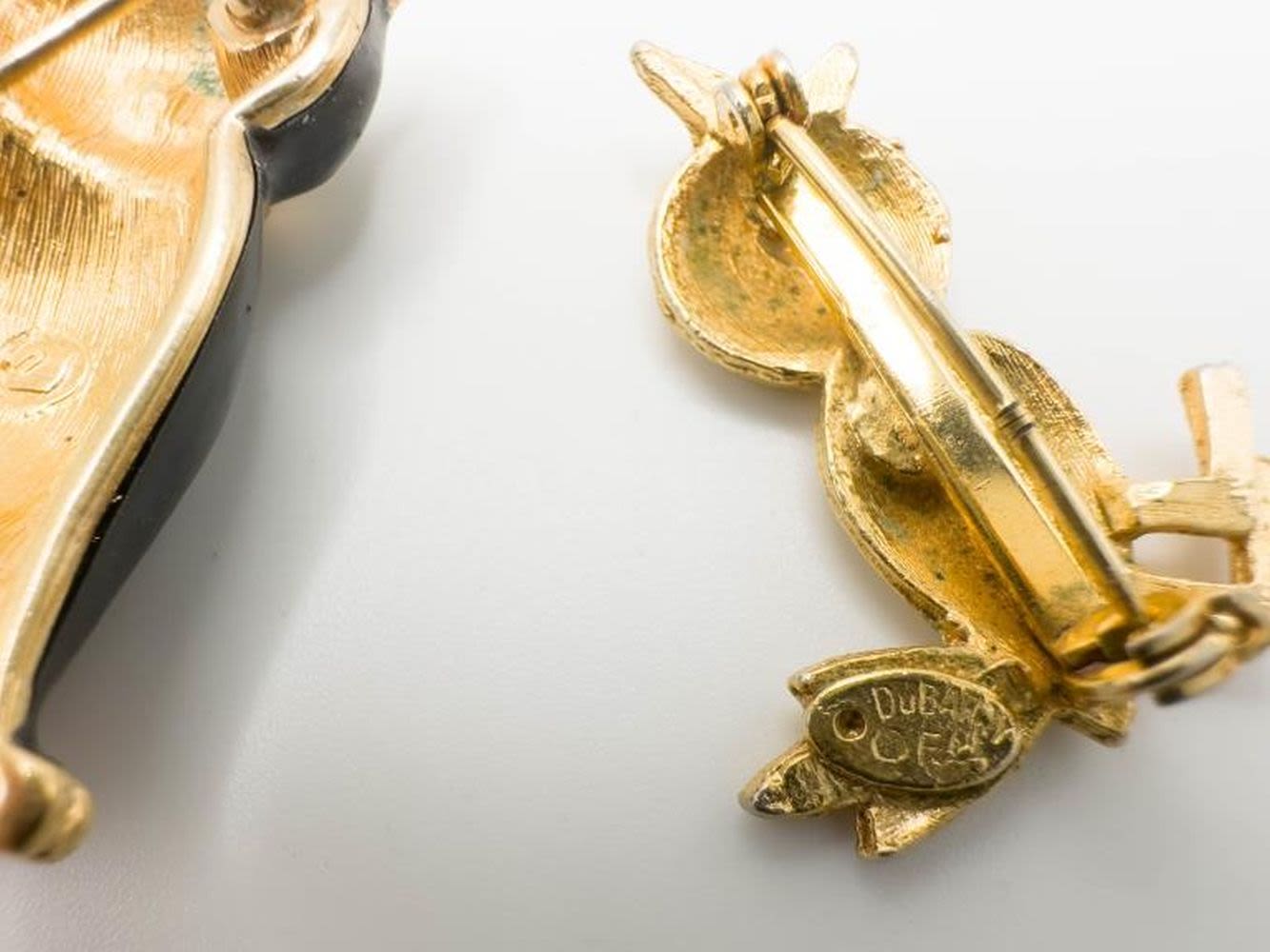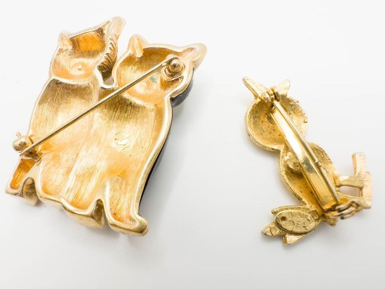 DUBARRY SINGED BIRD BROOCH AND CATS BROOCH WITH GREEN EYES
