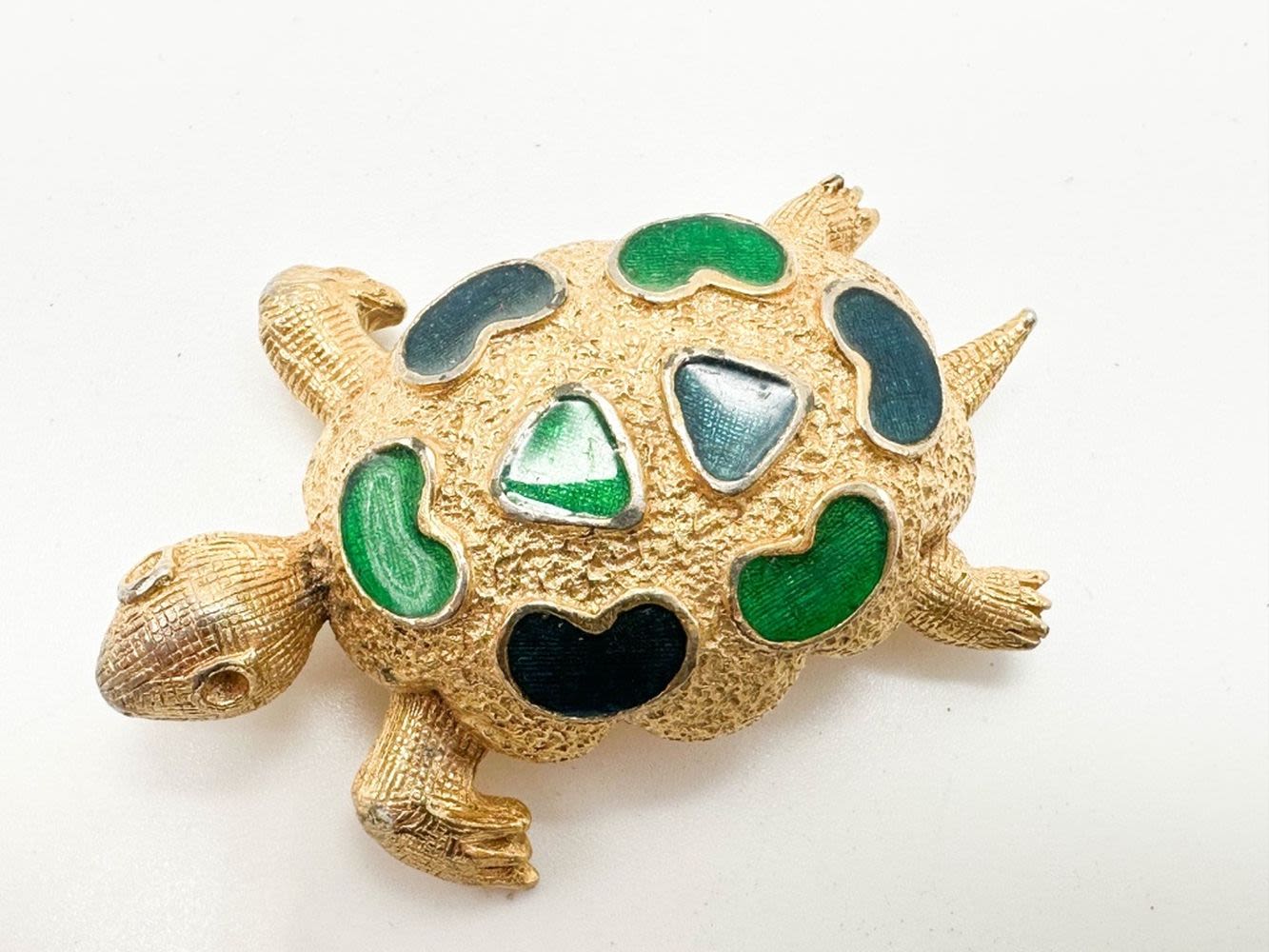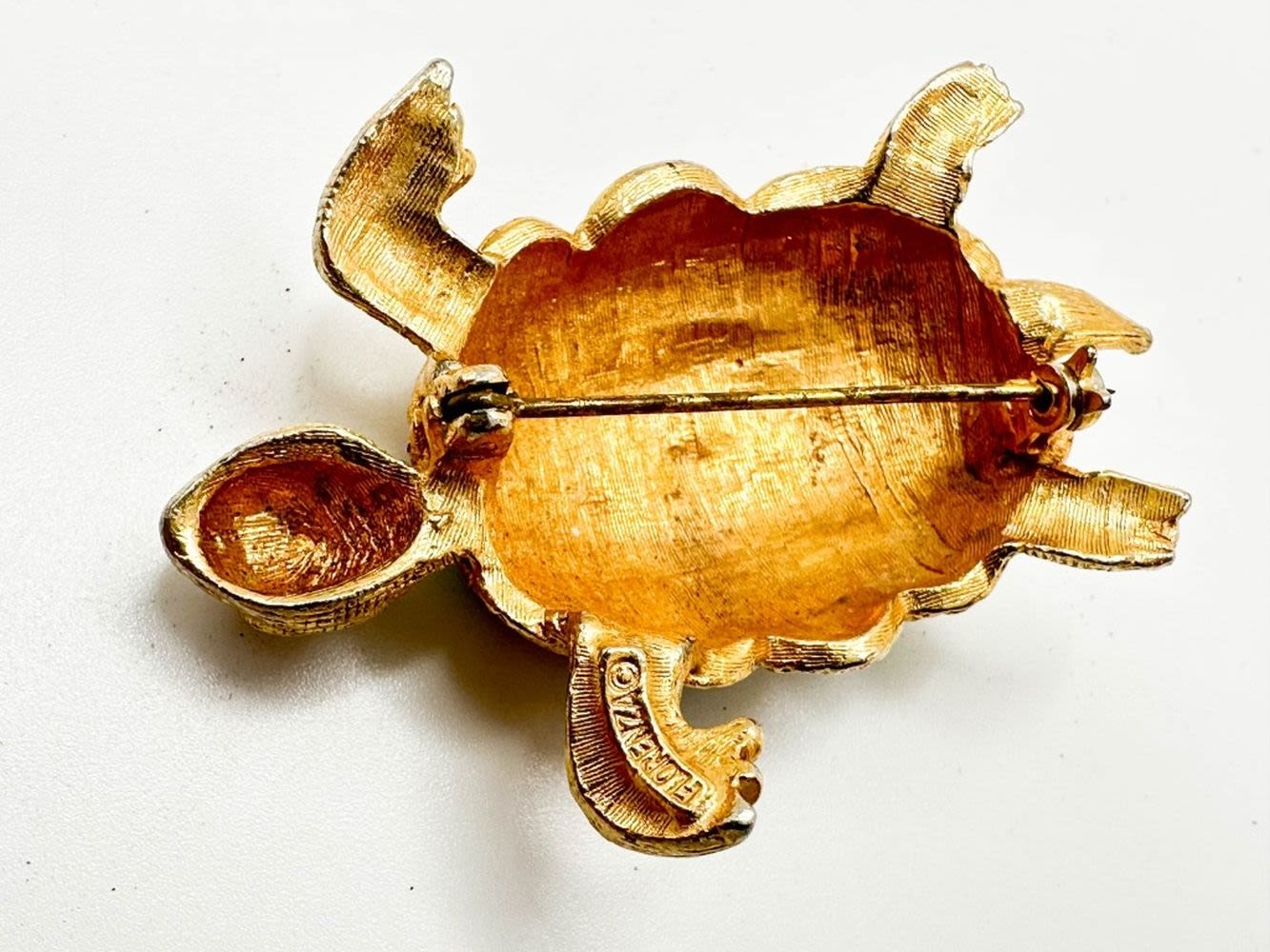 FLORENZA SIGNED TURTLE BROOCH WITH GREEN STONES ON BACK