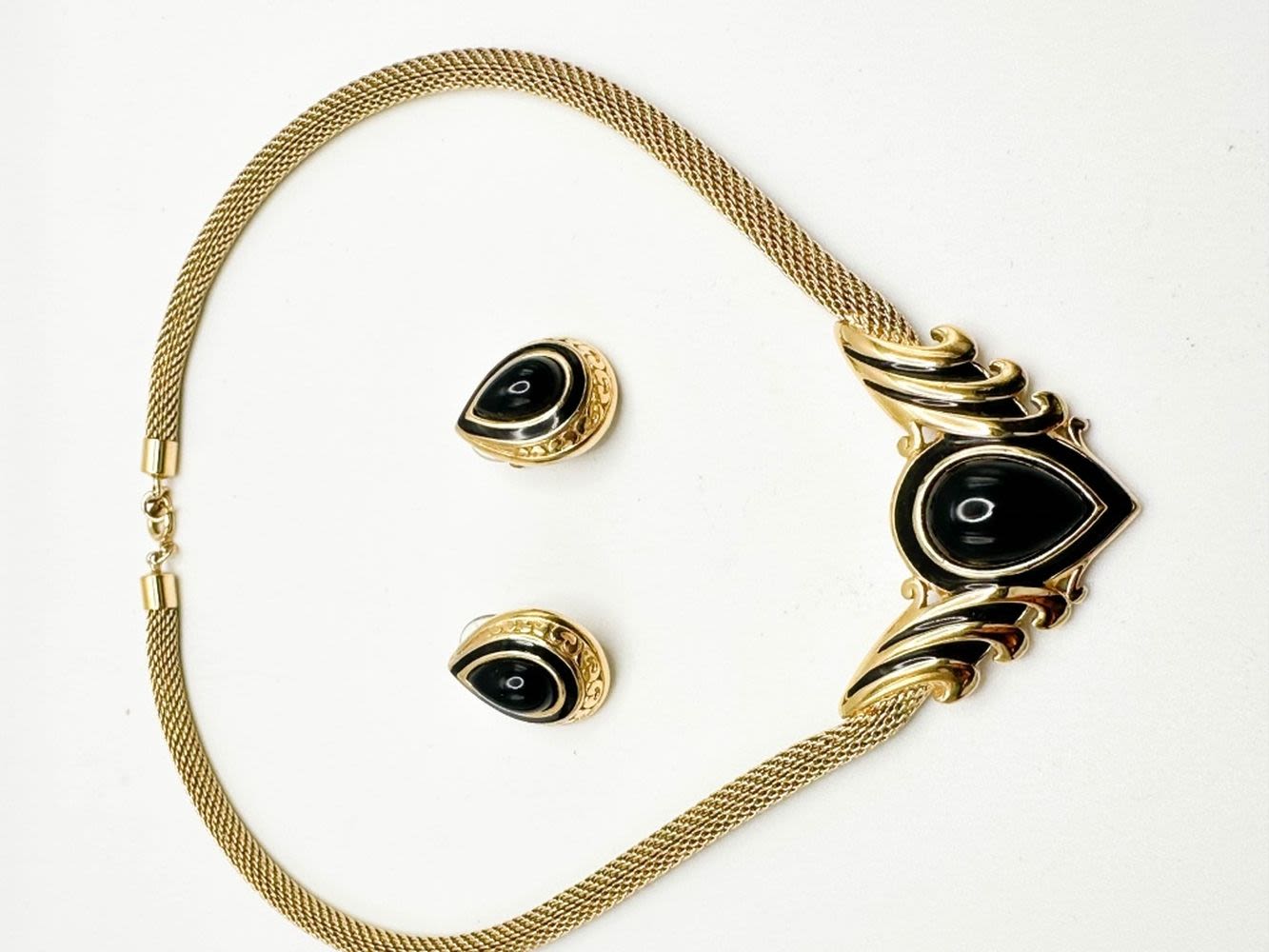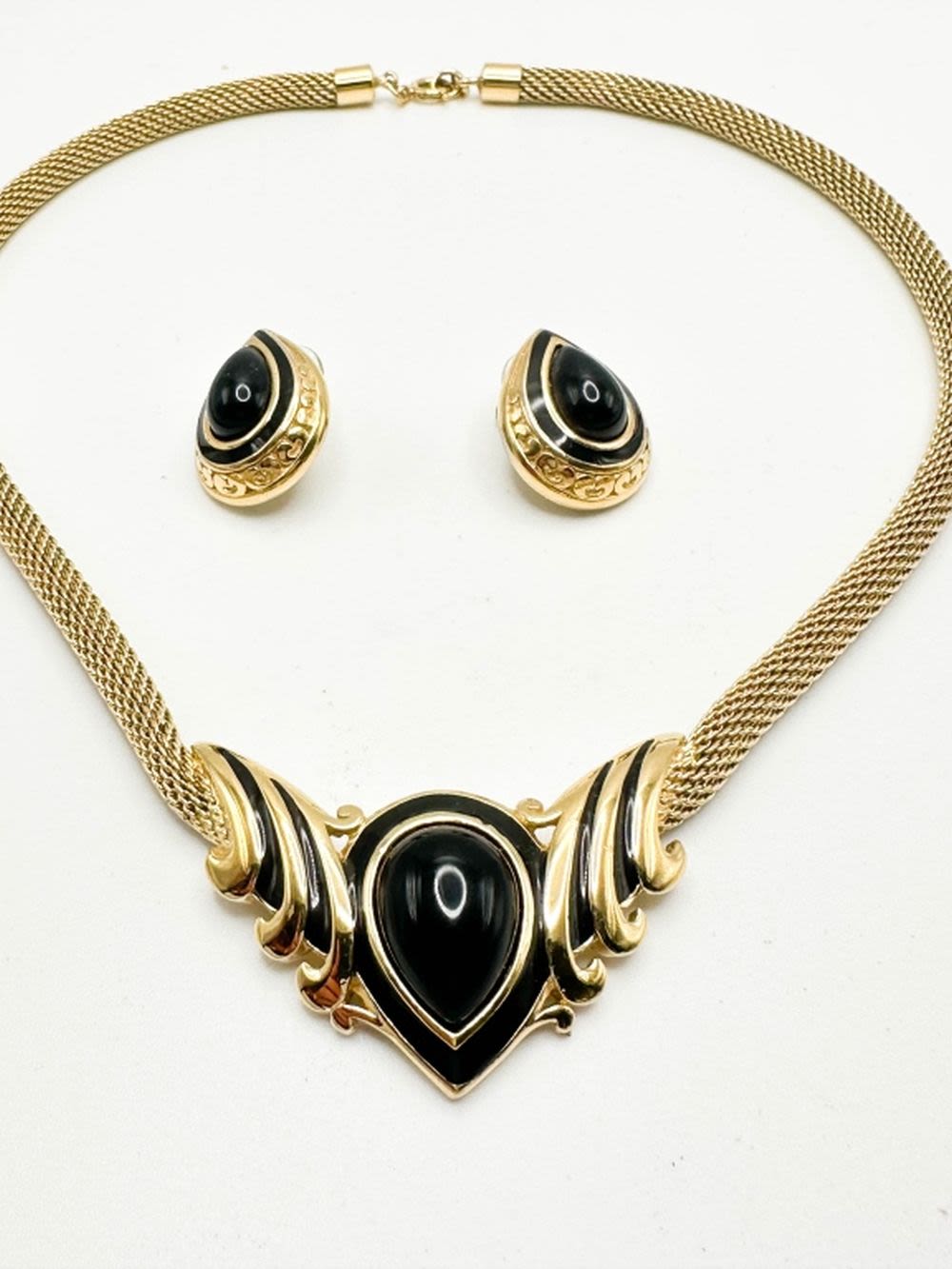 TRIFARI NECKLACE SET WITH EARRINGS WITH BLACK STONES ON GOLD TONE , SIGNED TRIFARI