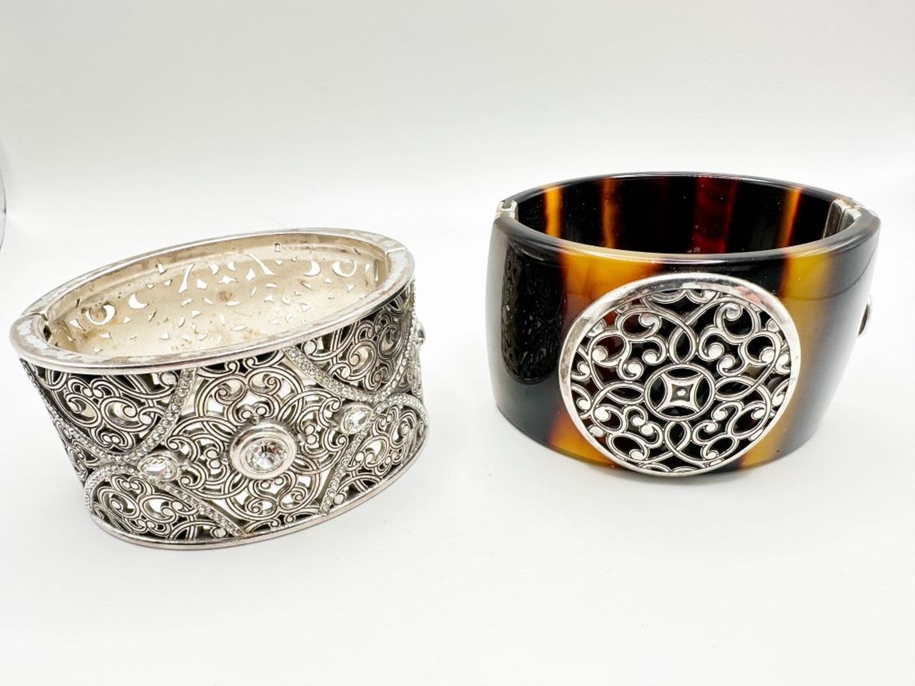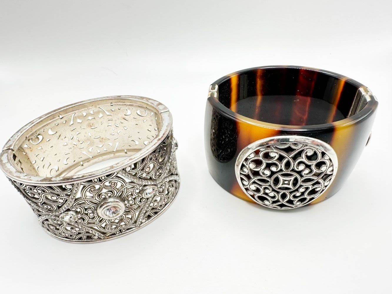 2 SCROLL WORK BRACELETS, ONE WITH STONES