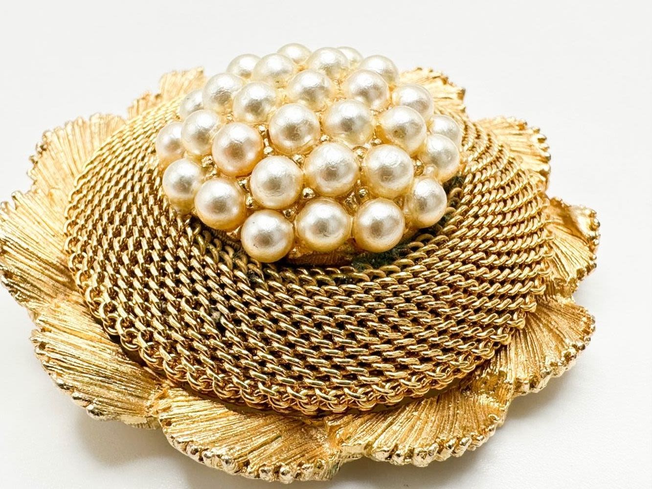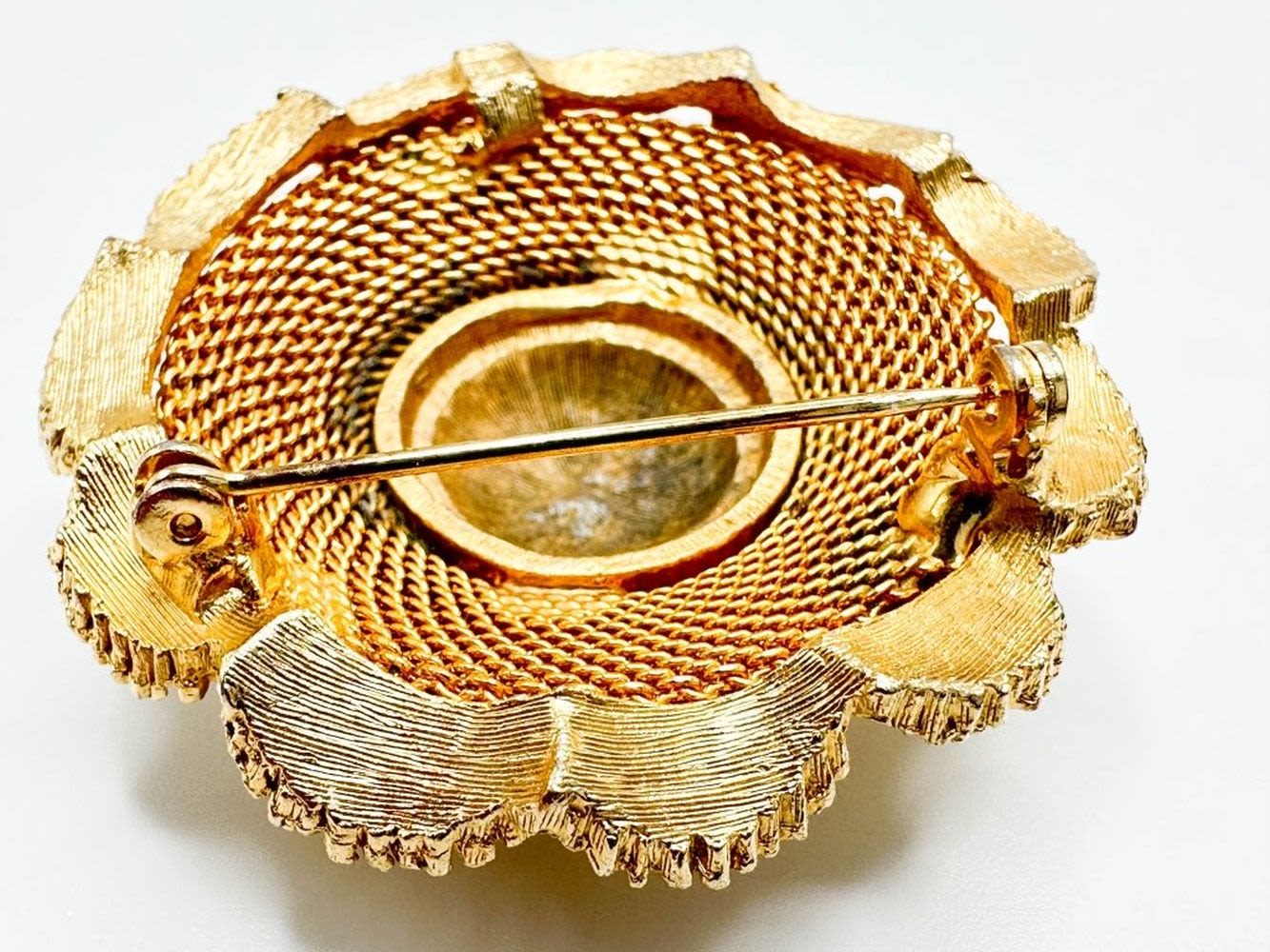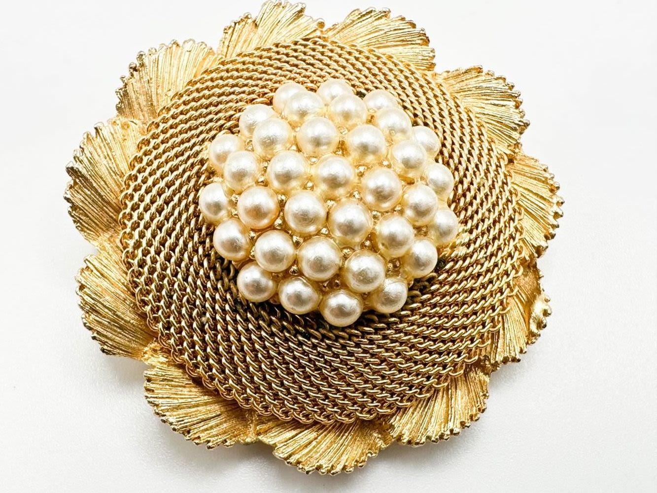 VINTAGE BROCH WITH FAUX PEARL AND FOIL CENTER SETTINGS
