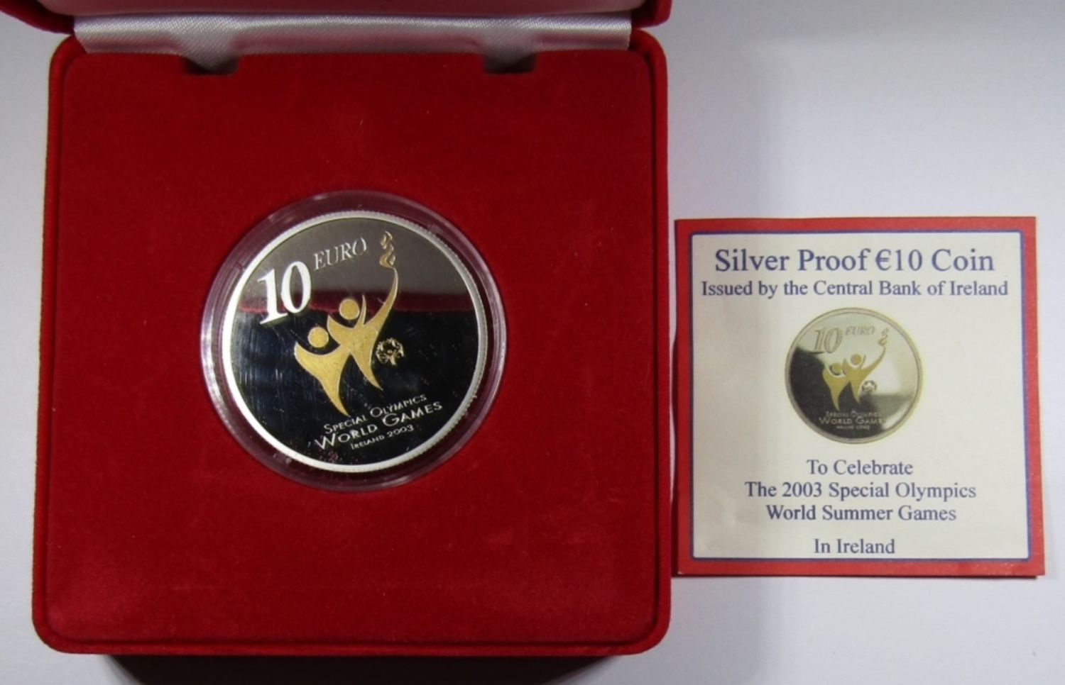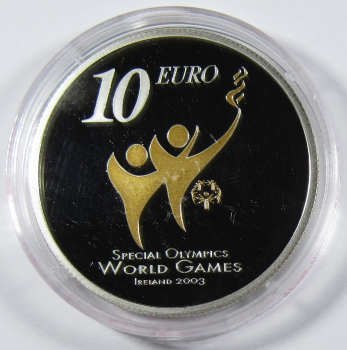 STERLING SILVER 10 EURO WITH GOLD DETAIL, SPECIAL OLYMPICS WORLD SUMMER GAMES, IN BOX WITH COA