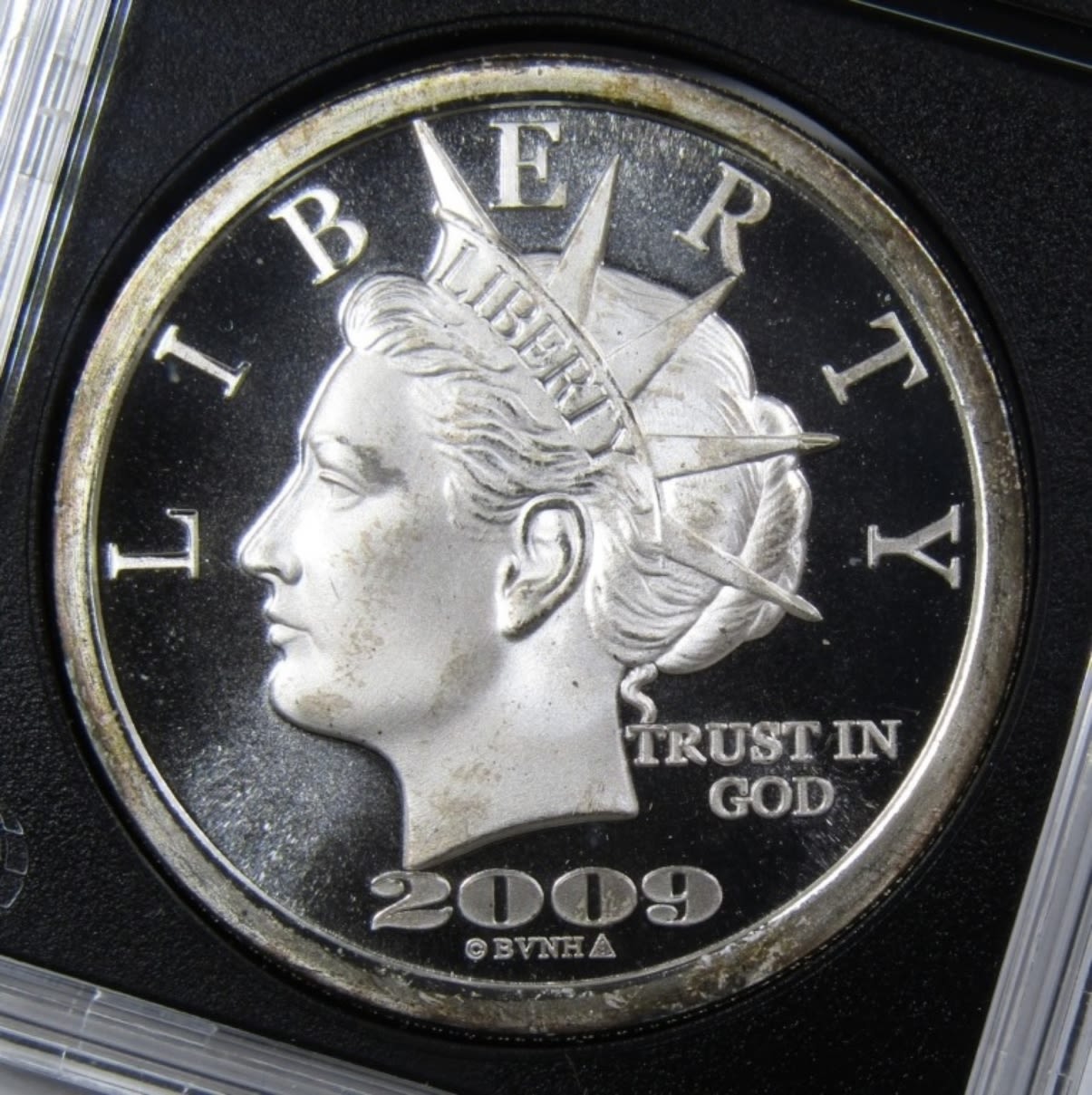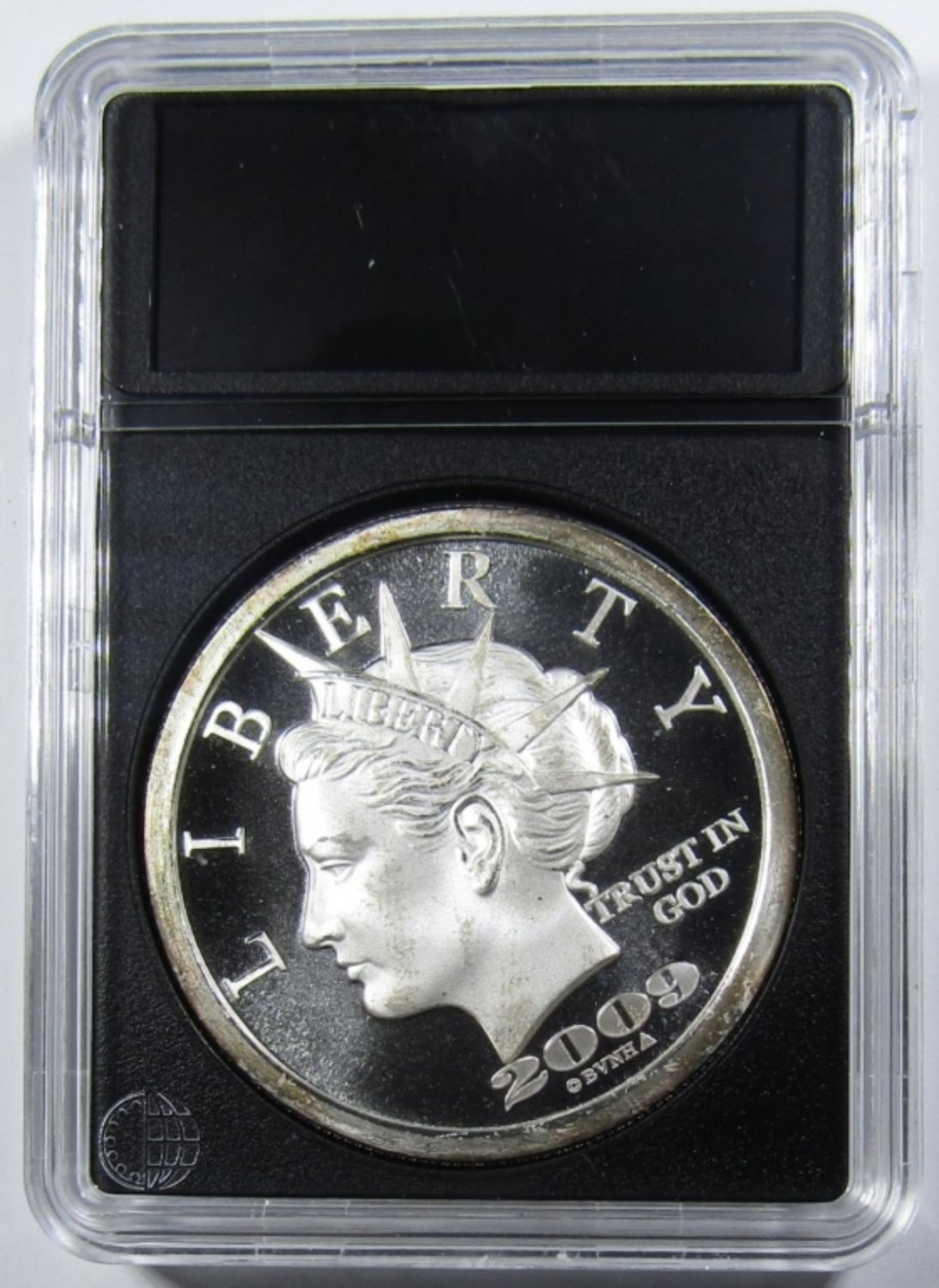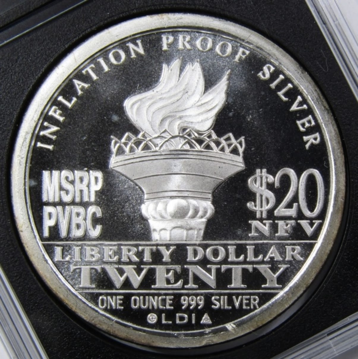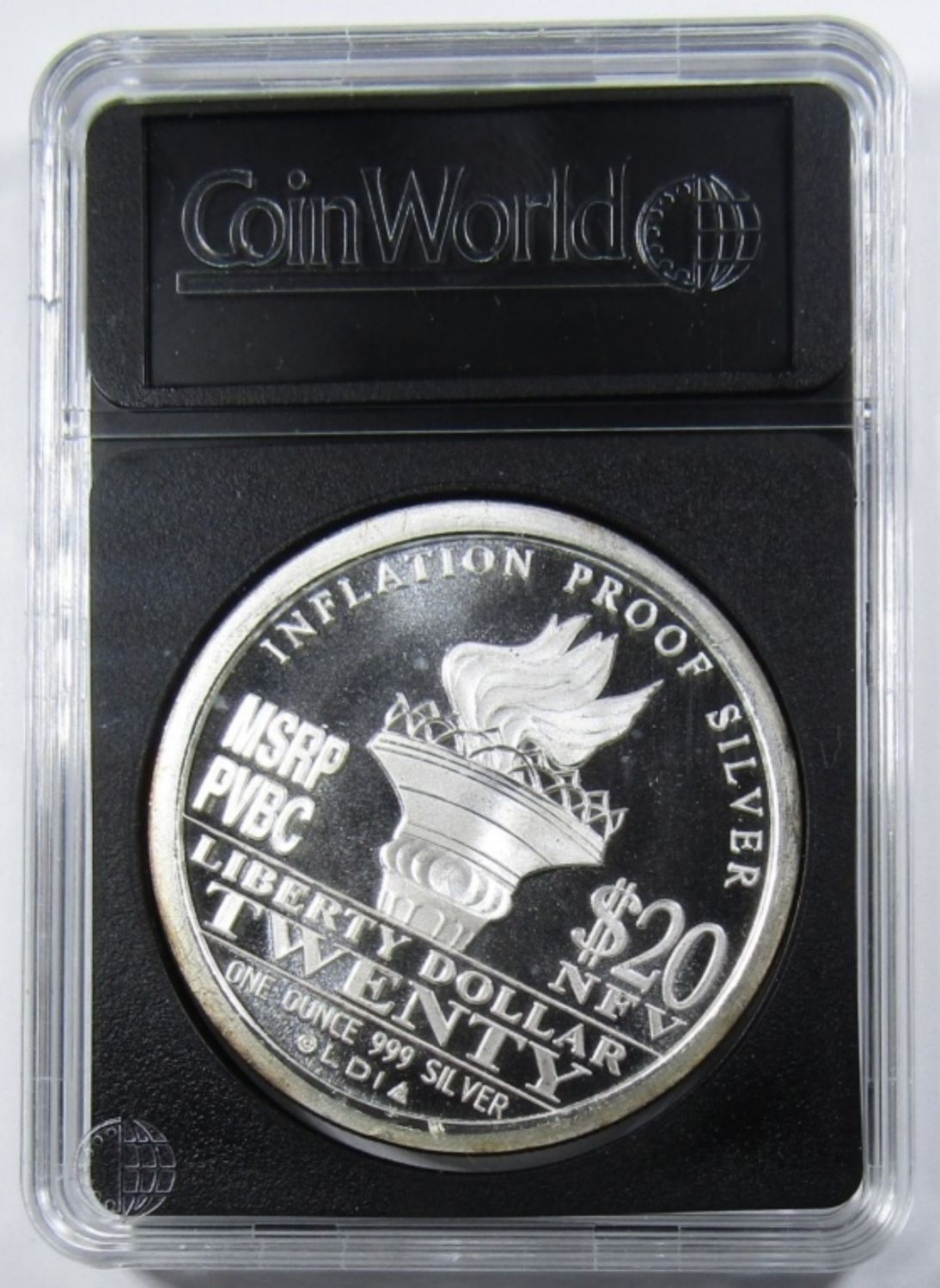 “$20 LIBERTY DOLLAR” SILVER ROUND IN PLASTIC SLAB.