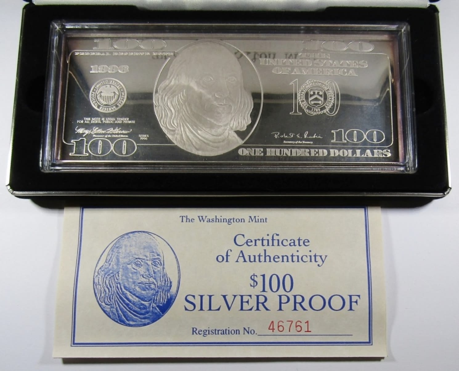 QUARTER-POUND SILVER PROOF, THE WASHINGTON MINT, IN BOX WITH COA.