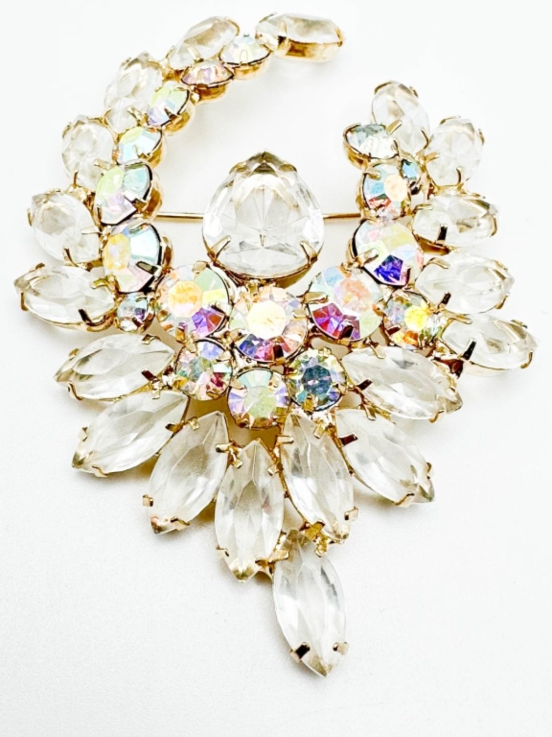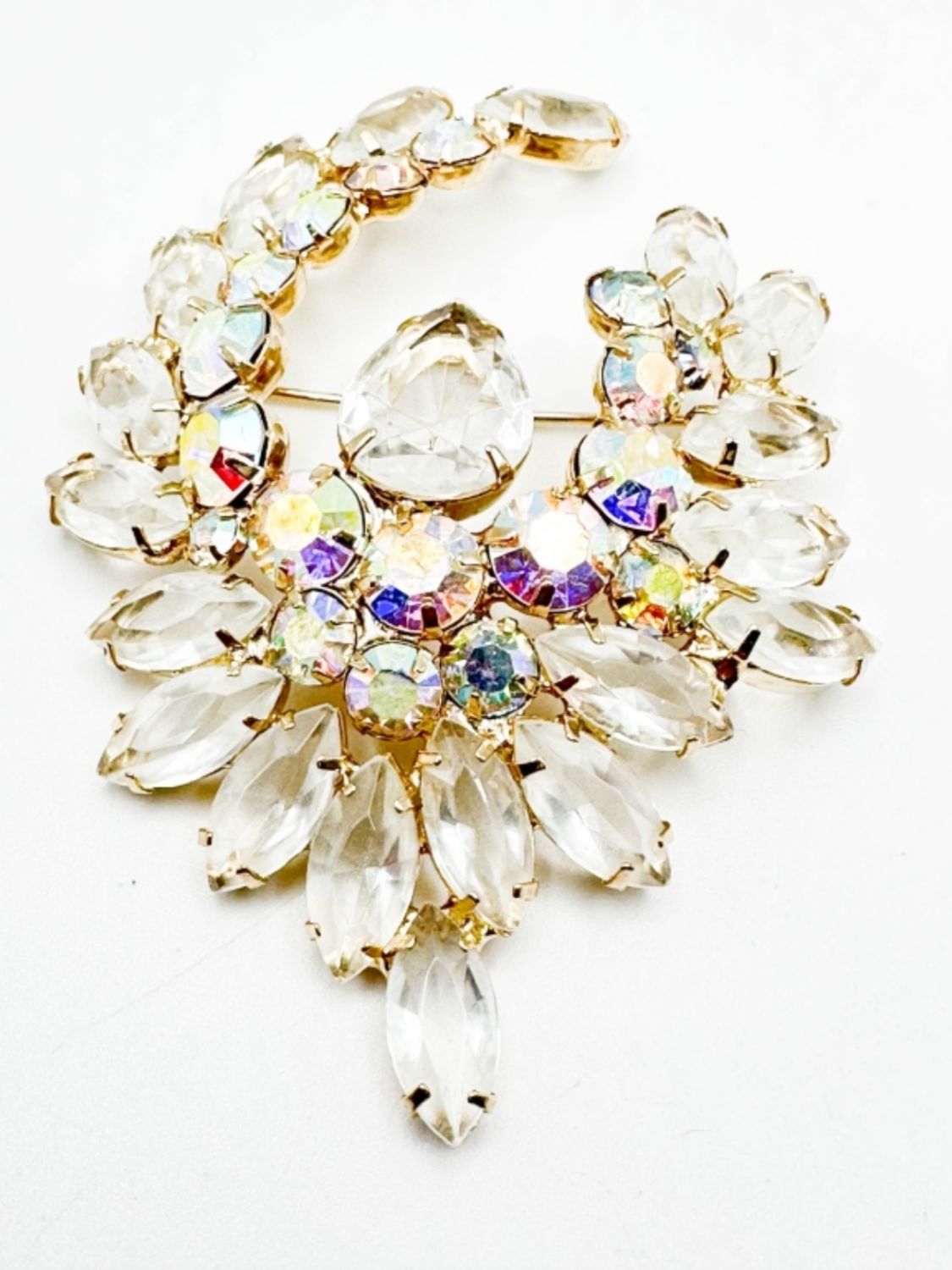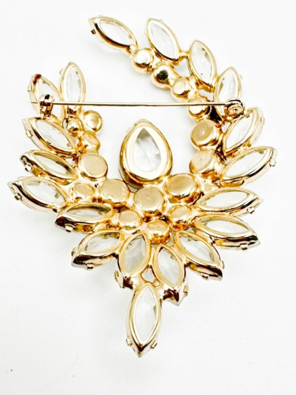 LARGE CLEAR FACETED STONE BROOCH WITH LARGE CENTER DROP STONE , SEE THRU FRONT TO BACK STONES