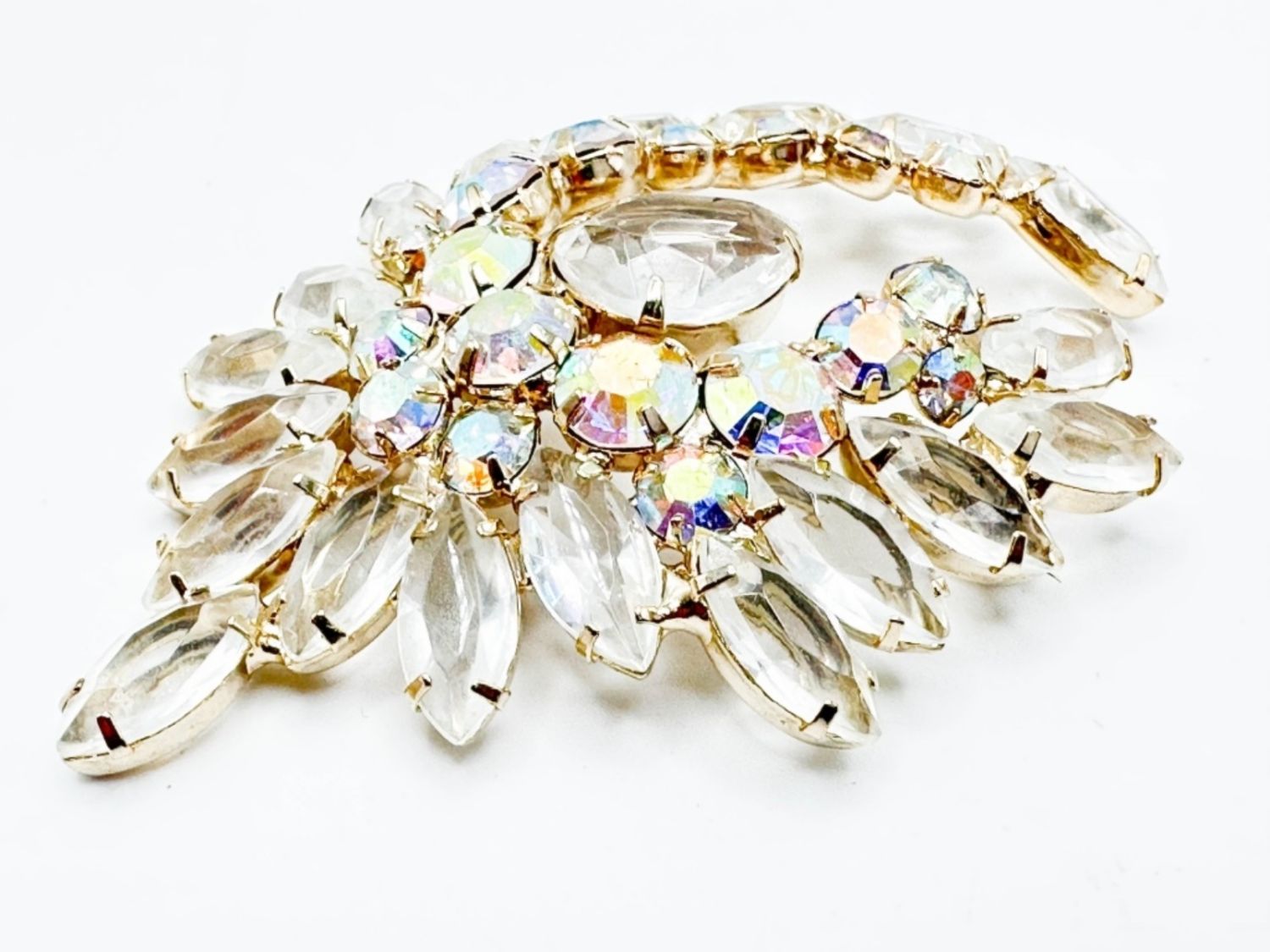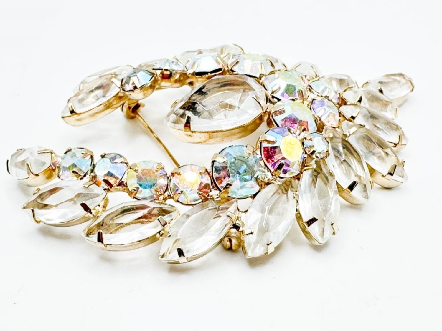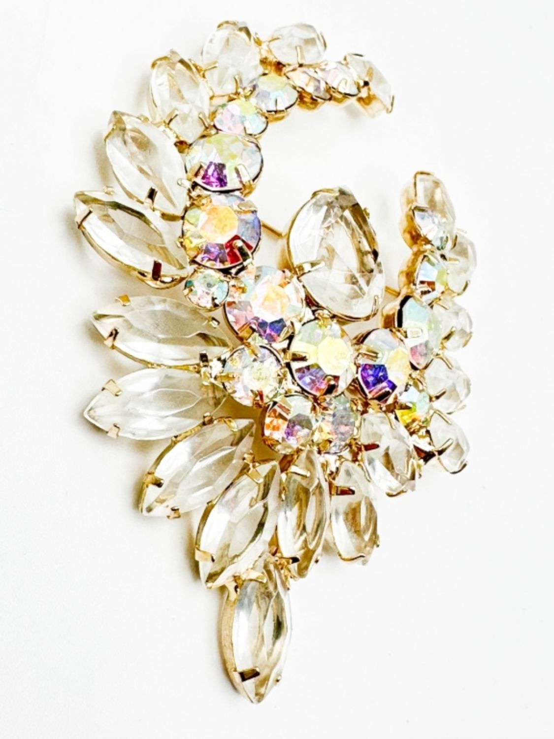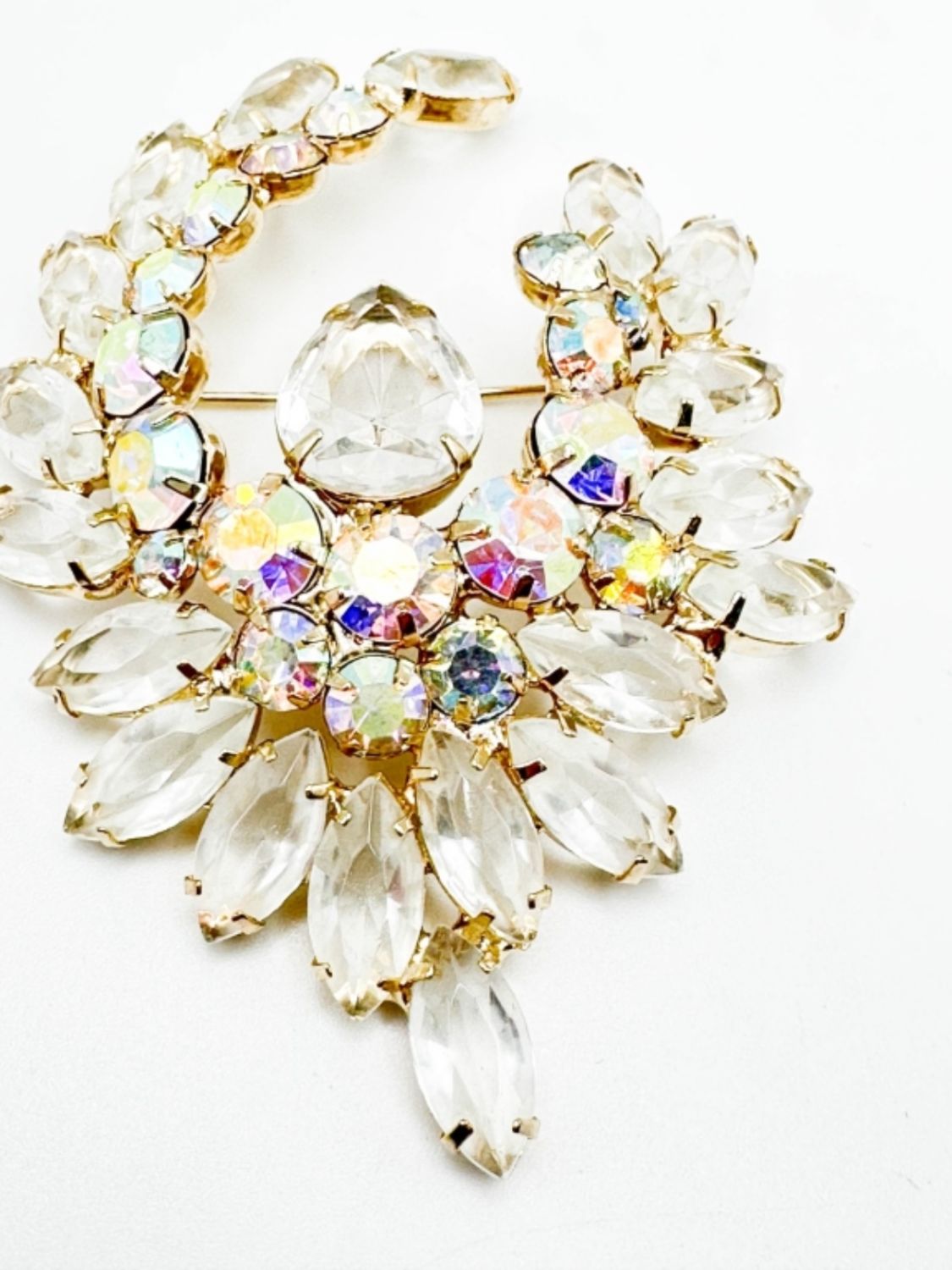 LARGE CLEAR FACETED STONE BROOCH WITH LARGE CENTER DROP STONE , SEE THRU FRONT TO BACK STONES