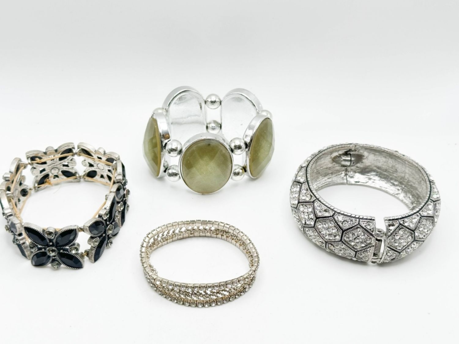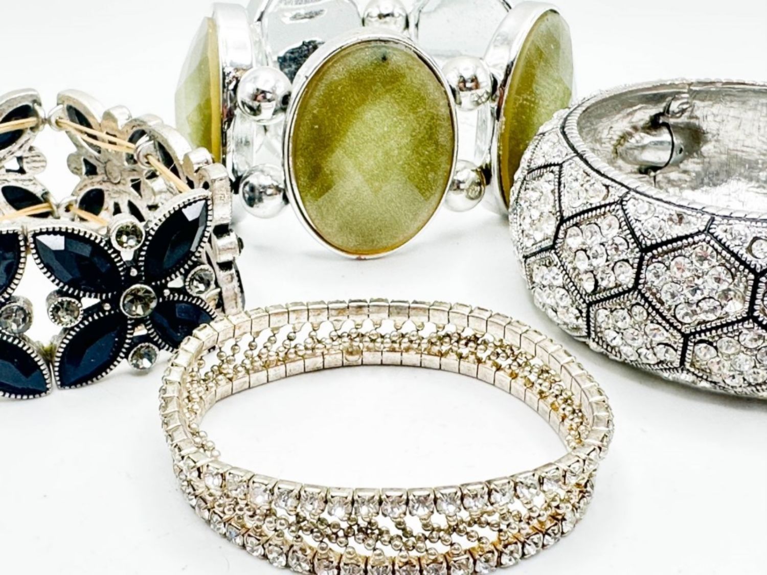 LARGE BRACELETS WITH GREEN STONE, RHINSTONES, BLACK STONES AND MORE