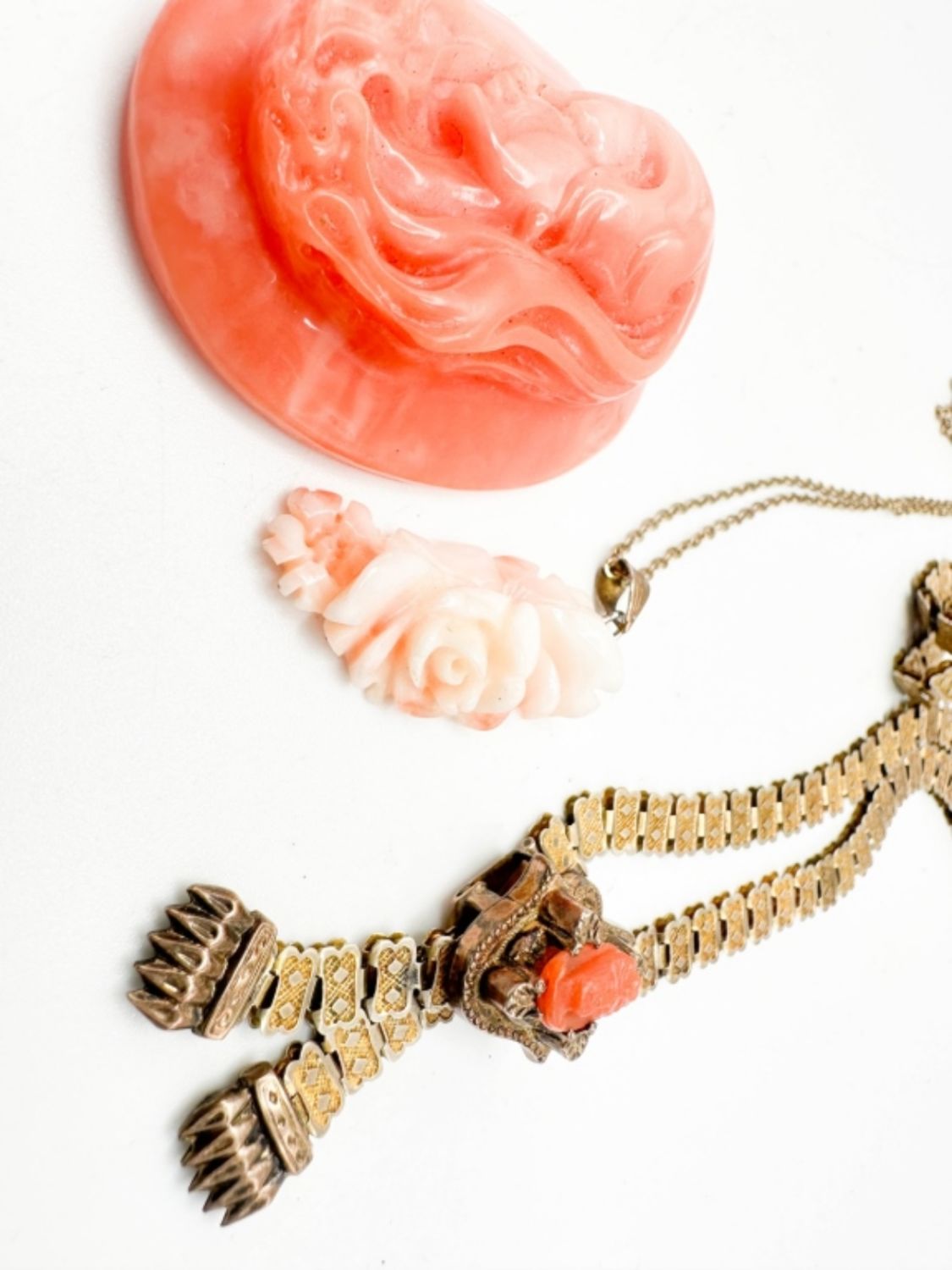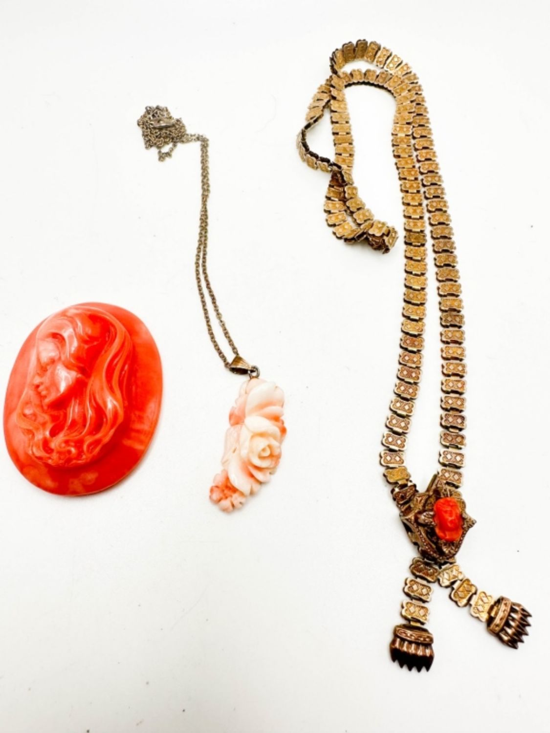 ANTIQUE? NECKLACE WITH CORAL COLOR STONE, OTHER COLOR COLOR NECKLACE AND OTHR CORAL CAMEO STONE