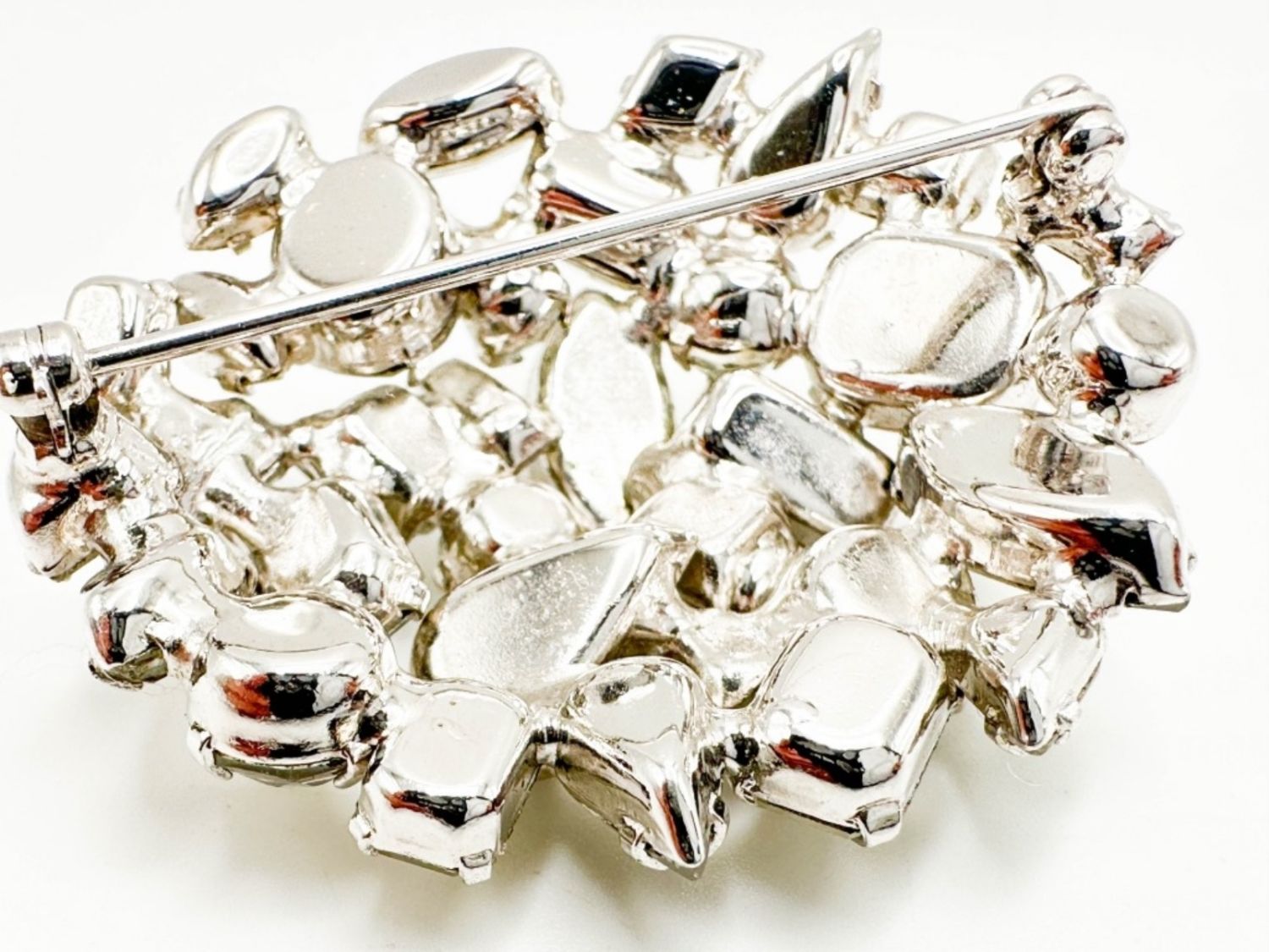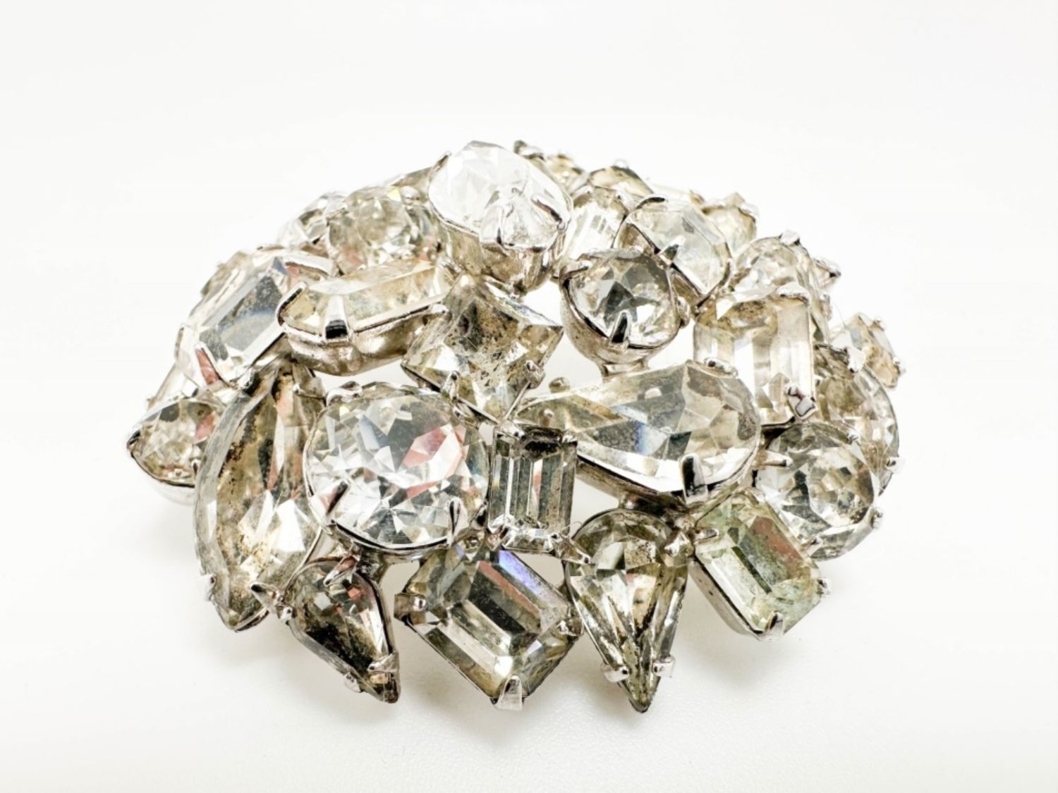 LARGE CLEAR STONE DOME BROOCH IN SILVER TONES