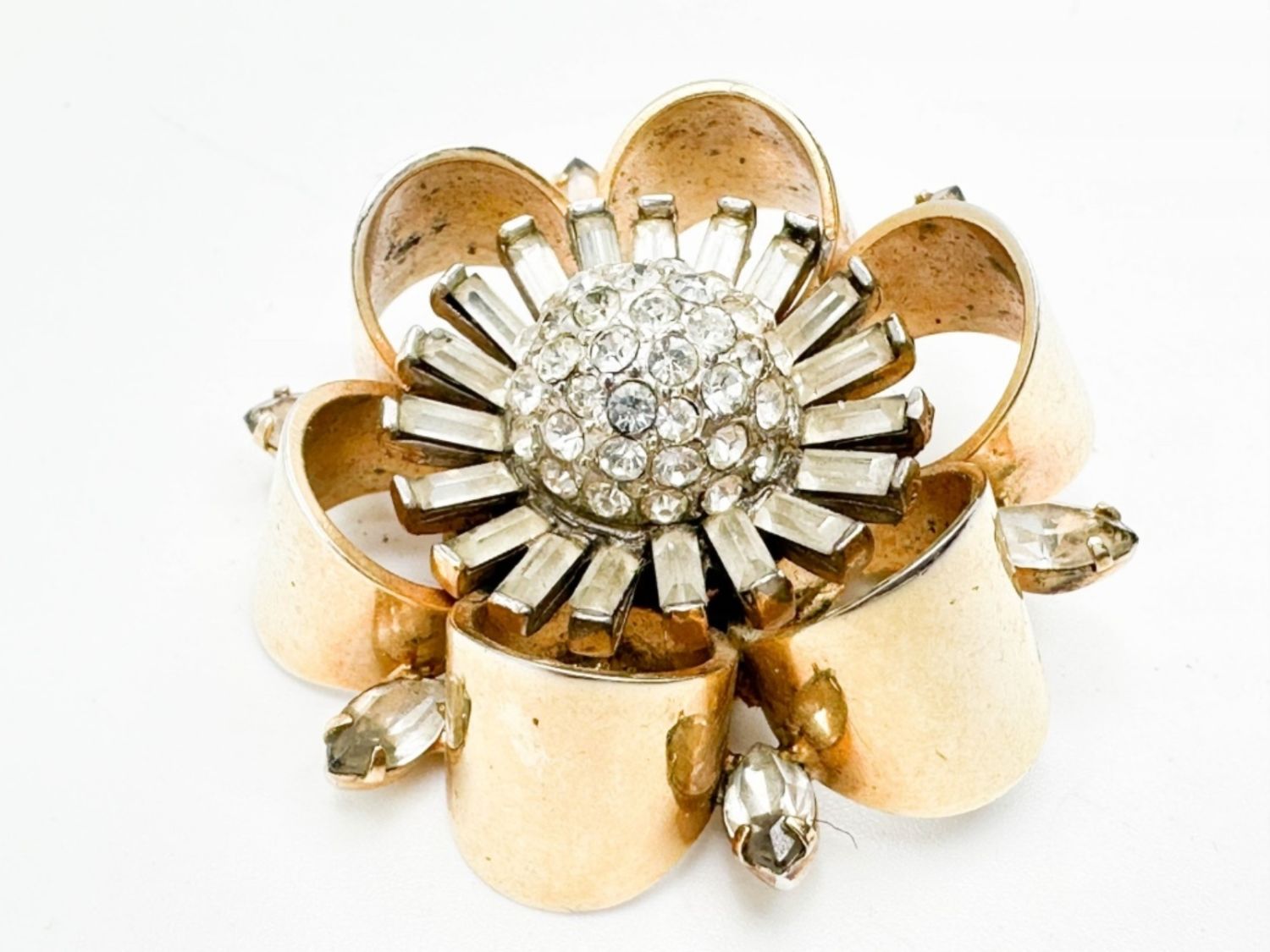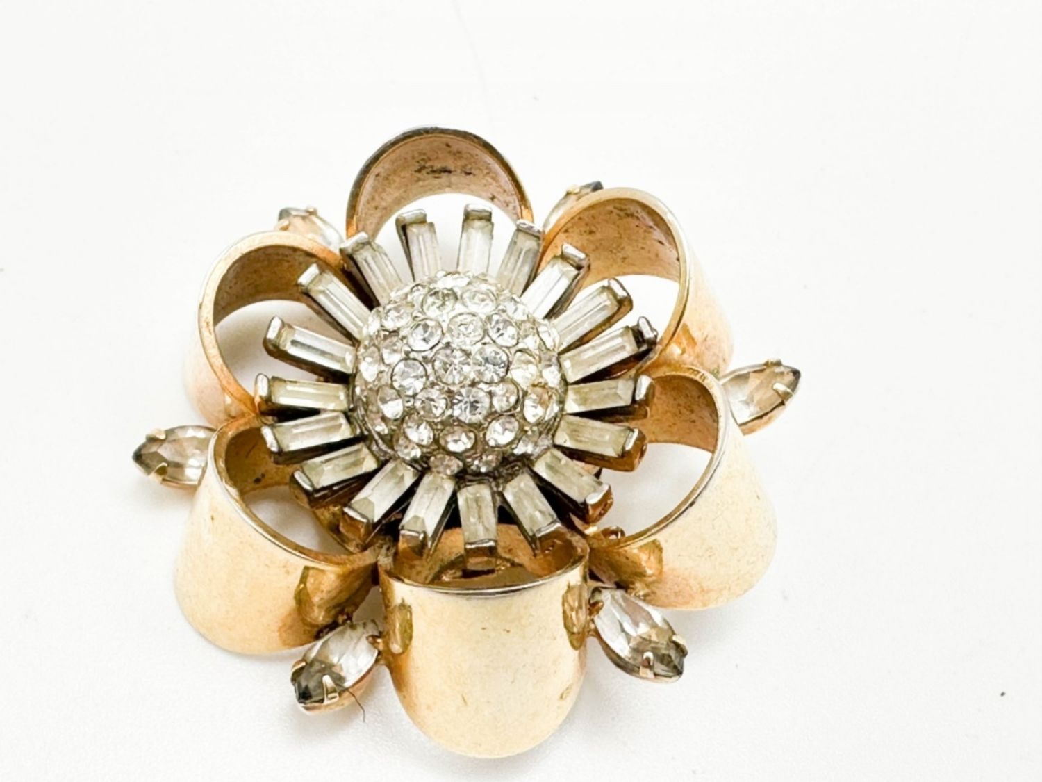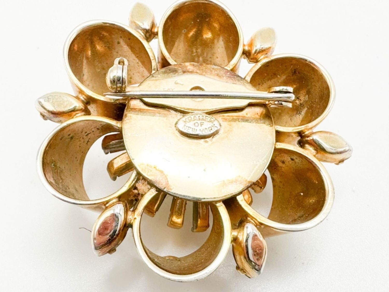KRAMER OF NEW YORK SIGNED BROOCH WITH STONES ON GOLD TONE, VINTAGE SIGNED KRAMER