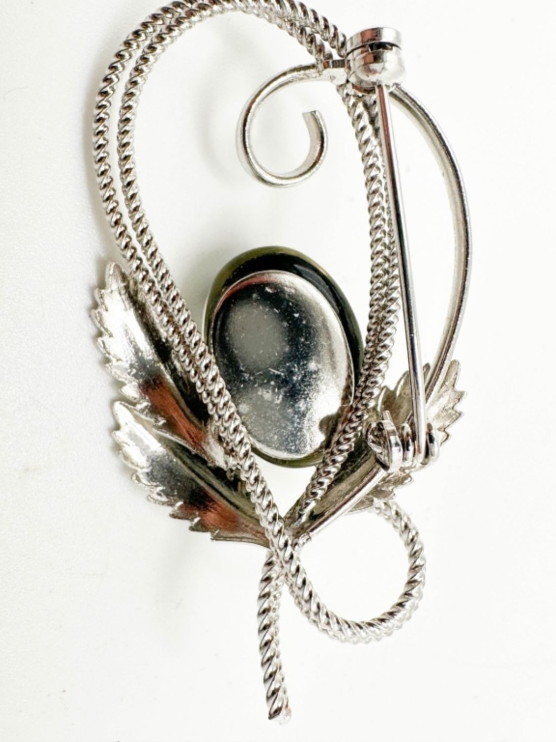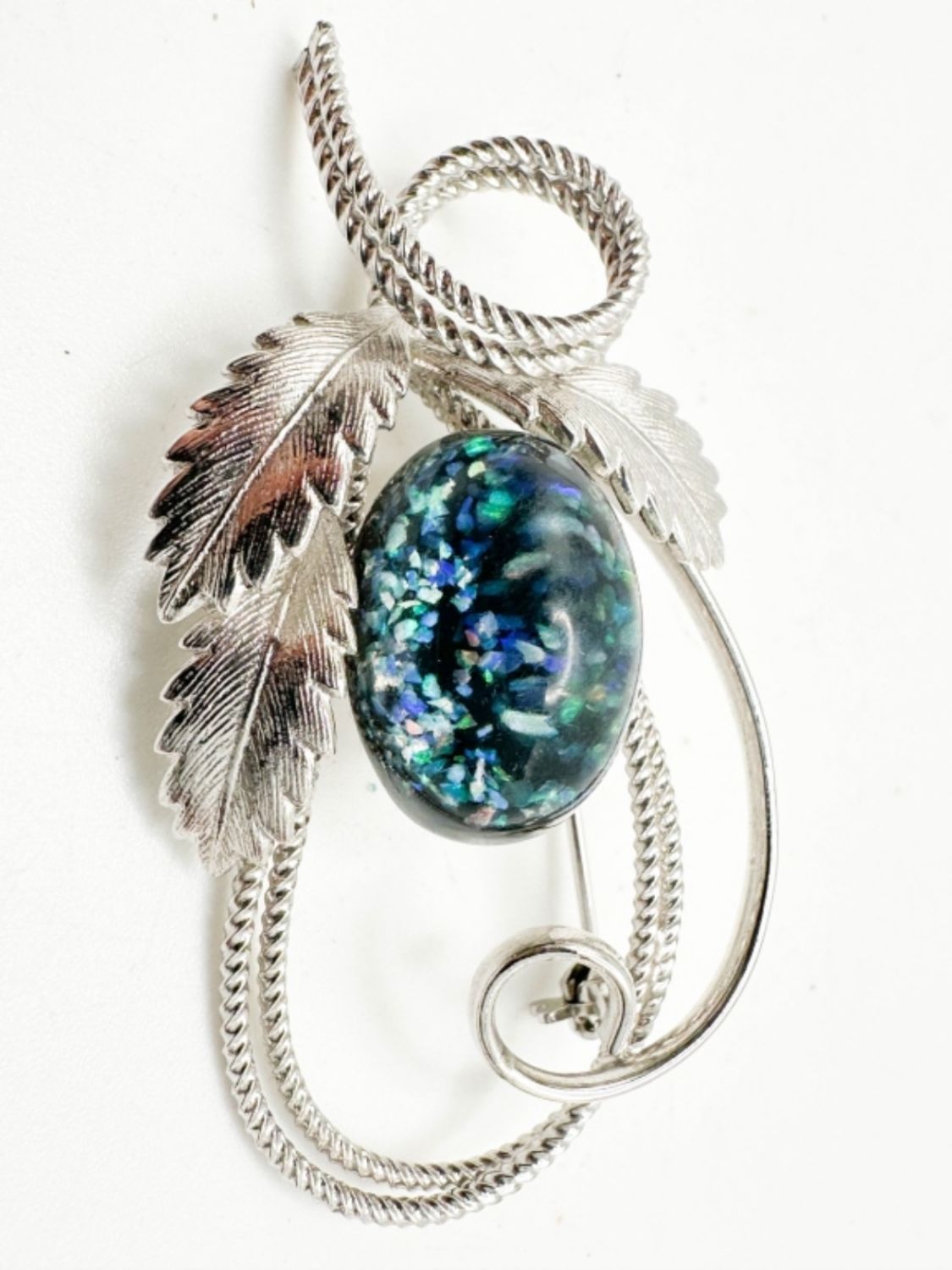 LARGE BLUES STONE SWIRL AND LEAF BROOCH ON SILVER TONE