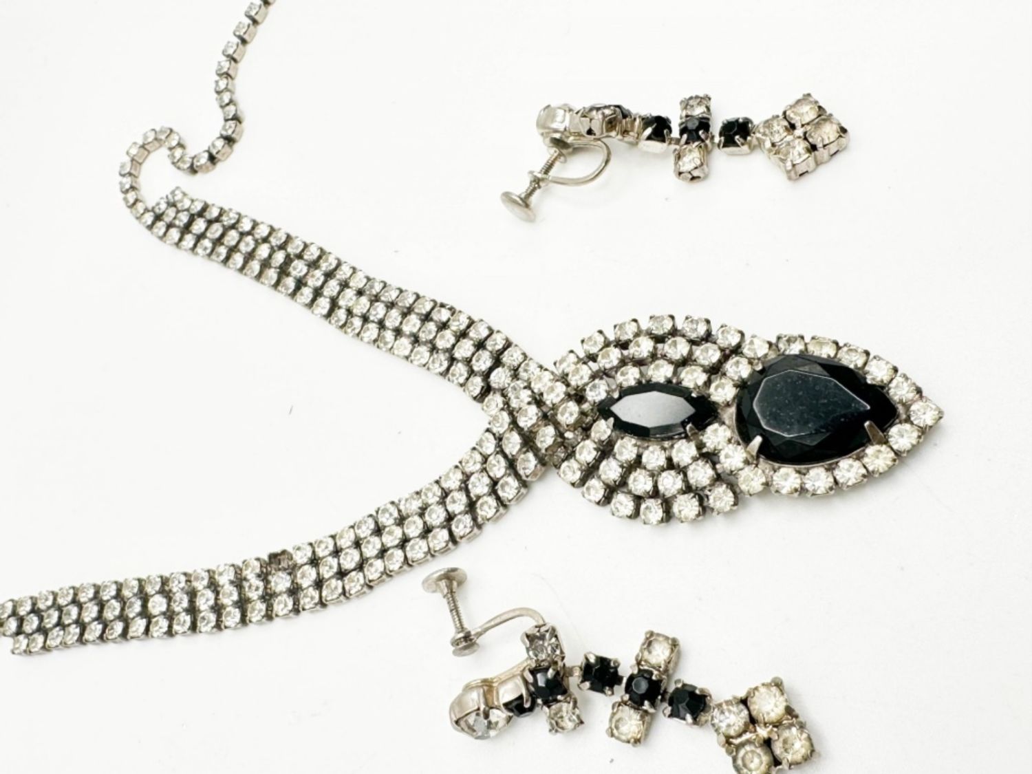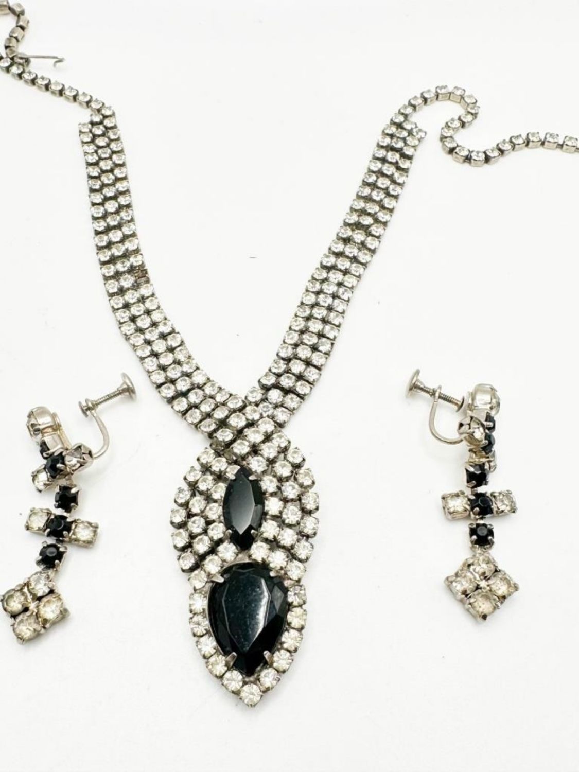 BLACK NECKLACE , WITH BLACK PENDANT AND STONES, MISSING ONE STONE AND BLACK AND CLEAR STONE EARRINGS