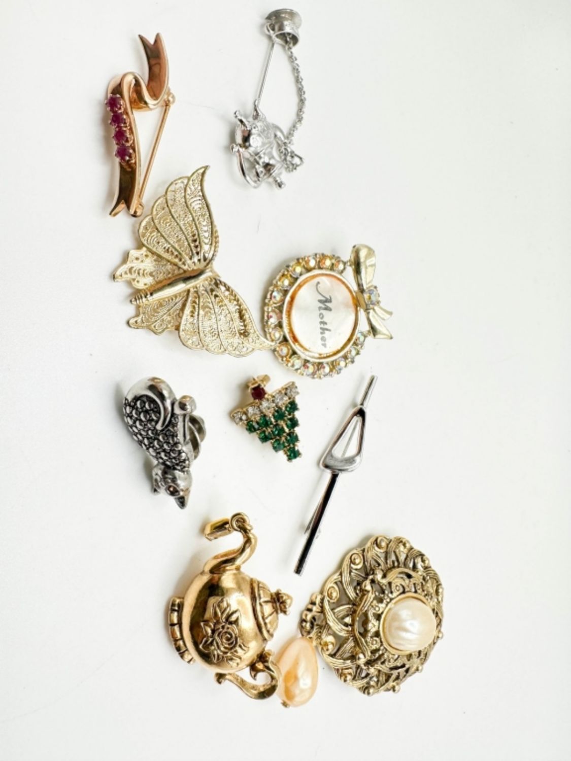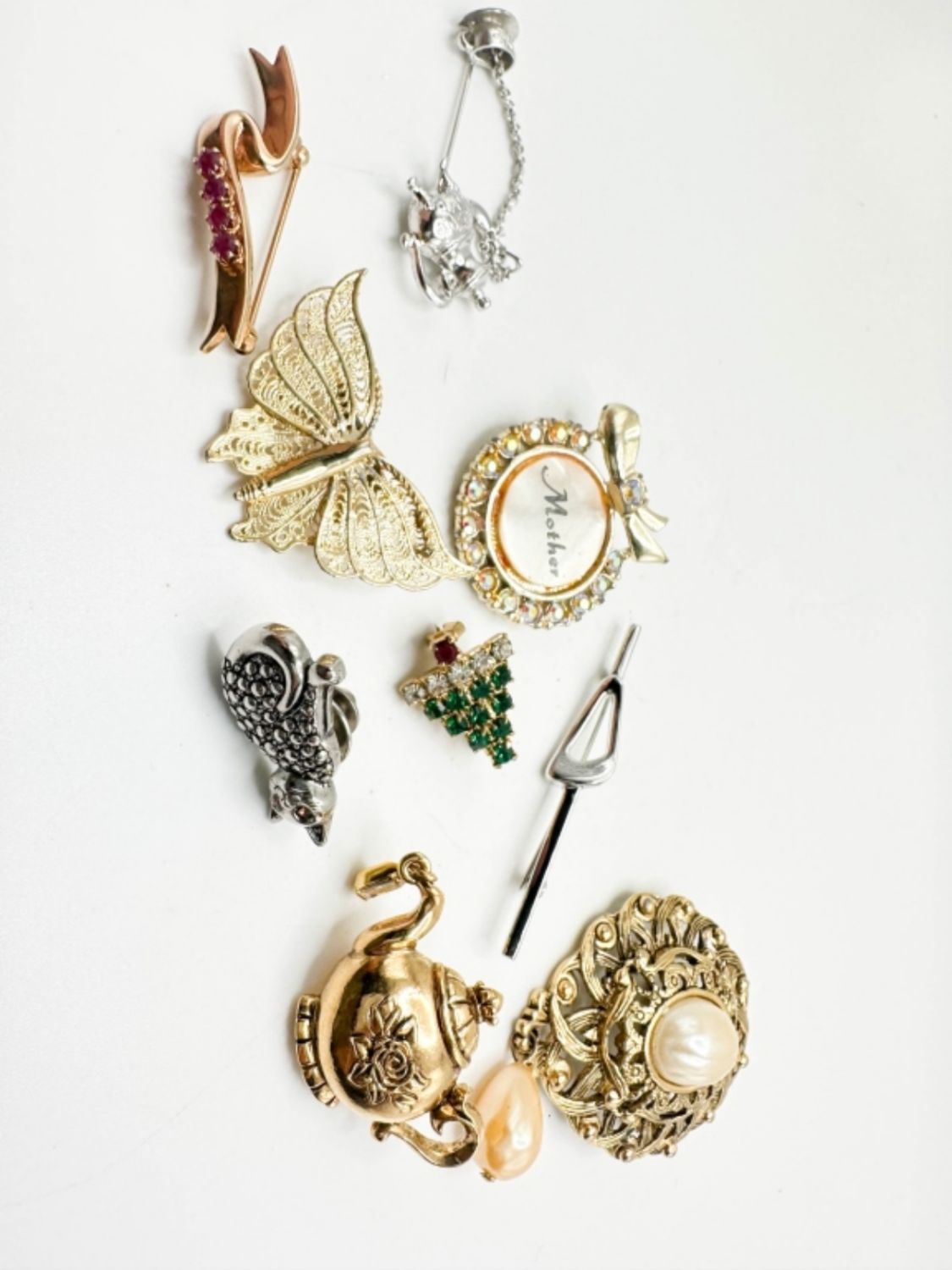 BROOCH ASSORTMENT, BUTTERFLY, TEA POT, BOW AND MORE
