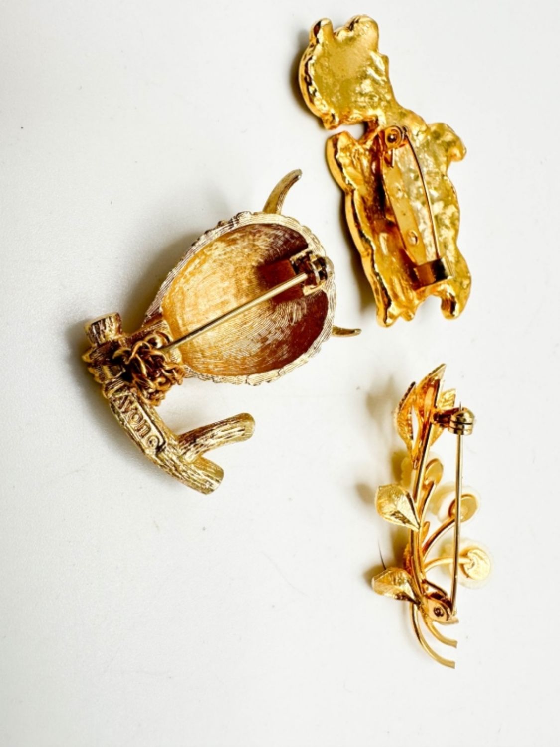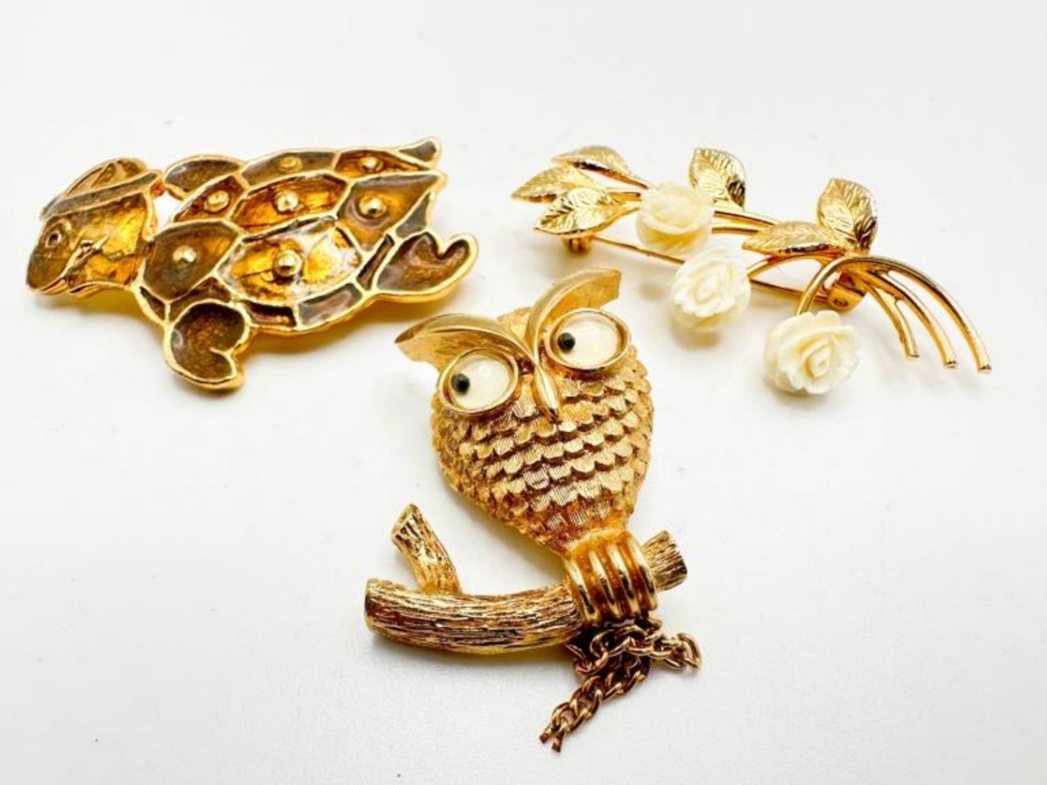 AVON OWL BROOCH WITH MOVING EYES AND TURTLE BROOCH AND CARVED FLOWER BROOCH