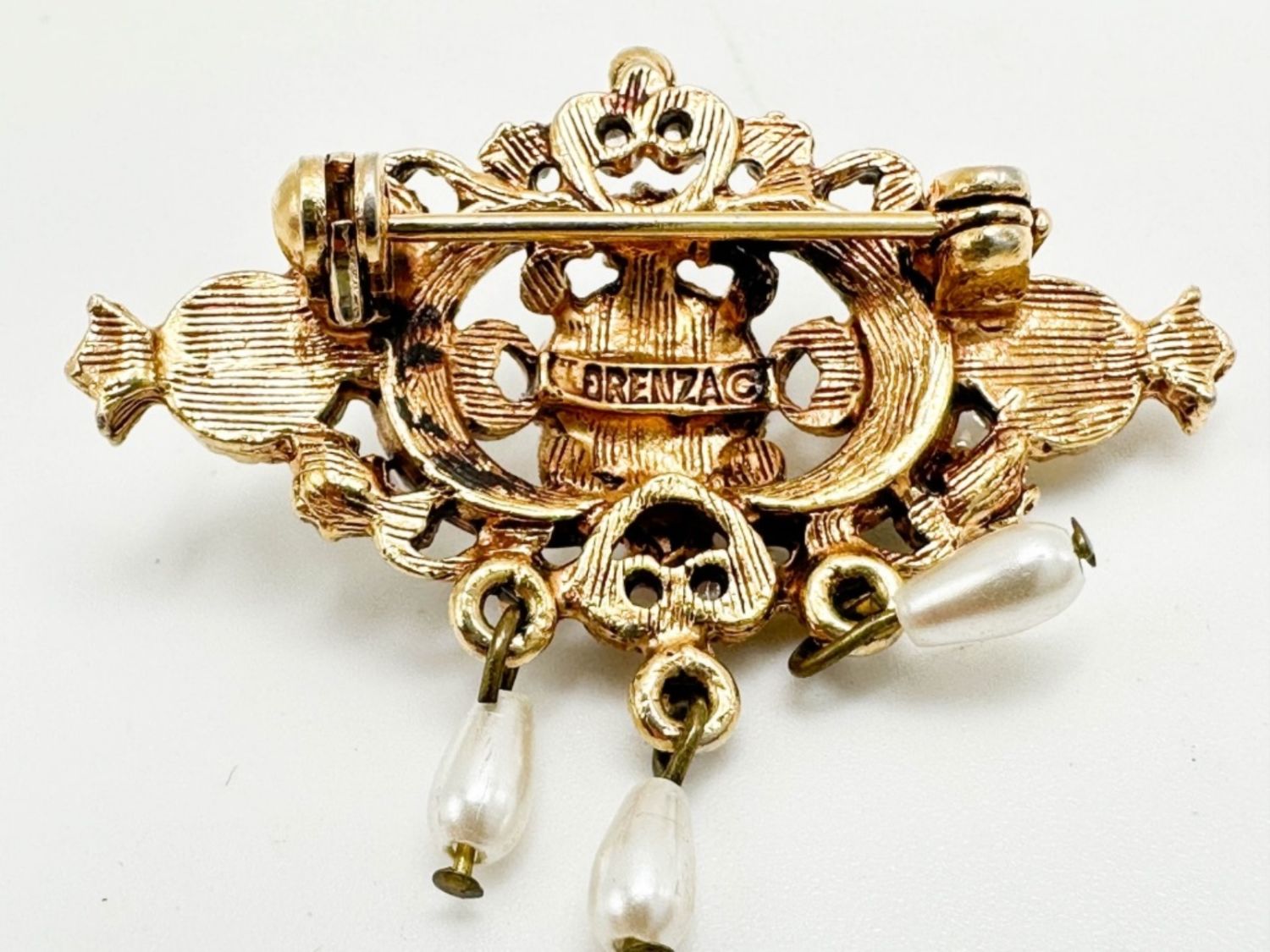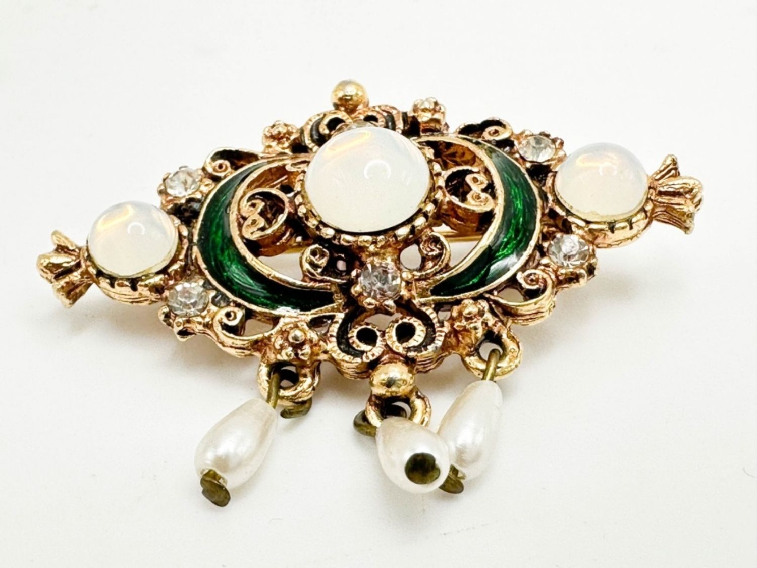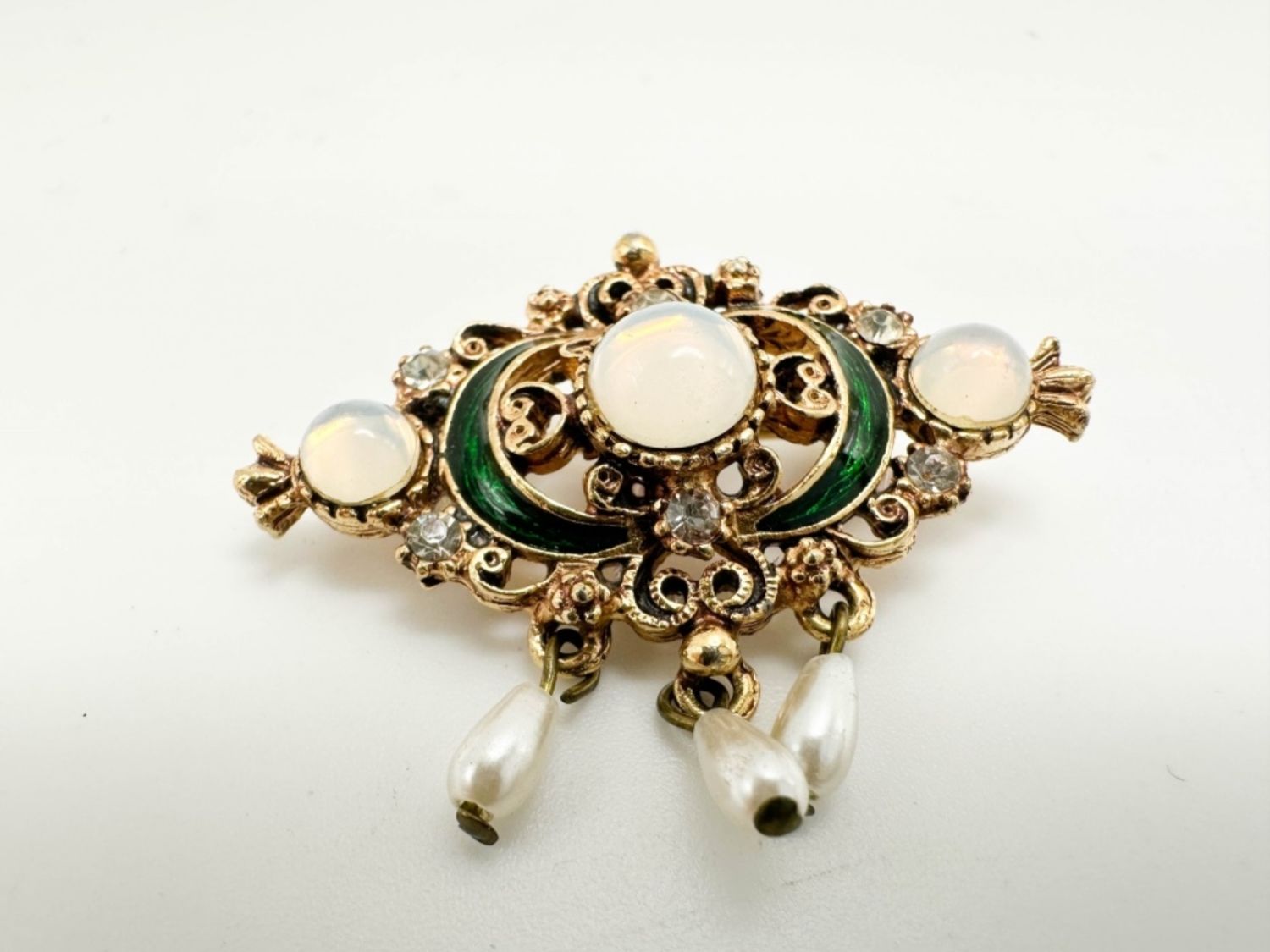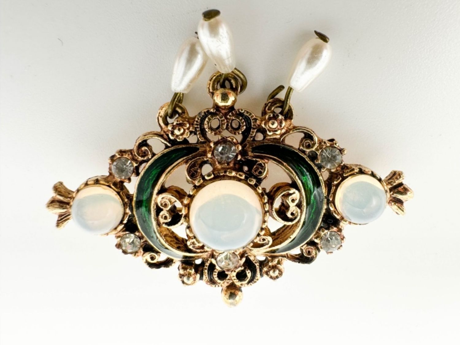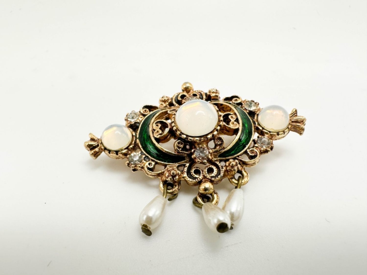 FLORENZA SIGNED BROOCH WITH TRIPLE DROP FAUX PEARLS AND STONE , SIGNED FLORENZA