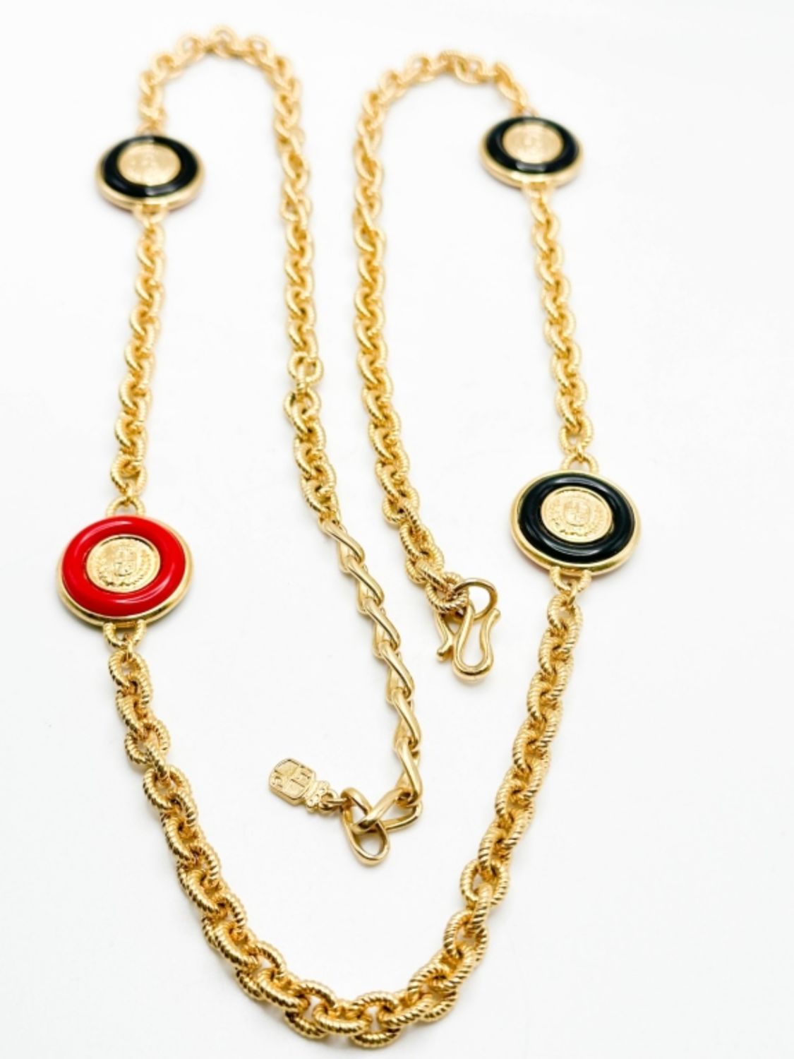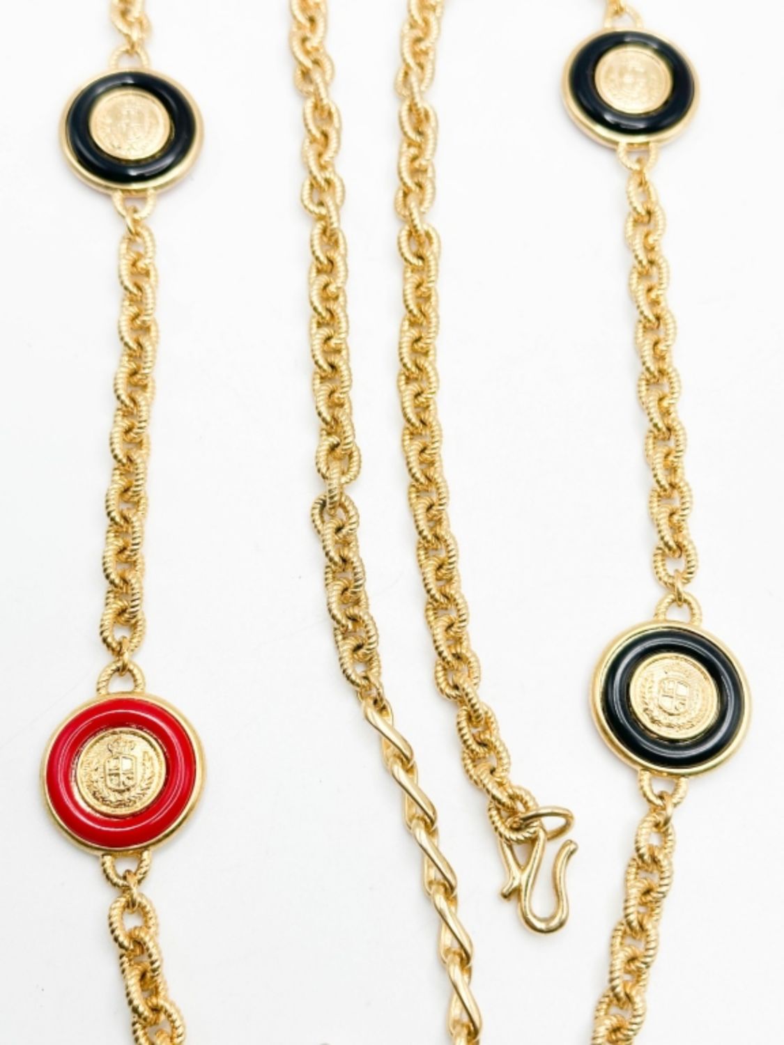 LIZ CLARIBRONE SIGNED CROWNS NECKLACE IN RED AND BLUE WITH GOLD TONE NECKLACE