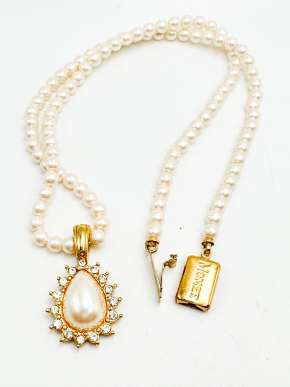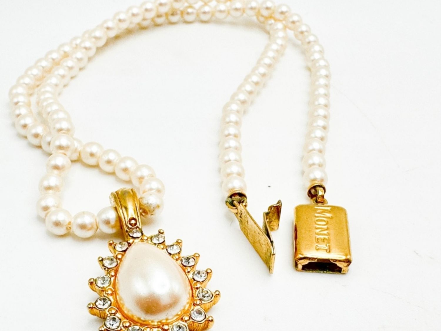 MONET PENDANT NECKLACE , VINTAGE MONET WITH STONE SURROUND ON FAUX PEARLS NECKLACE , SIGNED MONET