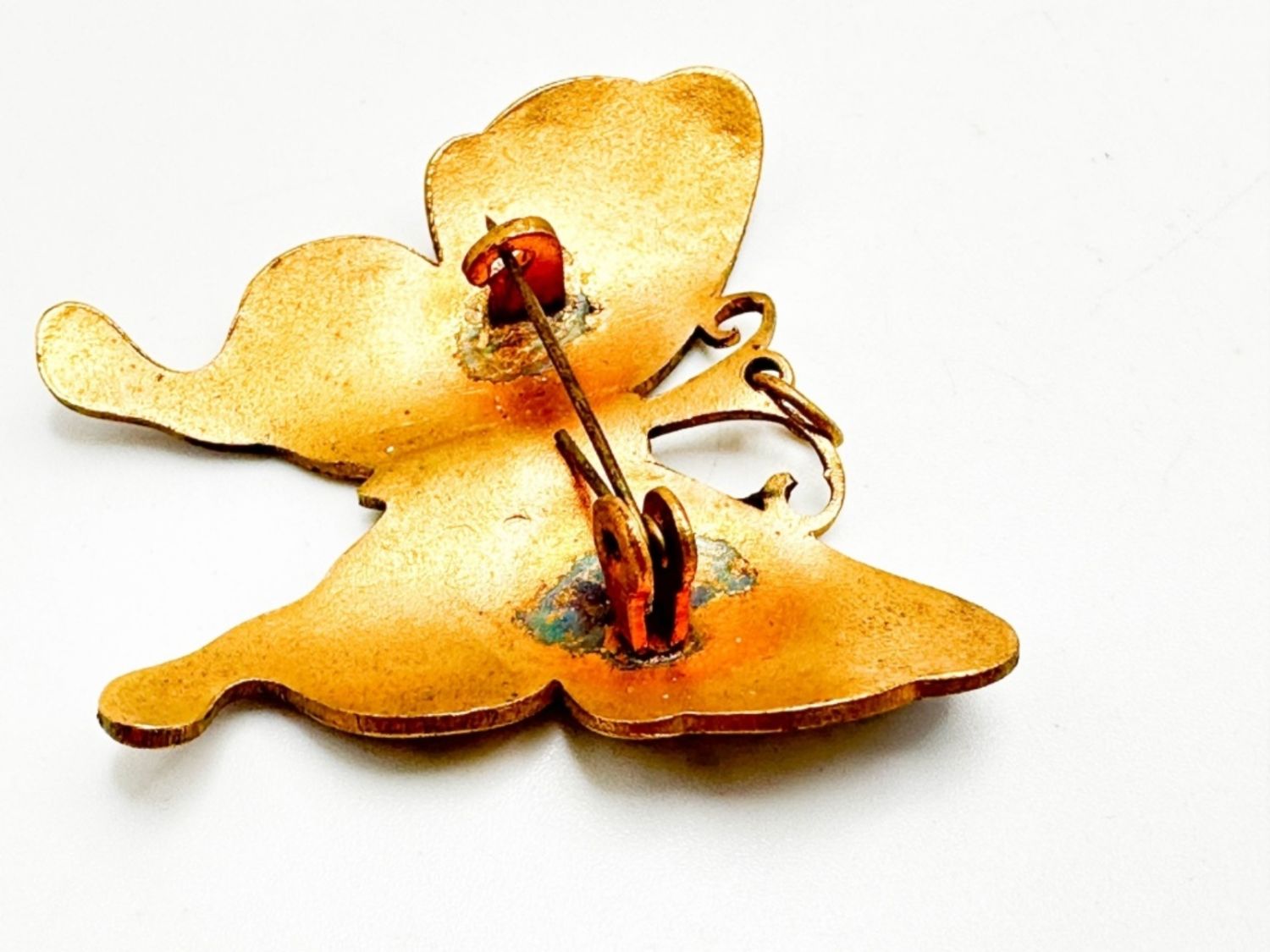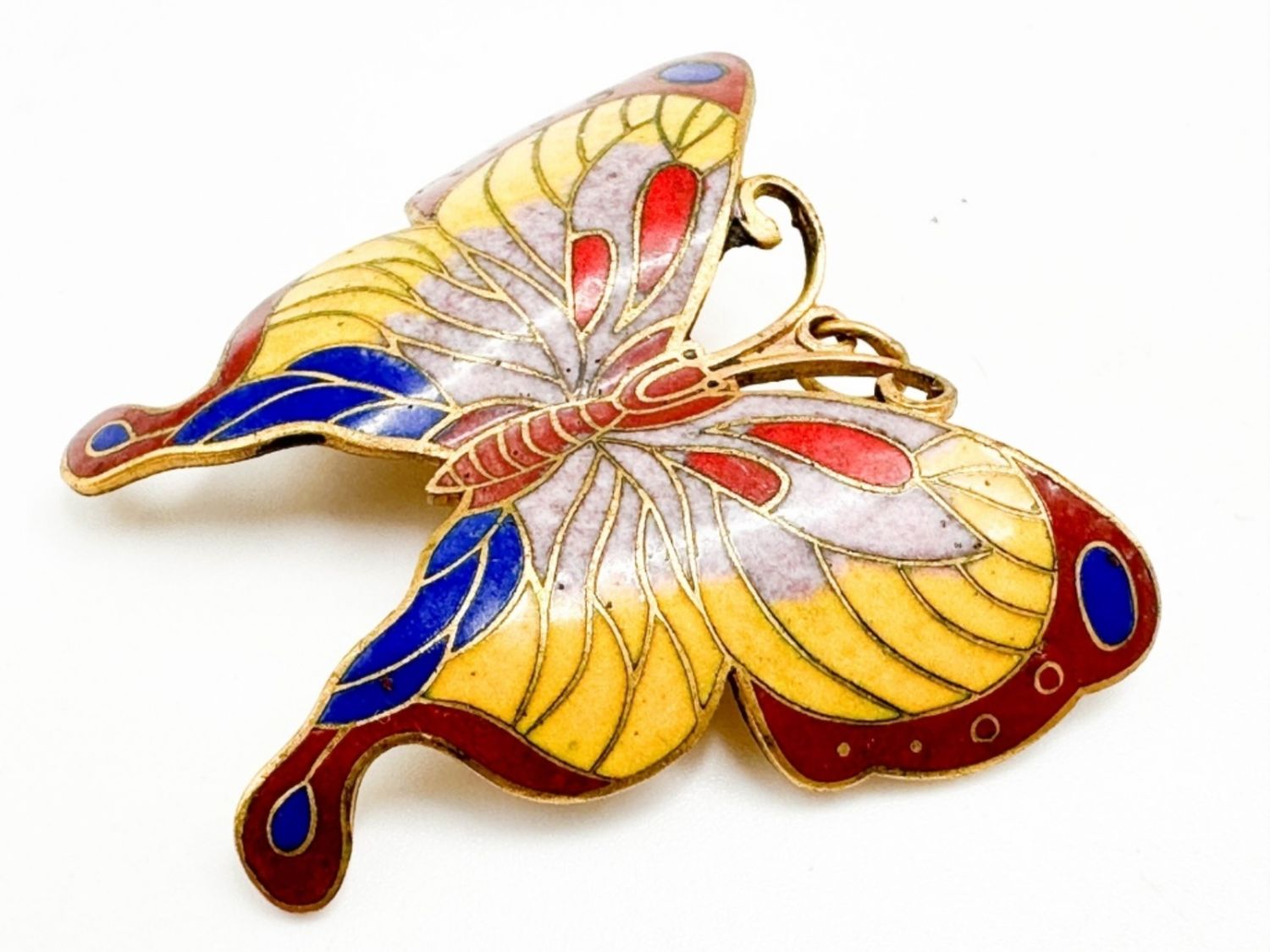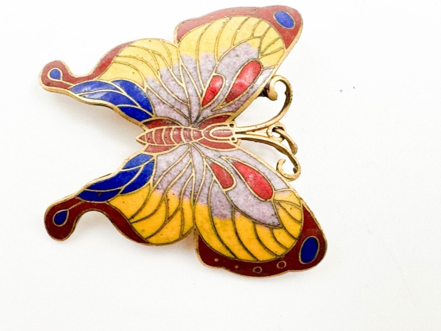 ANTIQUE? C CLASP BUTTERFLY BROOCH WITH ELABORATE CLOISSONE STYLE PAINTING
