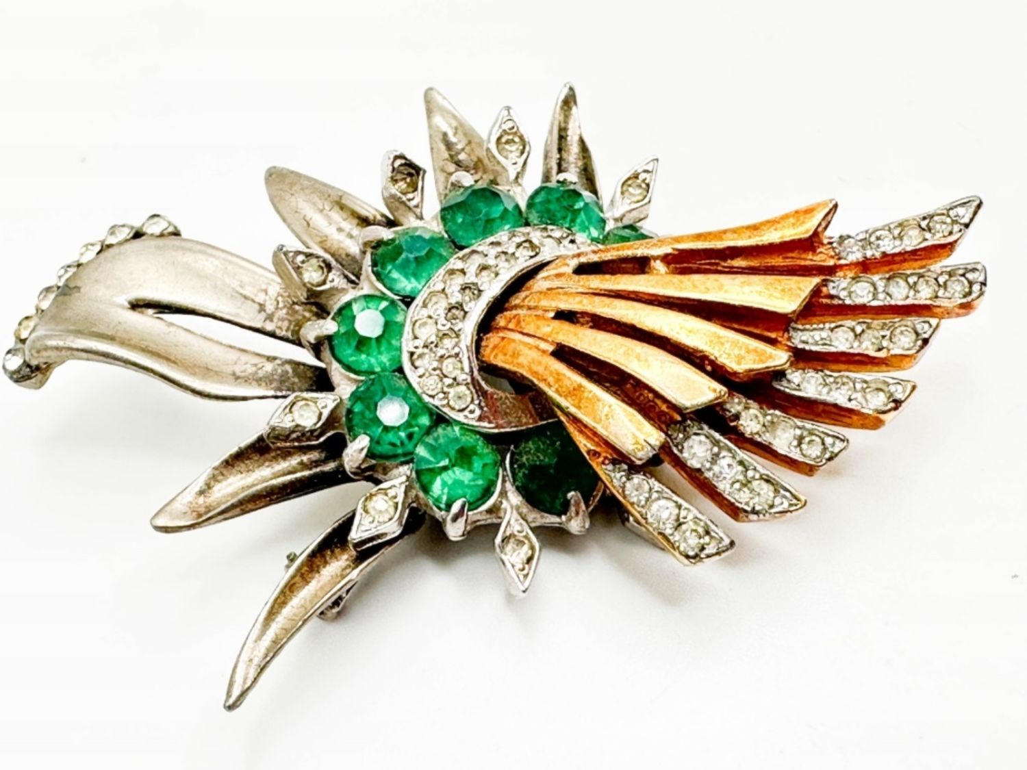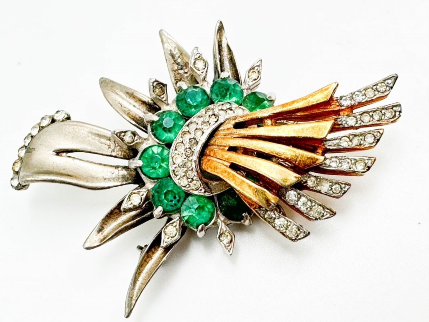 HEAVY TWO TONE SILVER AND GOLD TONE BROOCH WITH GREEN AND CLEAR STONES