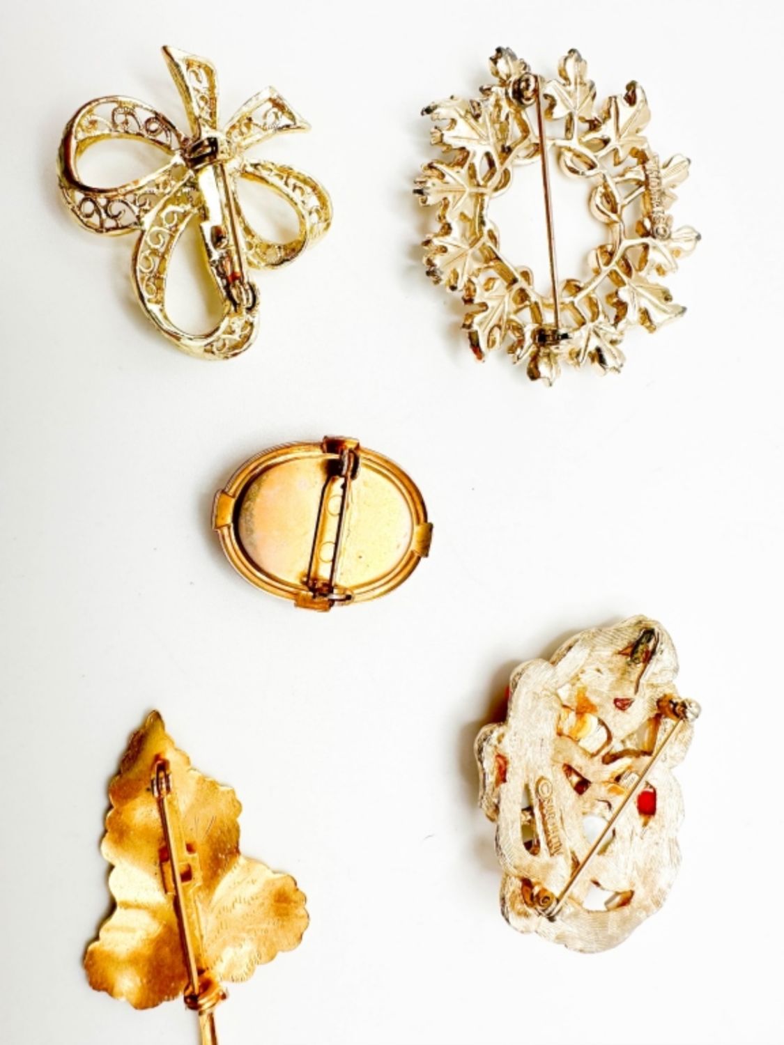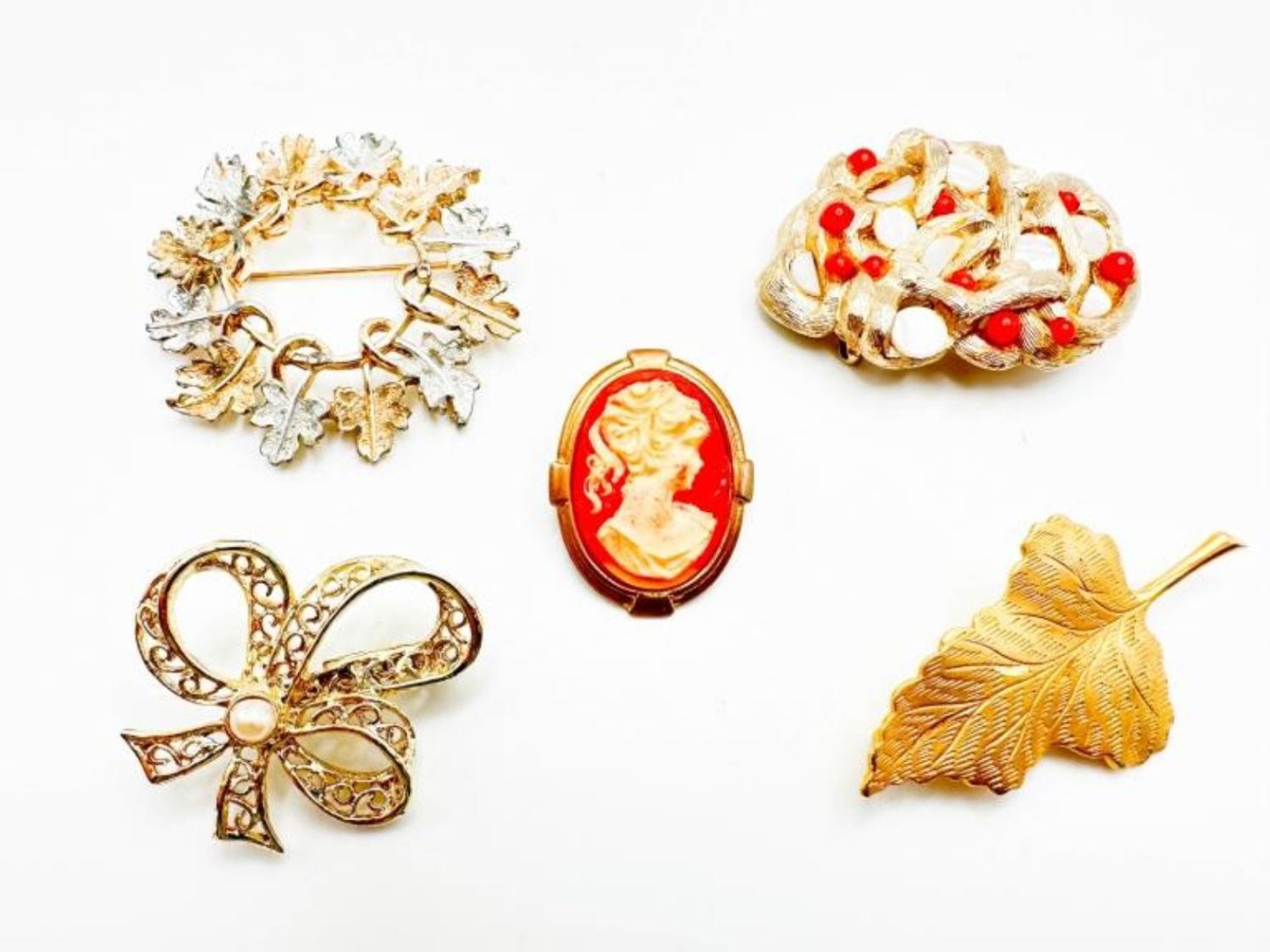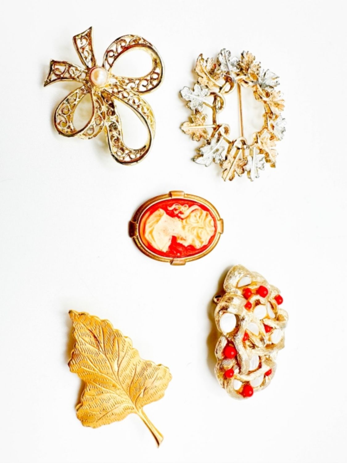 SARAH COVENTRY ORANGE STONE BROOCH, SARAH COVENTRY LEAF BROOCH AND OTHERS