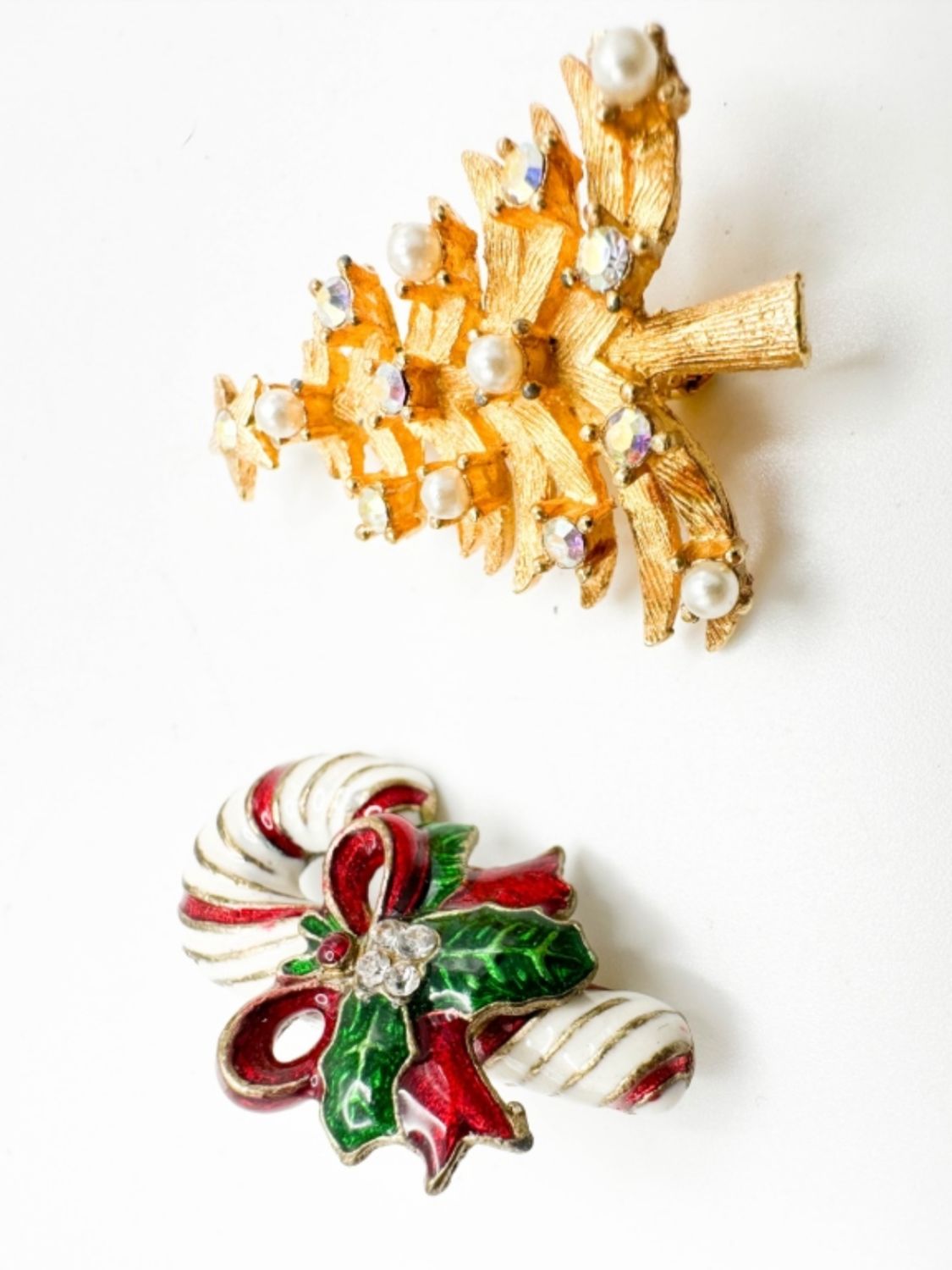 MYLO CHRISTMAS TREE BROOCH W FAUX PEARLS AND CLEAR STONE , + CANDY CANE BROOCH, ENAMEL PAINTED