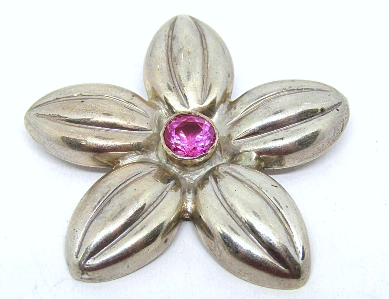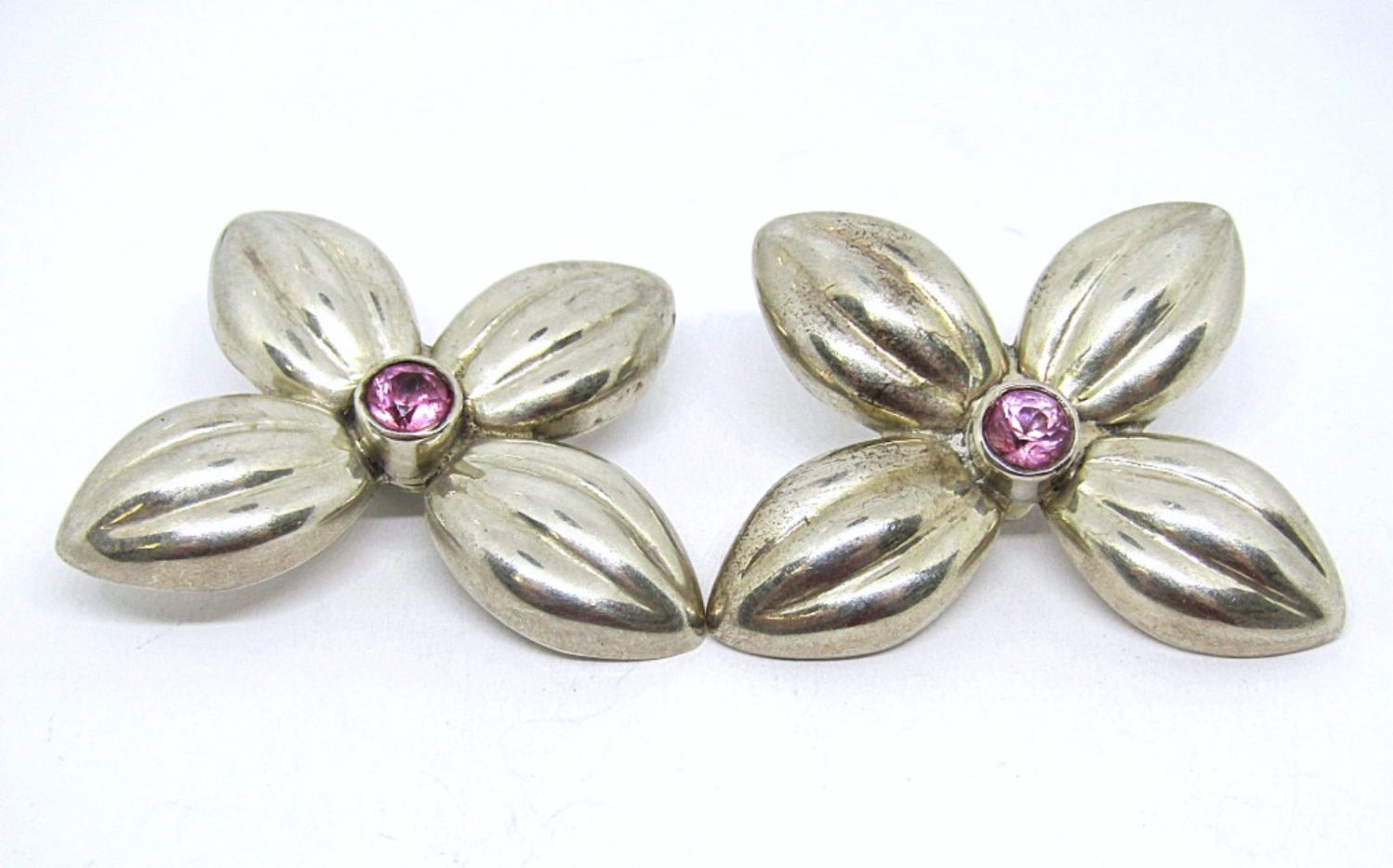 Three good solid vintage sterling pieces in simple floral designs, each with a light pink gemstone in the center. Includes a pair of clip on earrings and one pin. (38 dwt)
