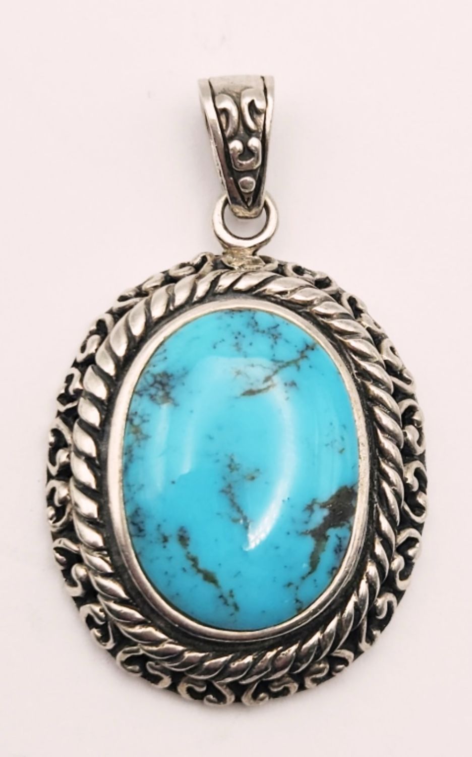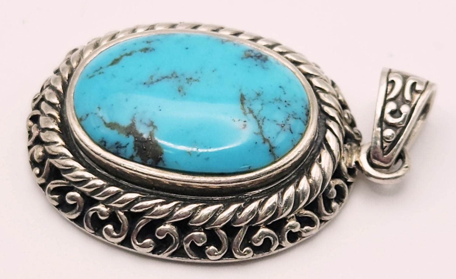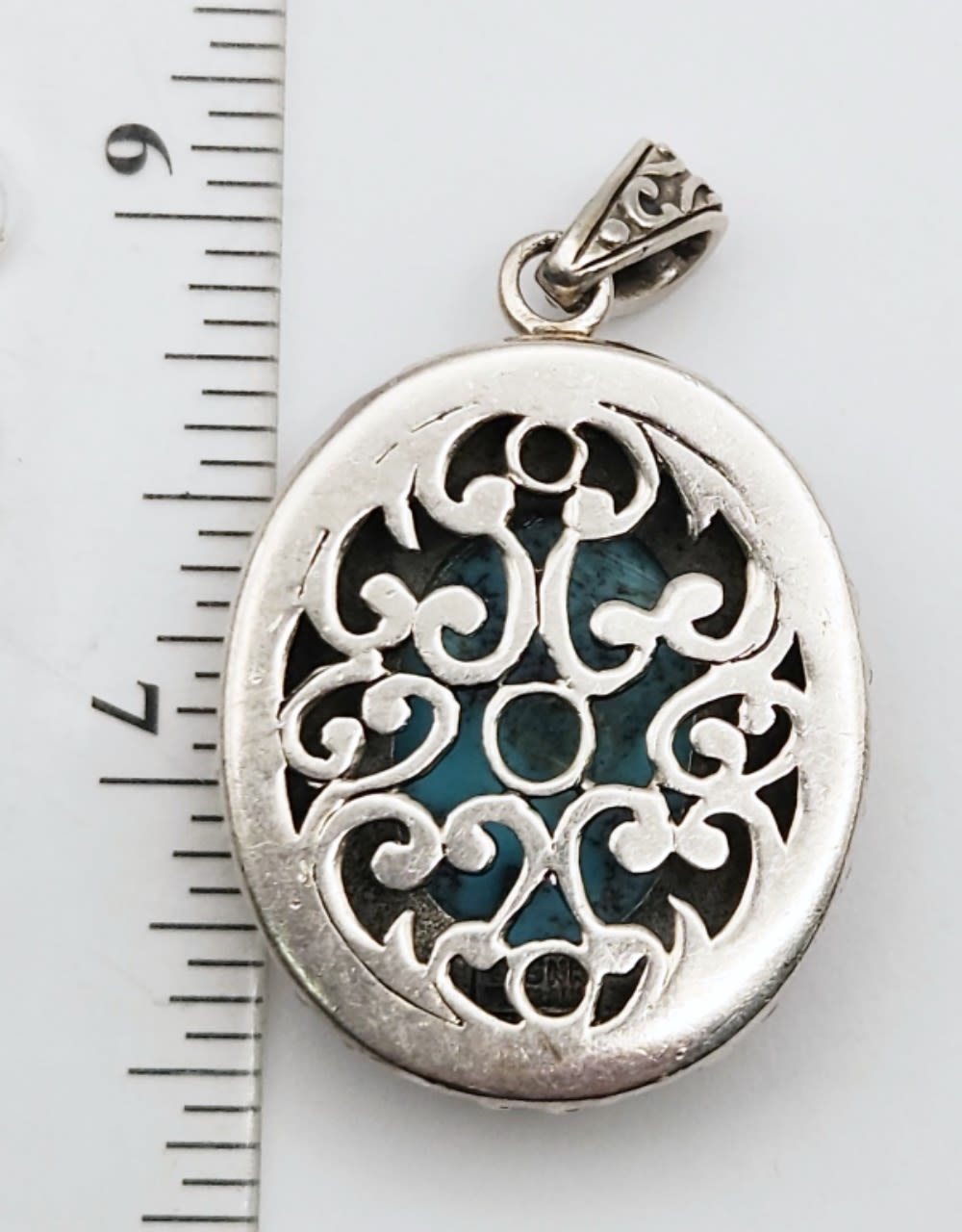 TURQUOISE CENTER STONE-CUT OUT SCROLL DESIGN ON BORDER AND BACK-TOTAL 9 DWT