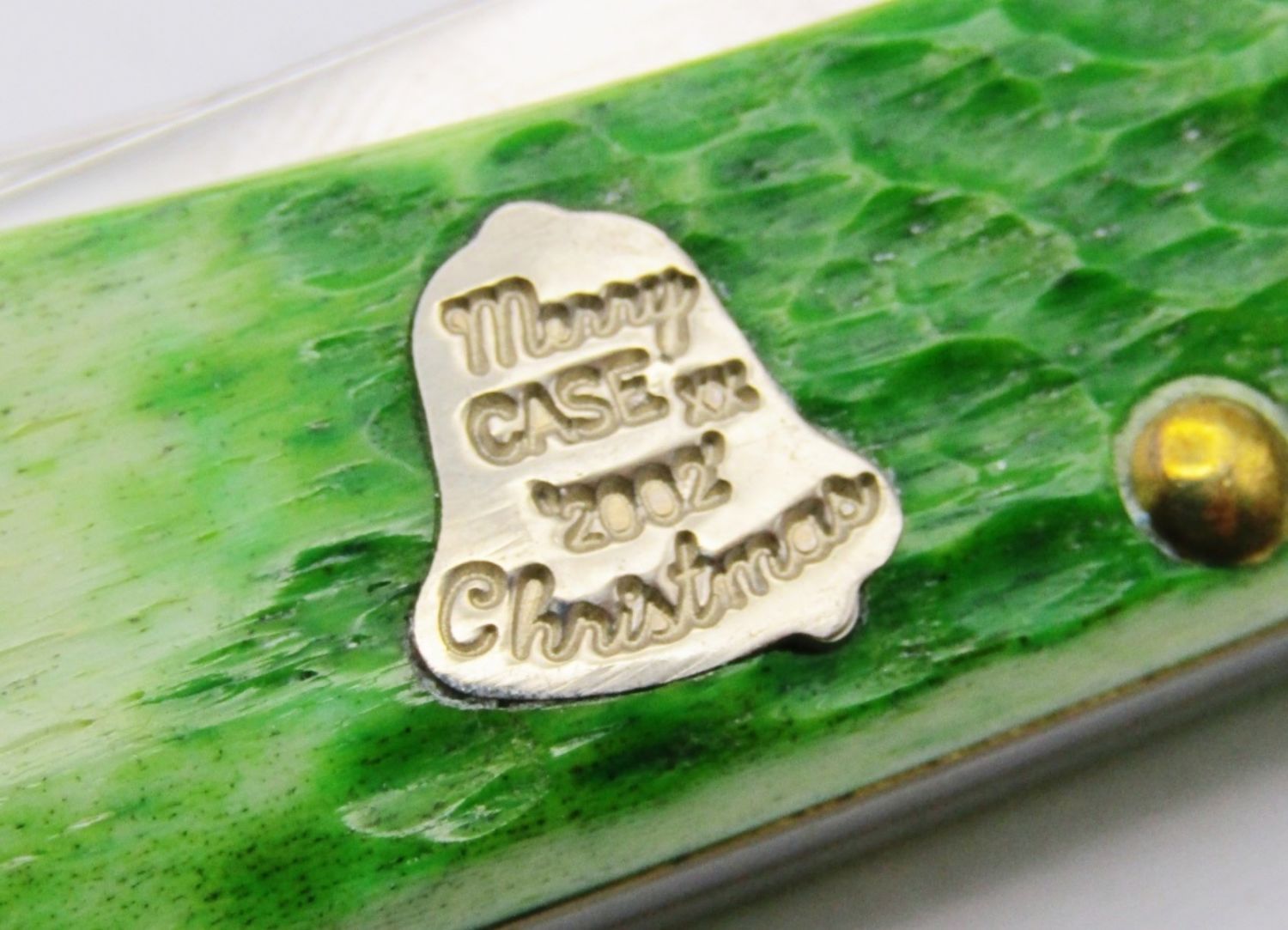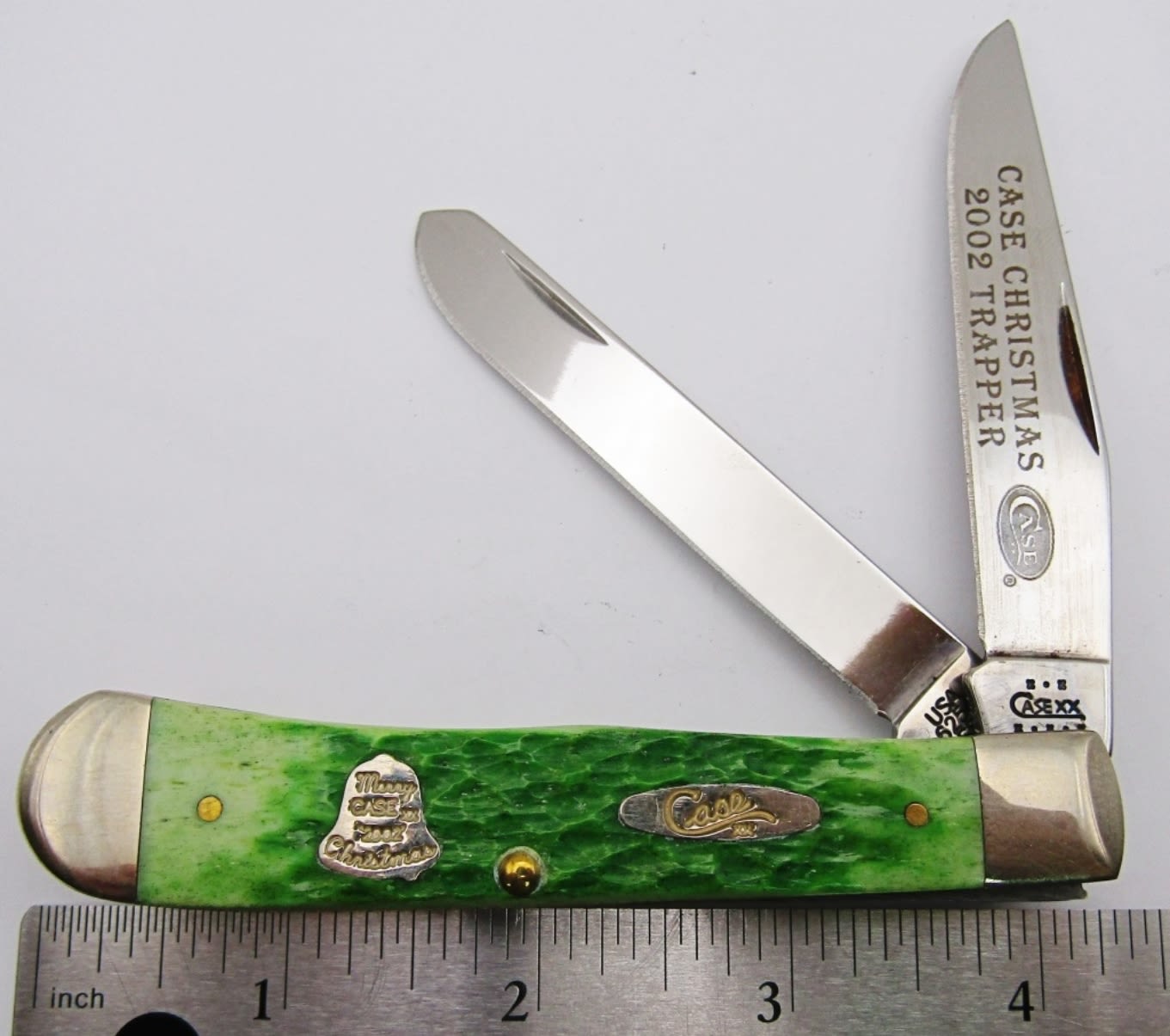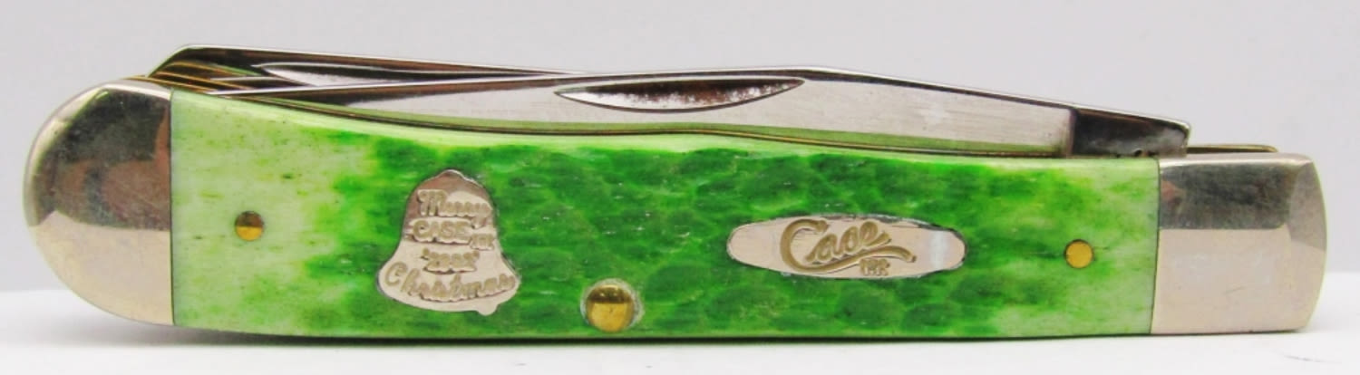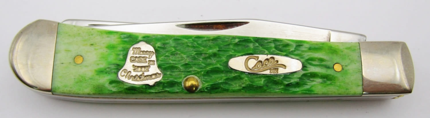 Bell Shield Stamped “Merry Case XX ‘2002’ Christmas”; Master Blade etched “Case Christmas 2002 Trapper”; Green Jigged Bovine Bone; Like New Condition!