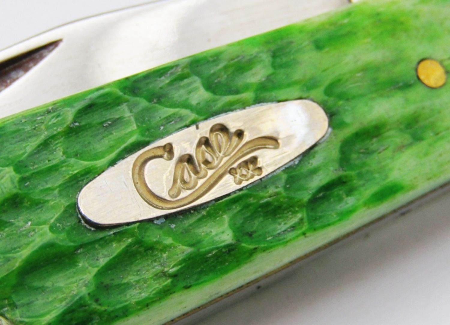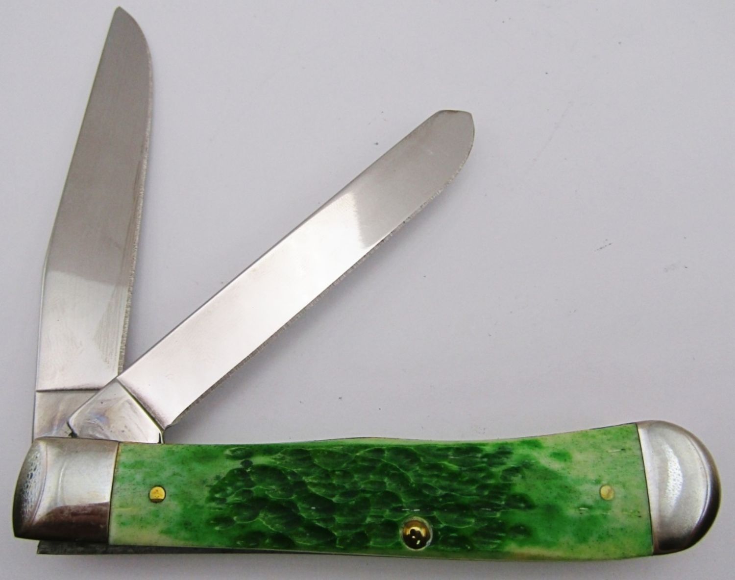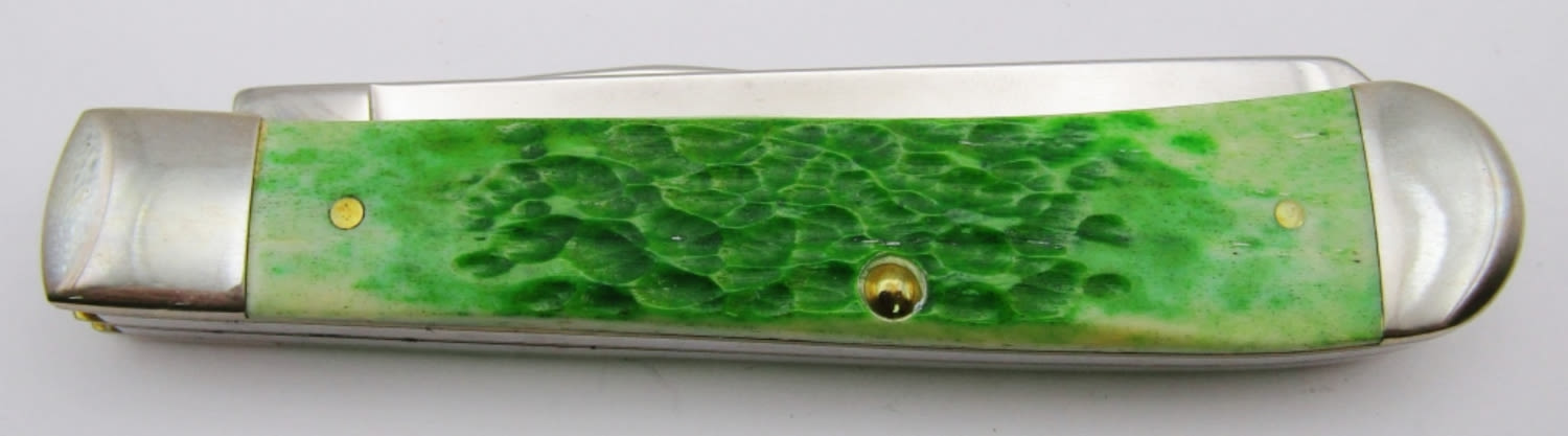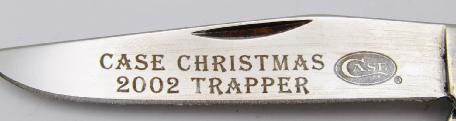 Bell Shield Stamped “Merry Case XX ‘2002’ Christmas”; Master Blade etched “Case Christmas 2002 Trapper”; Green Jigged Bovine Bone; Like New Condition!