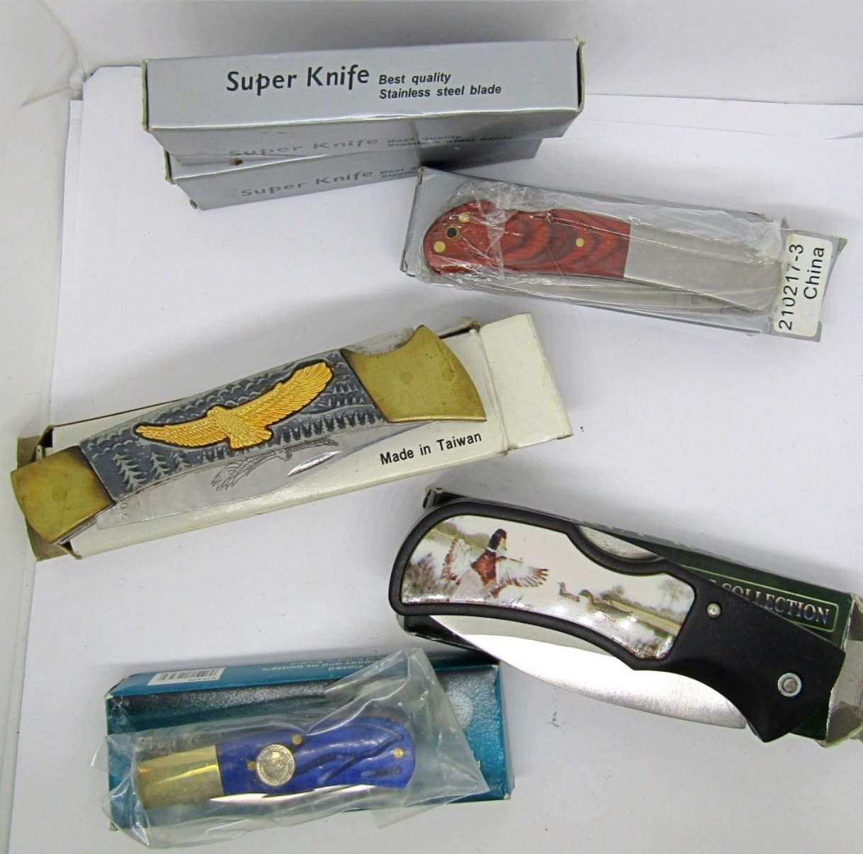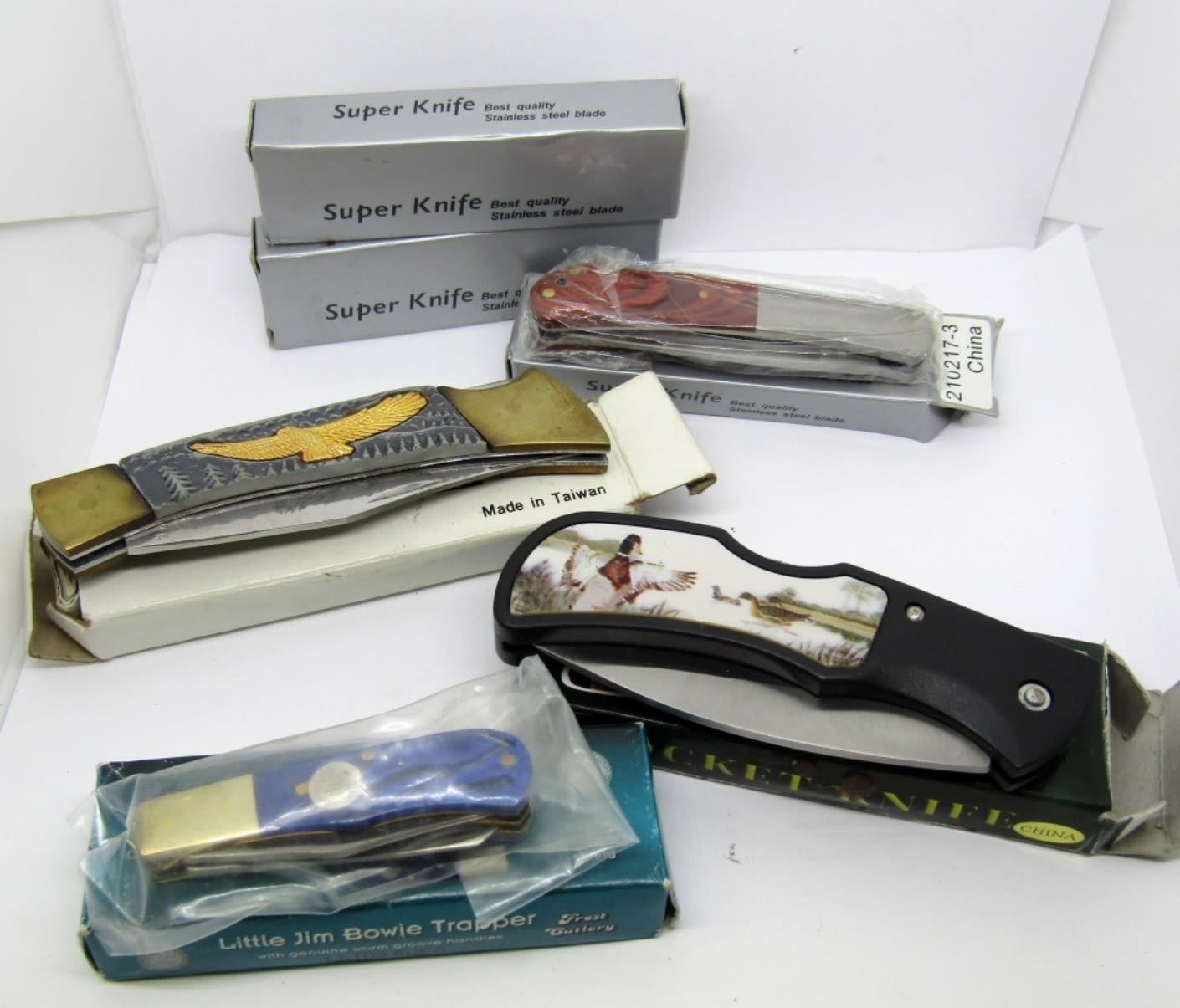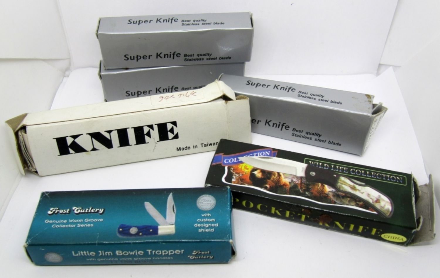 3 – SUPER KNIFE STAINLESS STEEL; 1 – LITTLE JIM BOWIE TRAPPER FROST CUTLERY; 1 – WILDLIFE COLLECTION KNIFE; 1 – AMERICAN EAGLE BICENTENNIAL FOLDING KNIFE WITH CERTIFICATE OF AUTHENTICITY.