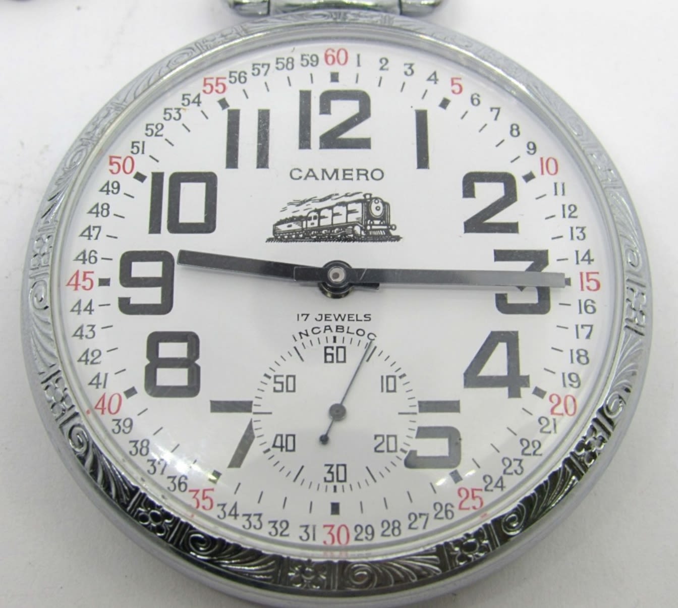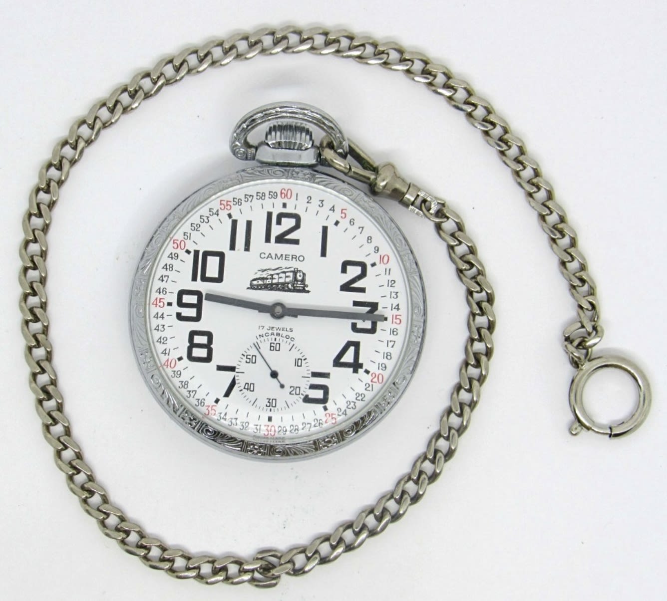 Beautiful running open face pocketwatch with 17 jewels. Back in unable to be opened but it can be wound up and ran. Silver toned back and chain, with a modern train etched onto back. In nice condition.