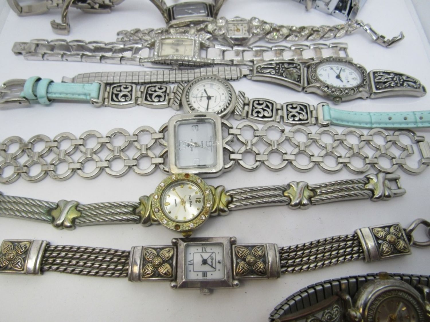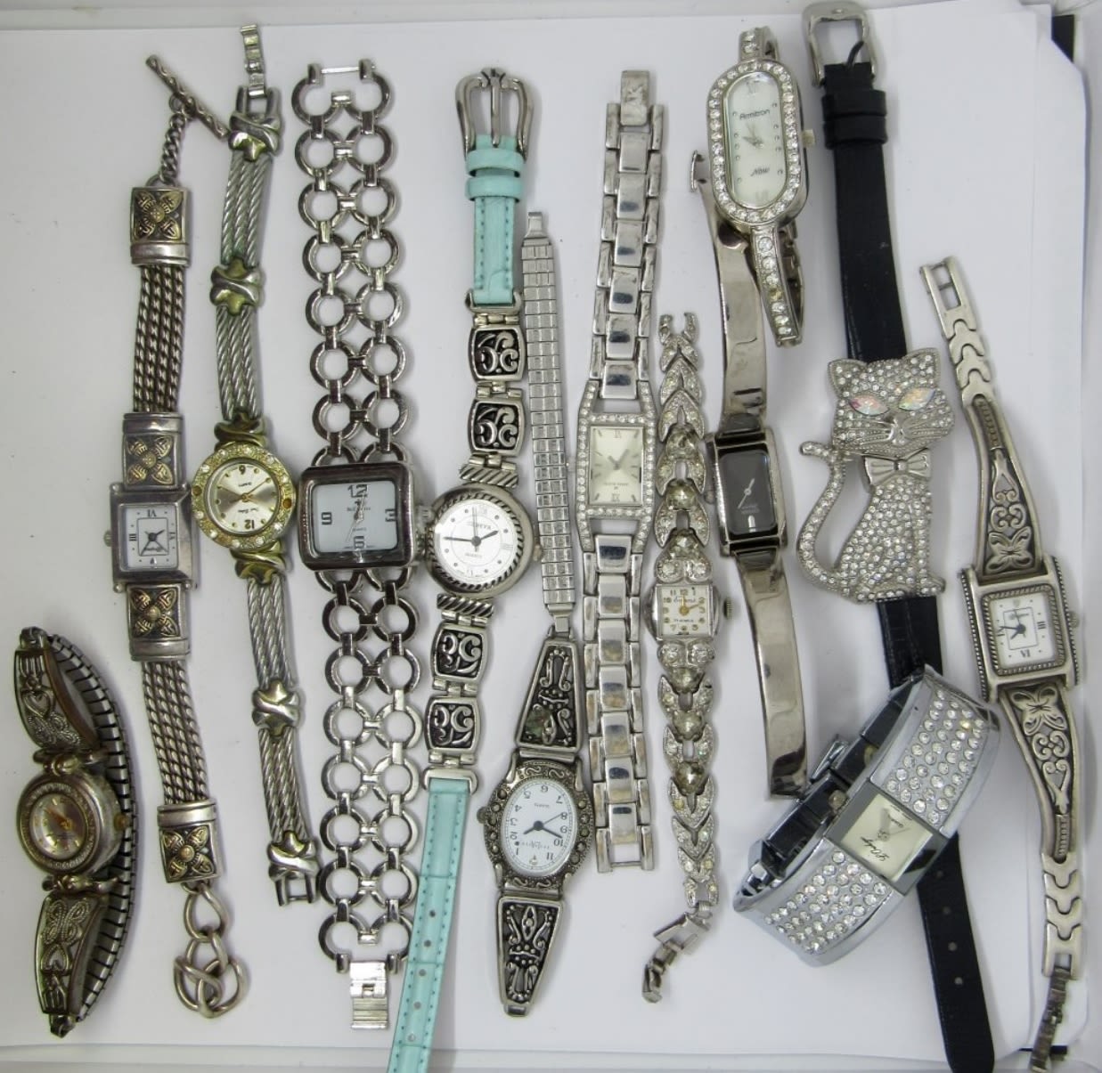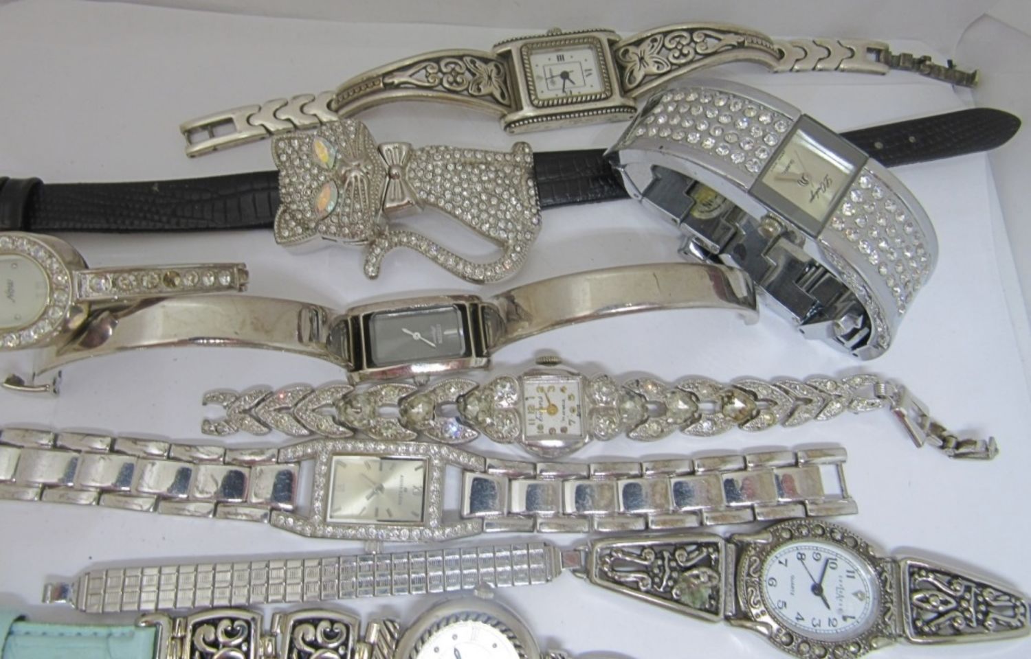 Large lot with fun designs, a couple leather bands, and rhinestone bracelets. Mix of vintage and modern watches, and includes many brands like Anna Klein, Geneva, Citizens, and more. Mostly quartz movement, and all