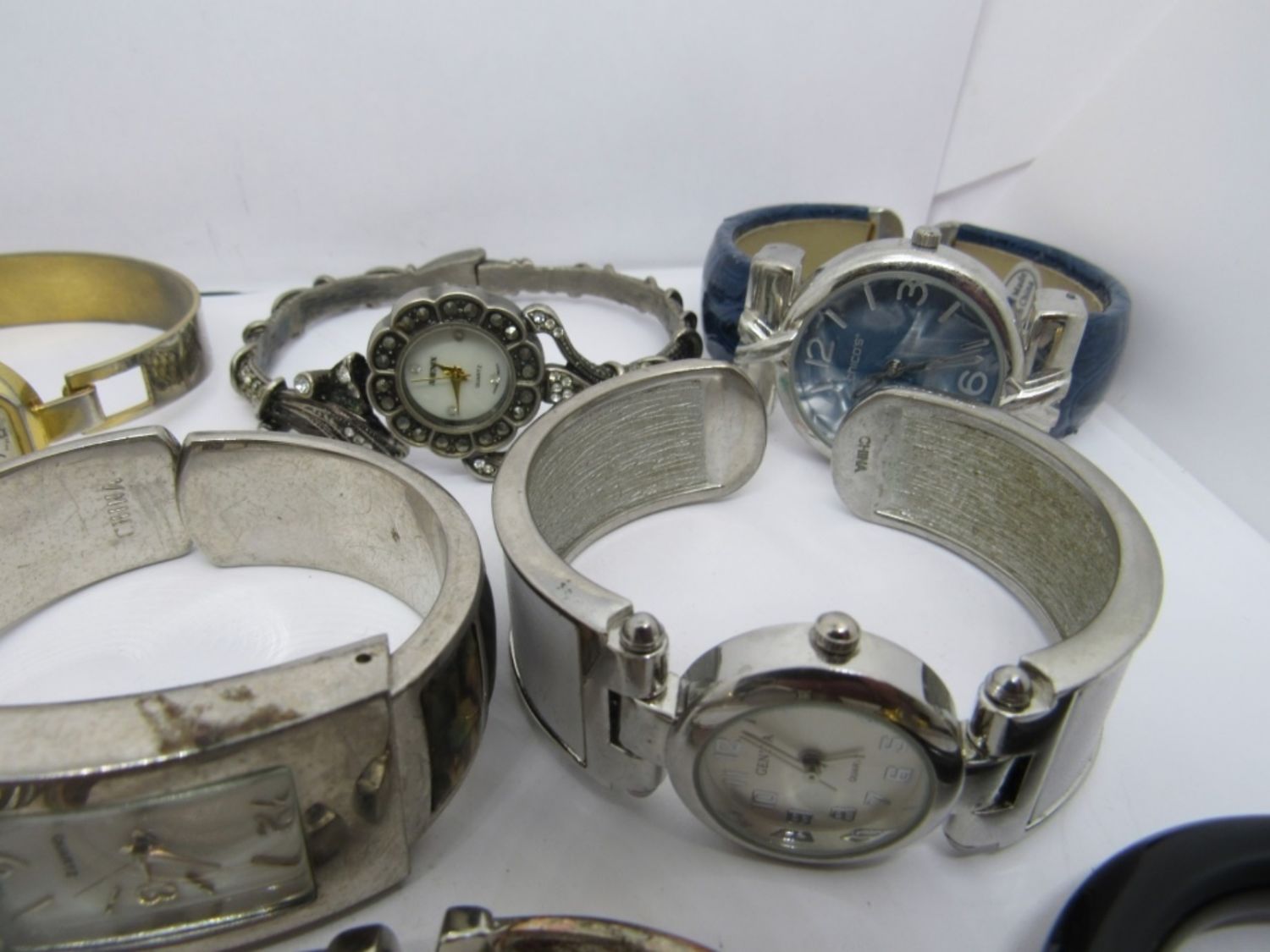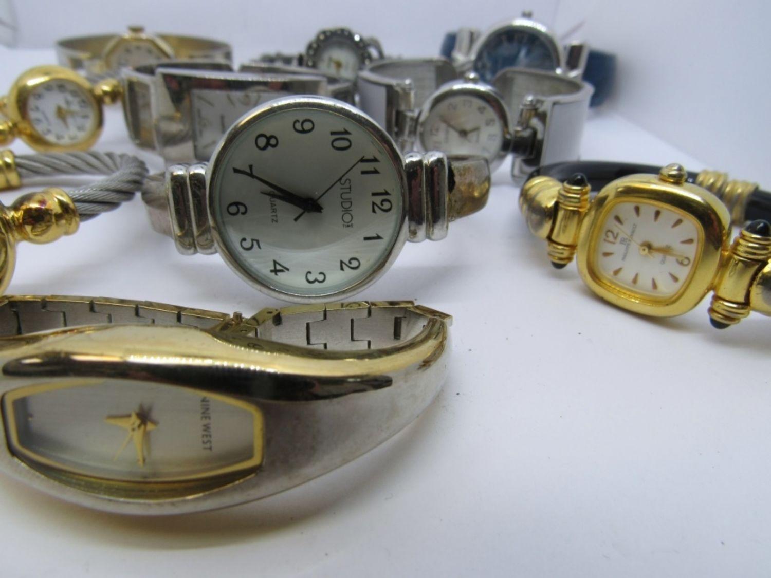 10 unique ladies watches! All quartz, and each is in a different cuff bracelet design. Includes brands like Geneva, Nine West, Philippe Renault, and many more! Untested as to working.