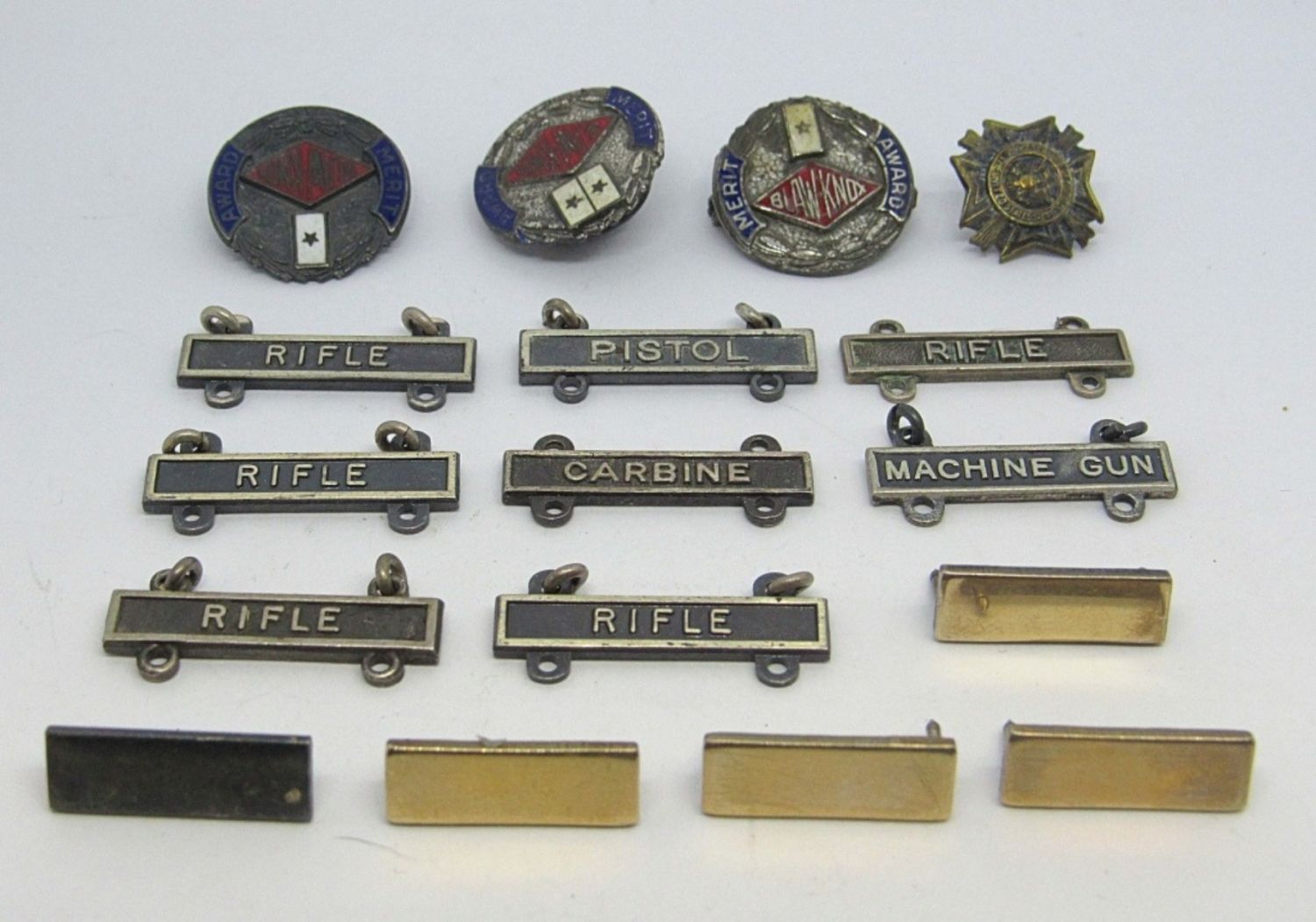 (3) WWII BLAW KNOX, (8) MARKSMAN MERITS, (4) GOLD TONED STERLING BARS, (1) STERLING BAR, (1) VETERANS of FOREIGN WARS (25 DWT)