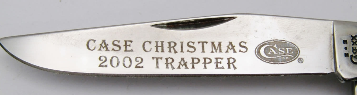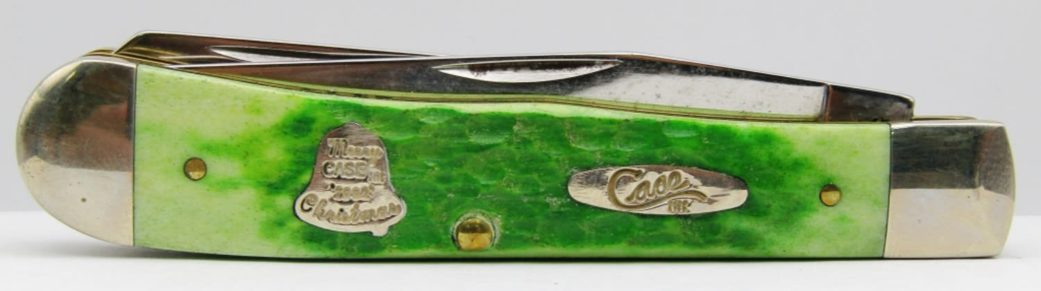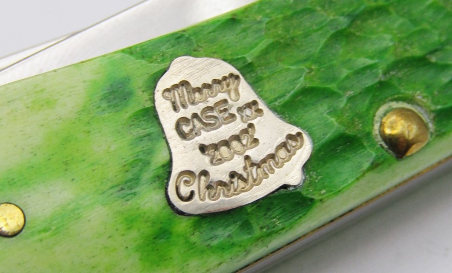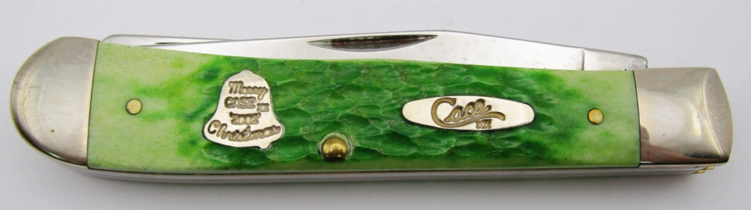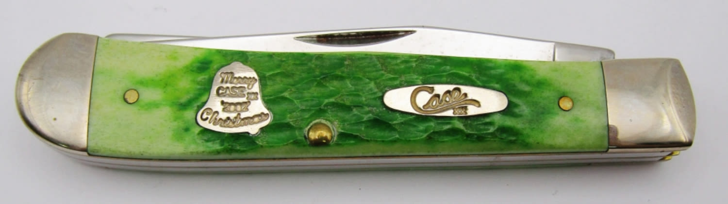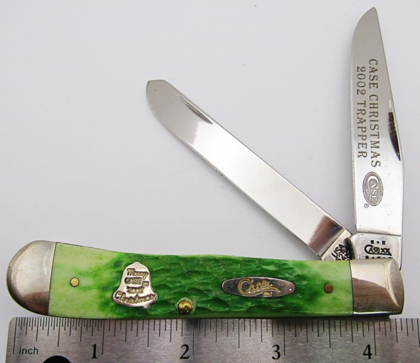 Bell Shield Stamped “Merry Case XX ‘2002’ Christmas”; Master Blade etched “Case Christmas 2002 Trapper”; Green Jigged Bovine Bone; Like New Condition!