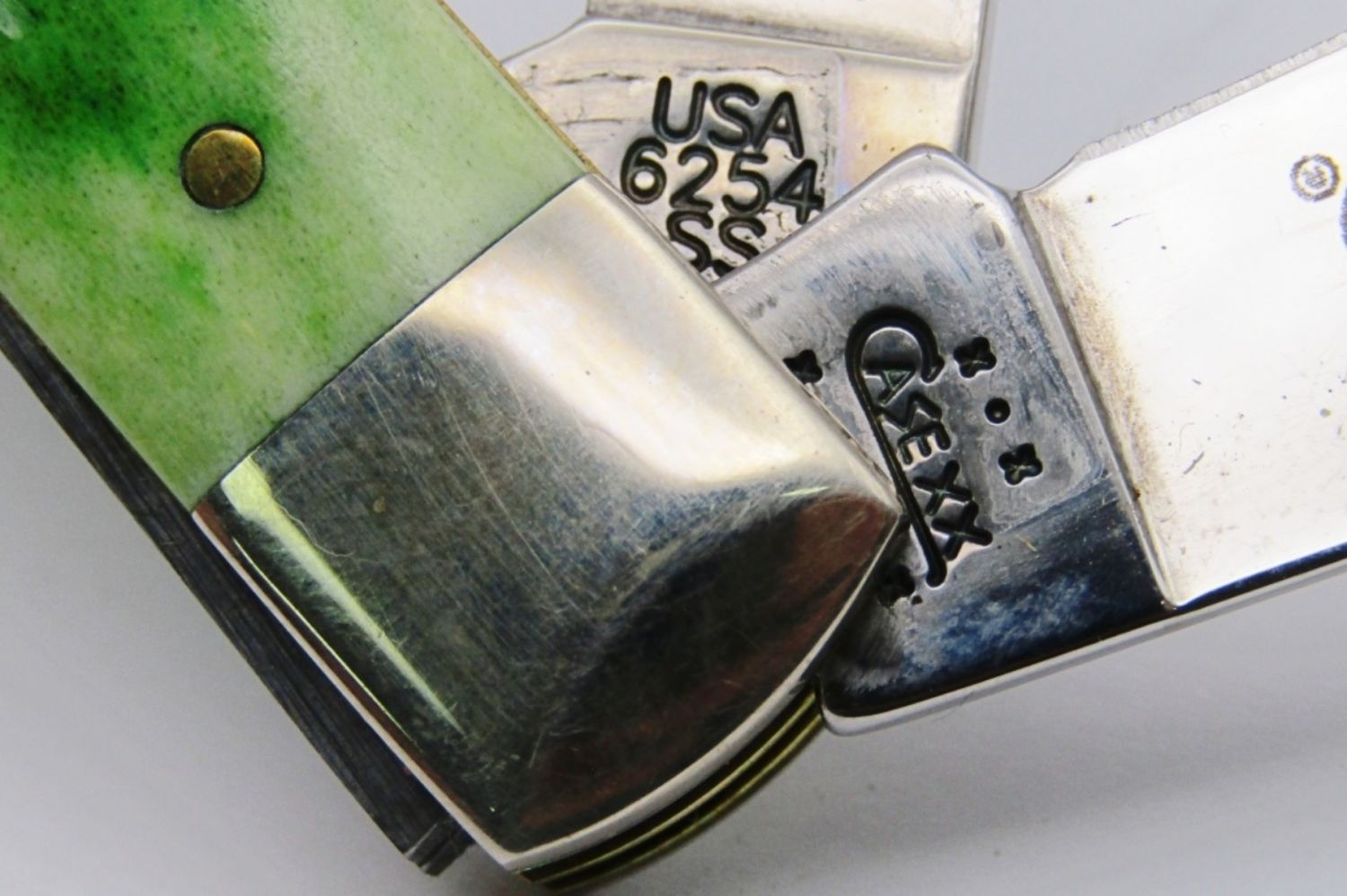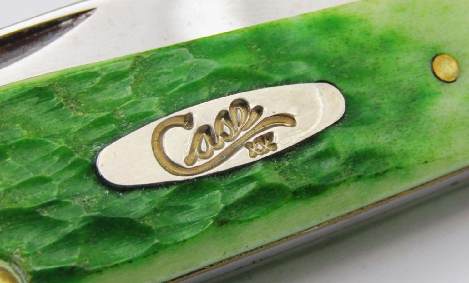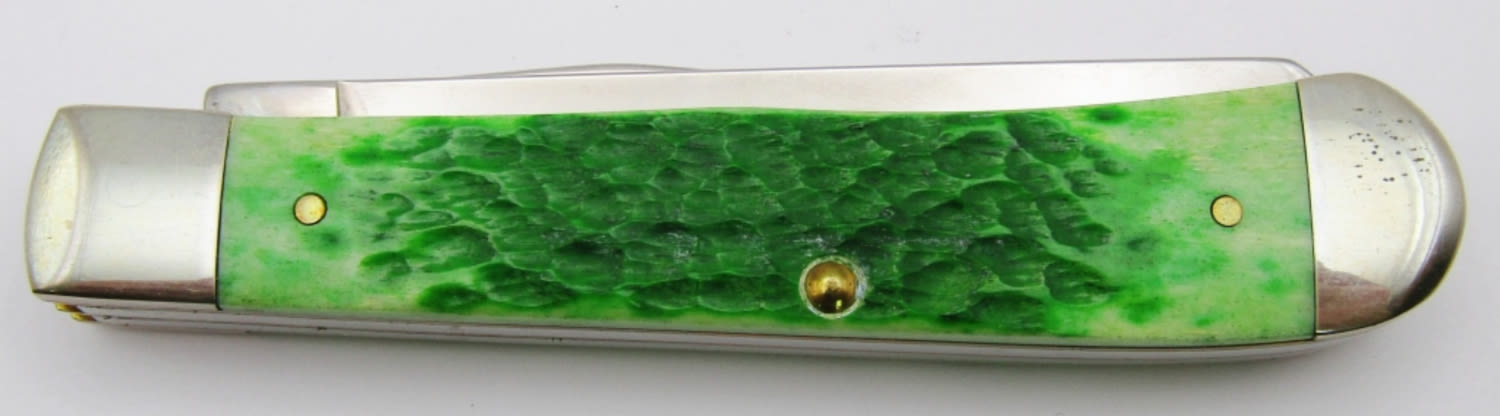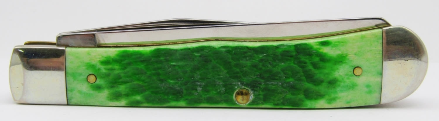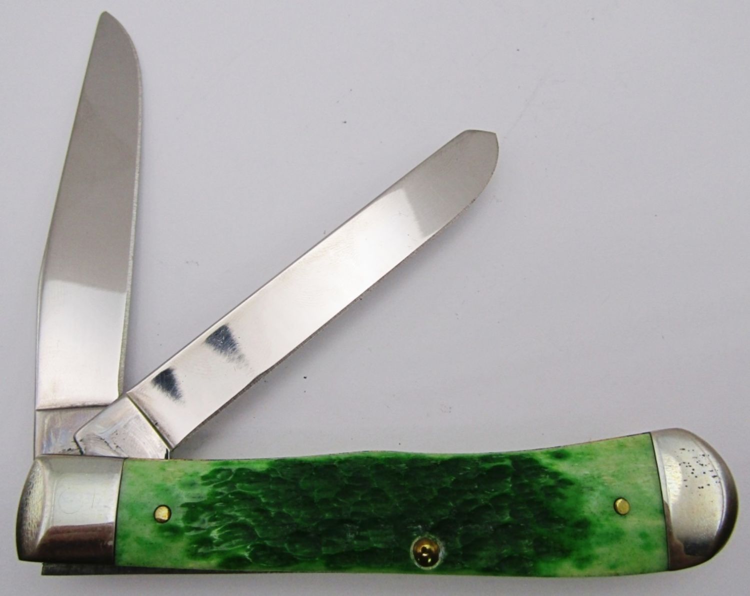 Bell Shield Stamped “Merry Case XX ‘2002’ Christmas”; Master Blade etched “Case Christmas 2002 Trapper”; Green Jigged Bovine Bone; Like New Condition!