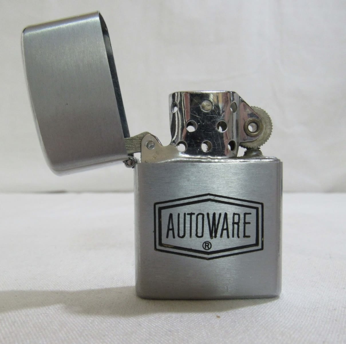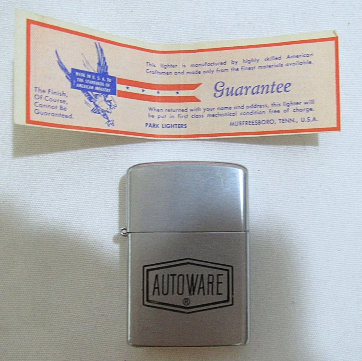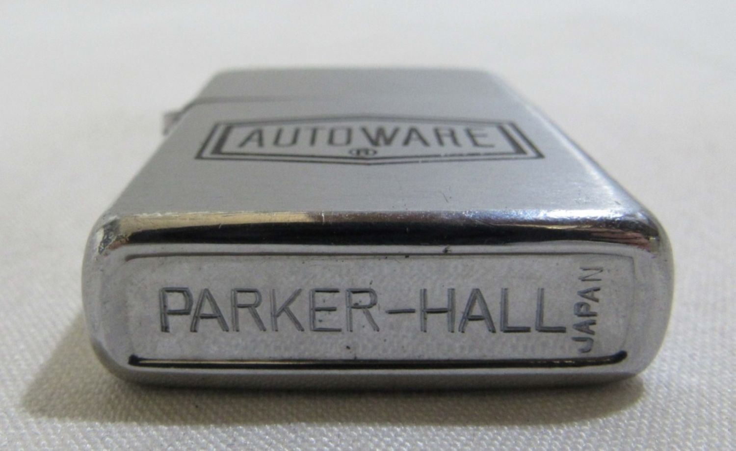 Vintage Parker Hall lighter with Autoware logo on the front. Comes with box and original direction and guarantee. Lighter in good condition, and untested.