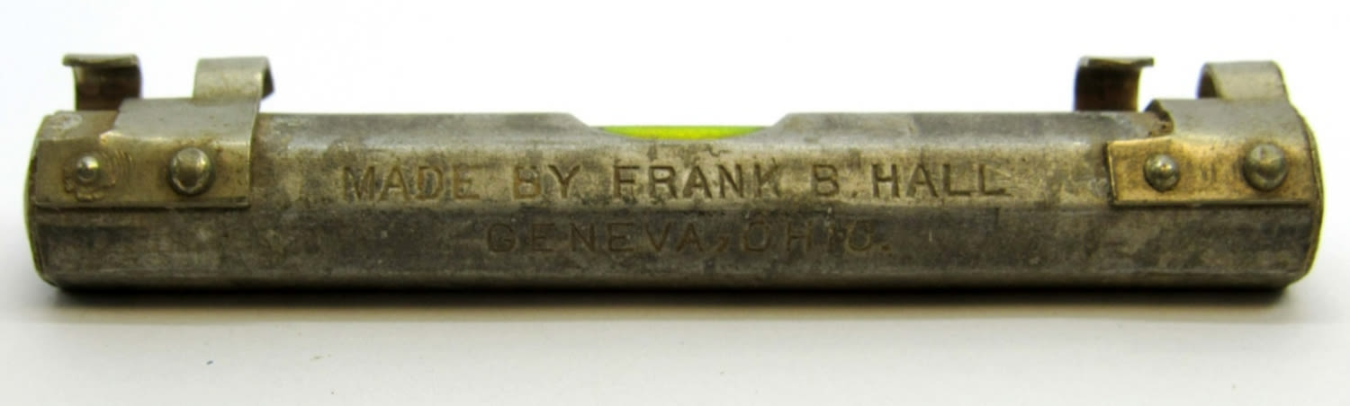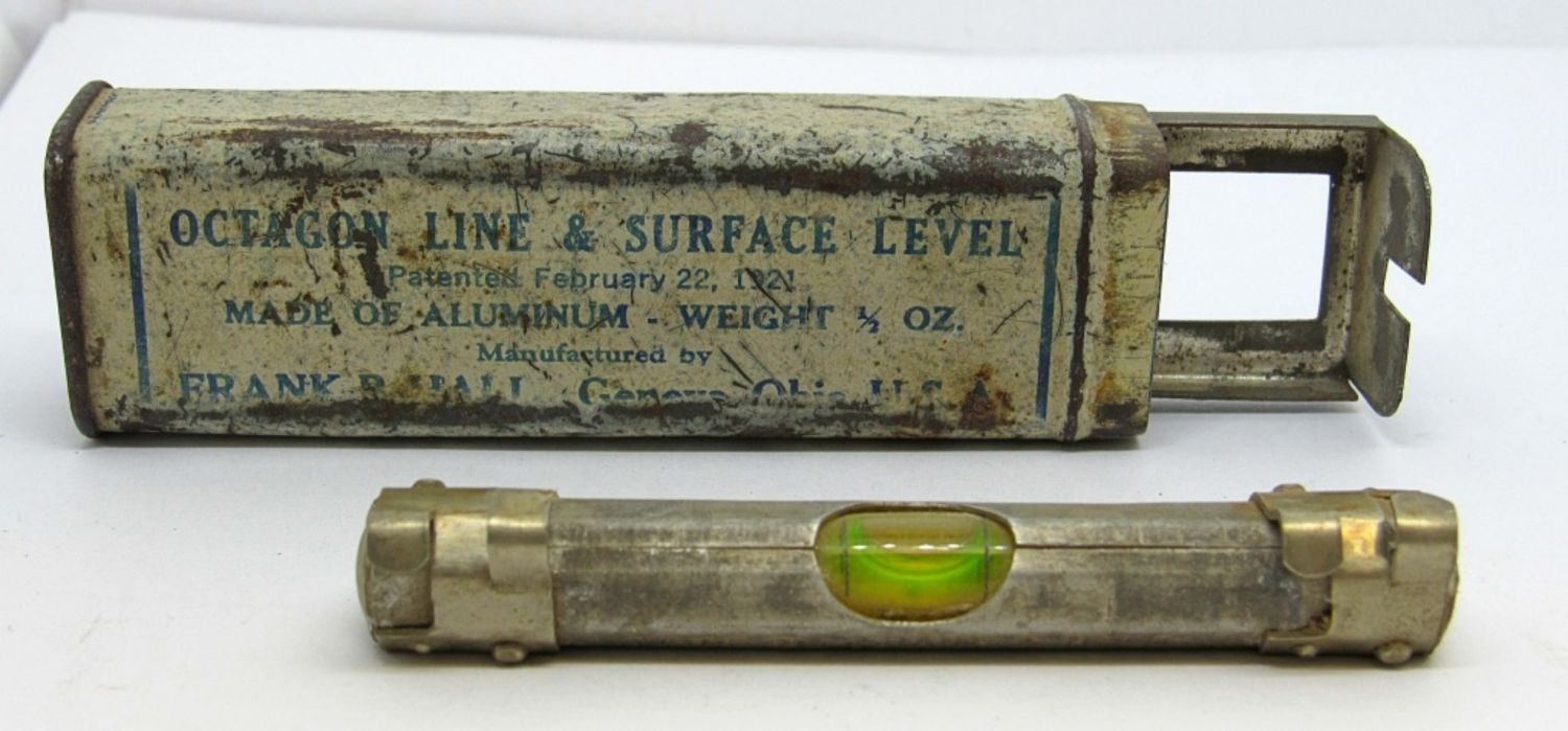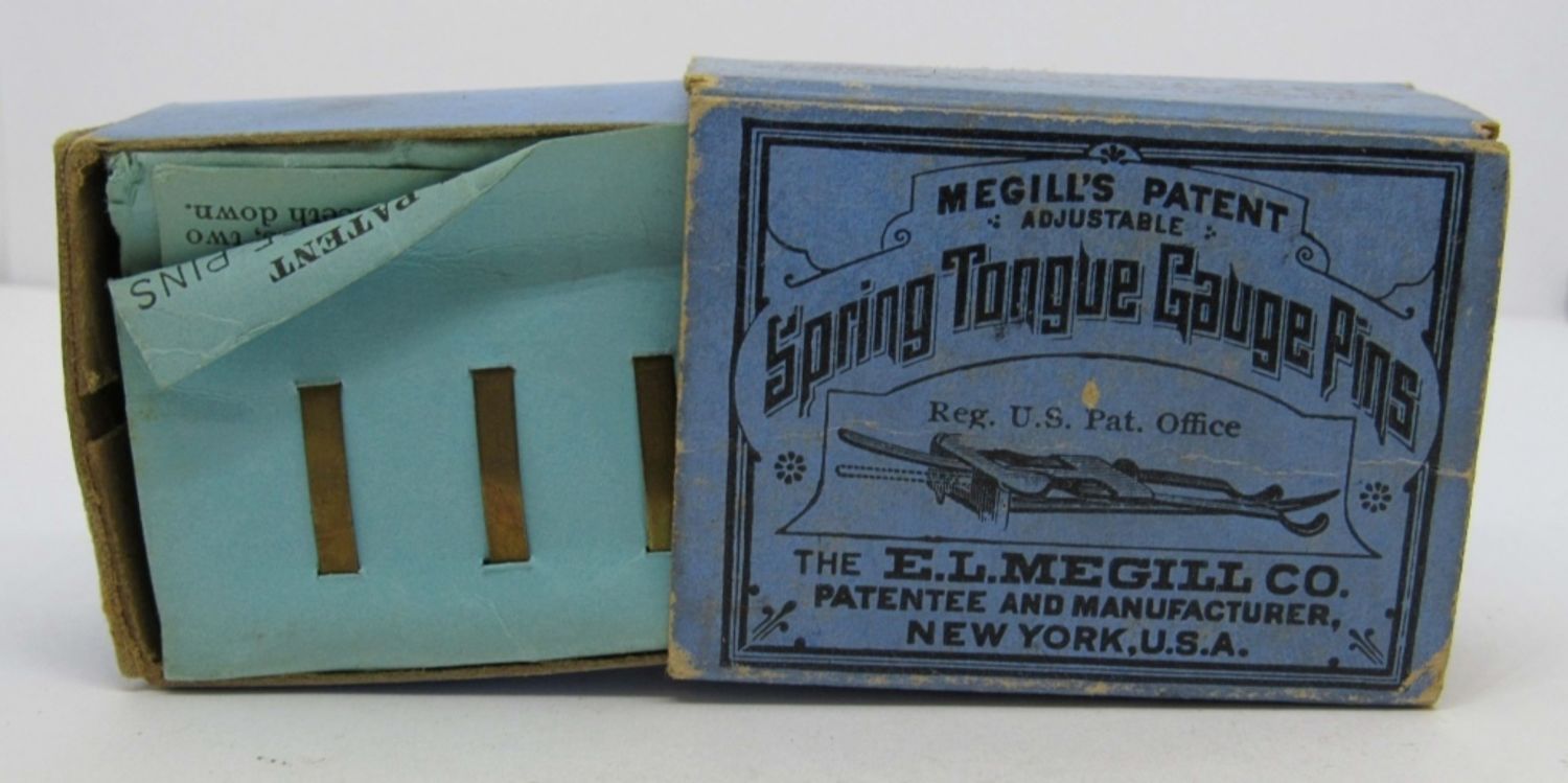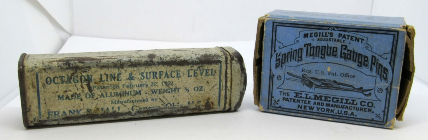 INCLUDES ONE OCTAGON LINE AND SURFACE LEVEL AND CASE, MADE OF ALUMINUM, AND ONE MEGILL’S PATENT ADJUSTABLE SPRING TONGUE GAUGE PINS WITH ONE DOZEN PINS INSIDE.