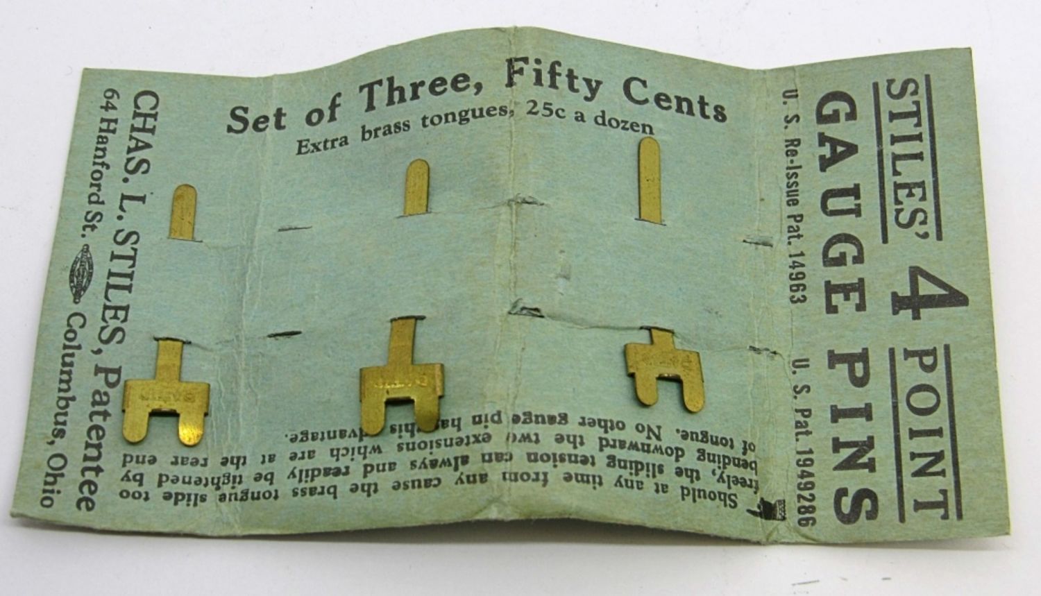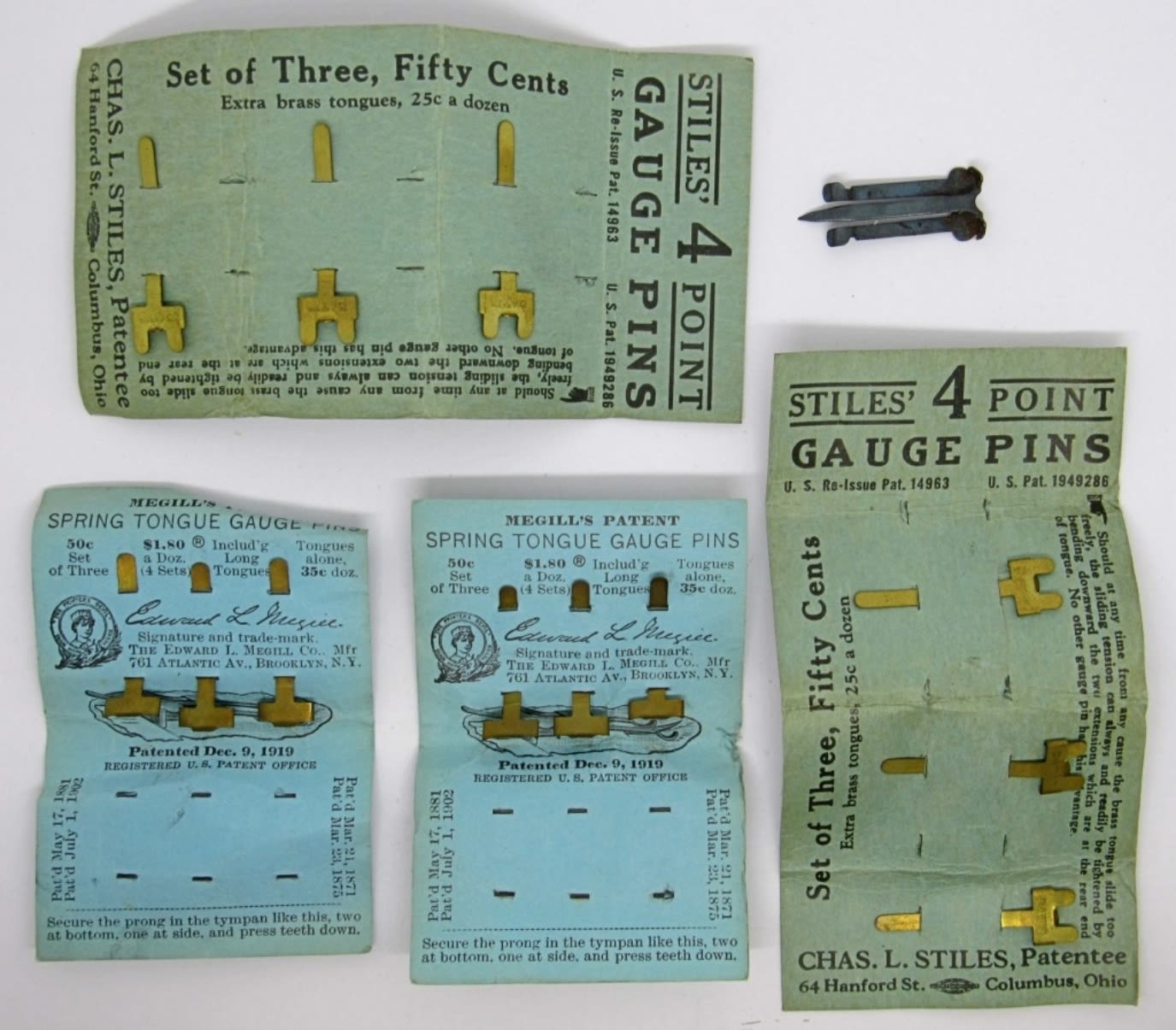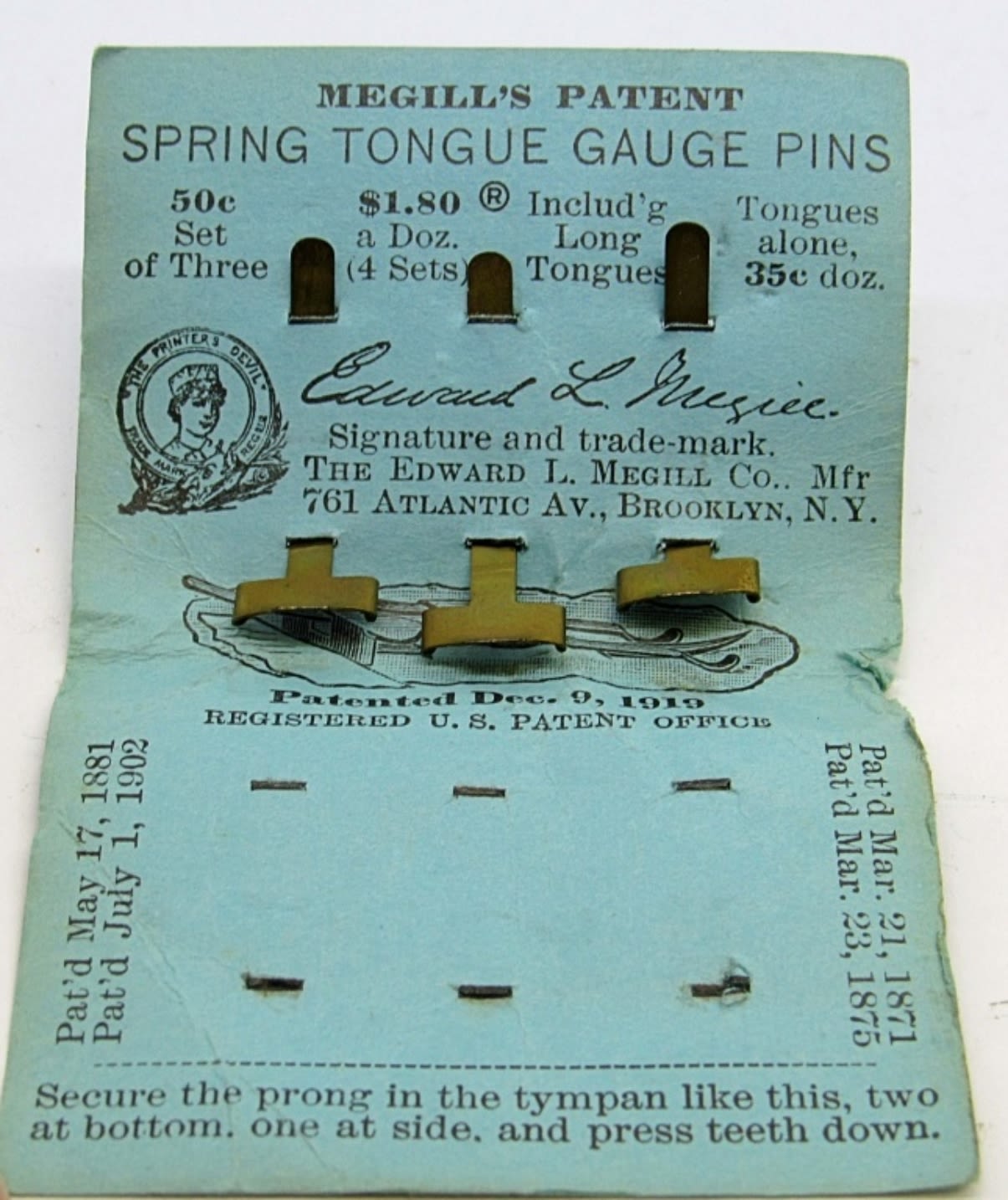 INCLUDES ONE OCTAGON LINE AND SURFACE LEVEL AND CASE, MADE OF ALUMINUM, AND ONE MEGILL’S PATENT ADJUSTABLE SPRING TONGUE GAUGE PINS WITH ONE DOZEN PINS INSIDE.