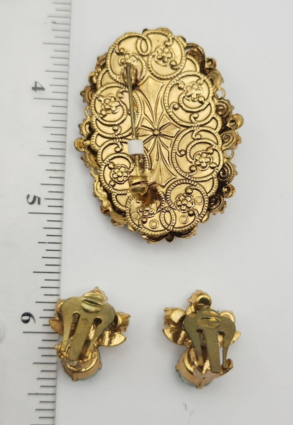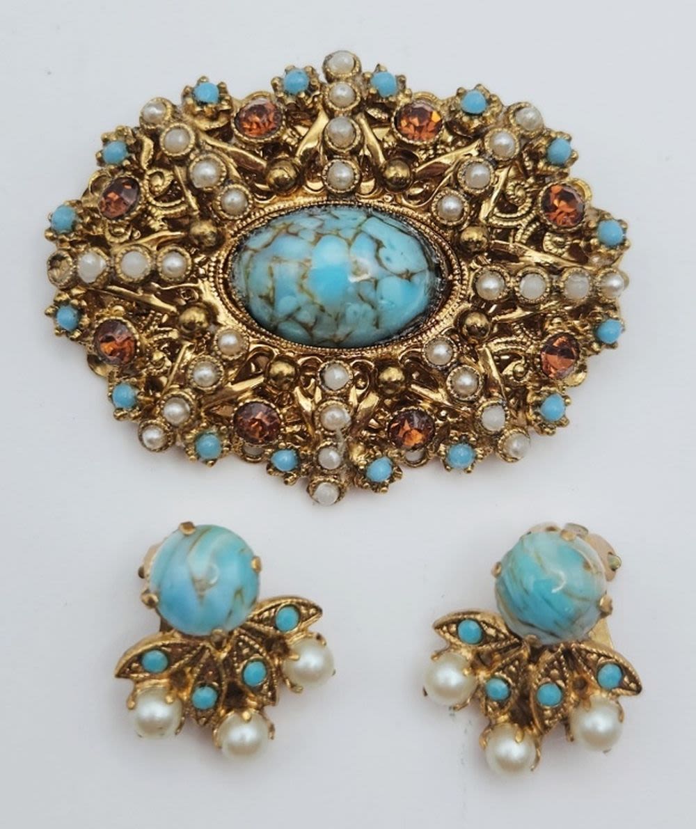 LUCITE-FAUX PEARLS & ORANGE RHINESTONES WITH MATCHING PAIR OF CLIP ON EARRINGS-FEW STONES MISSING