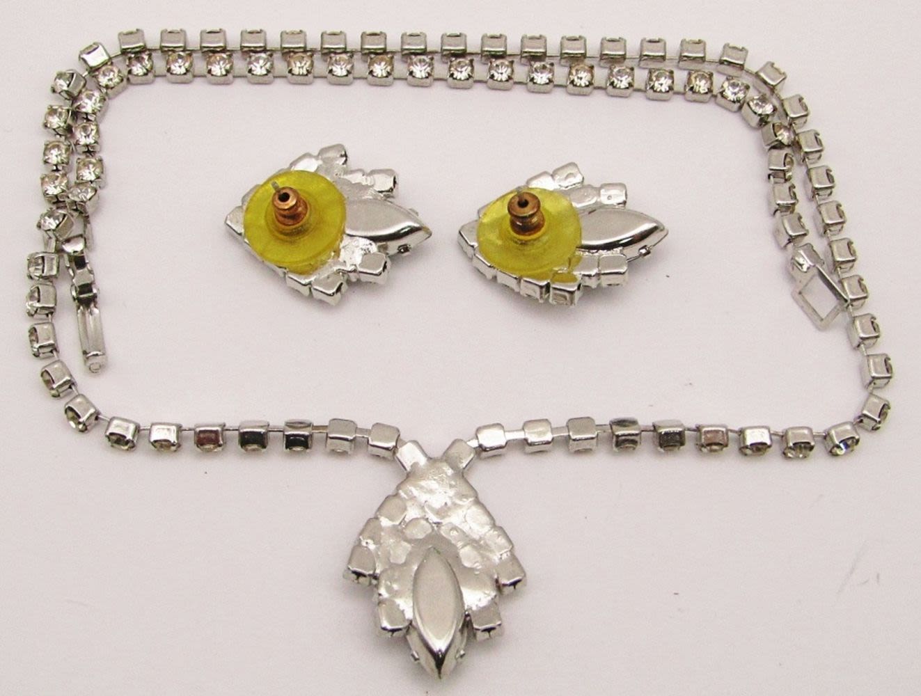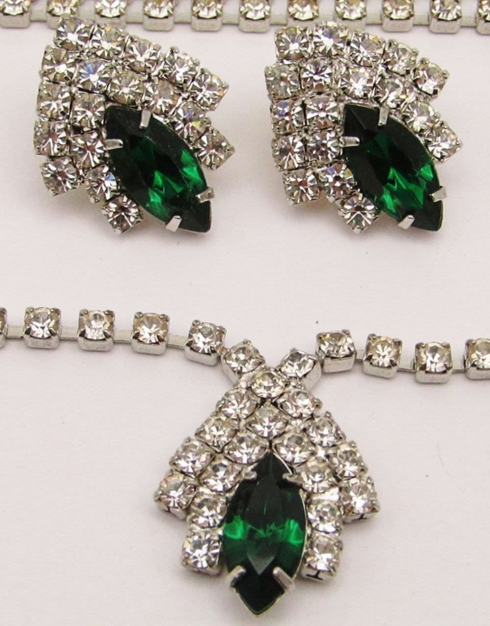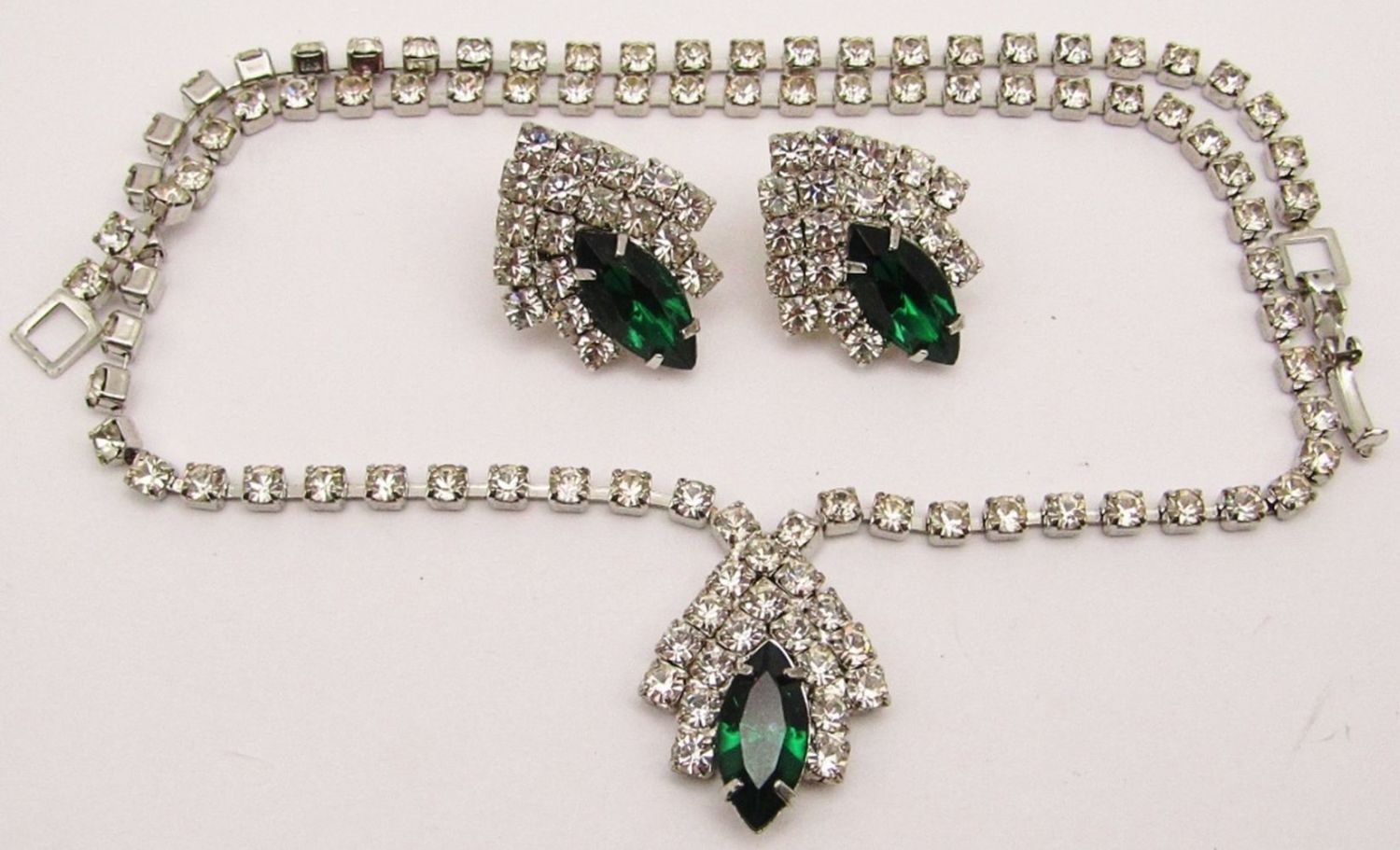 EMRALD GREEN RHINESTONE ACCENT IN PENDANT WITH MATCHING PAIR OF PIERCED EARRINGS-NECKLACE MEASURES 34 INCHES