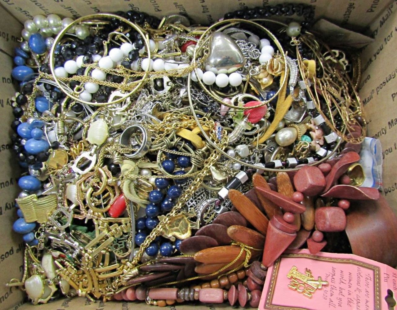EACH LOT is UNIQUE! ABSOLUTELY A TREASURE HUNT – SOME PIECES MISSING STONES or NEEDING REPAIRED – GREAT FOR THE PINTEREST / CRAFT PERSON. MANY ITEMS NAMED – MEDIUM FLAT RATE BOX FULL