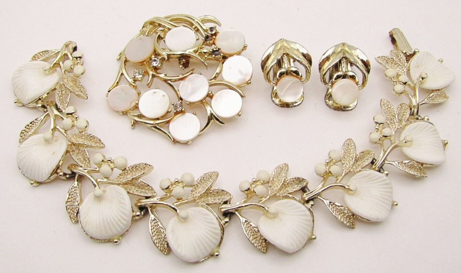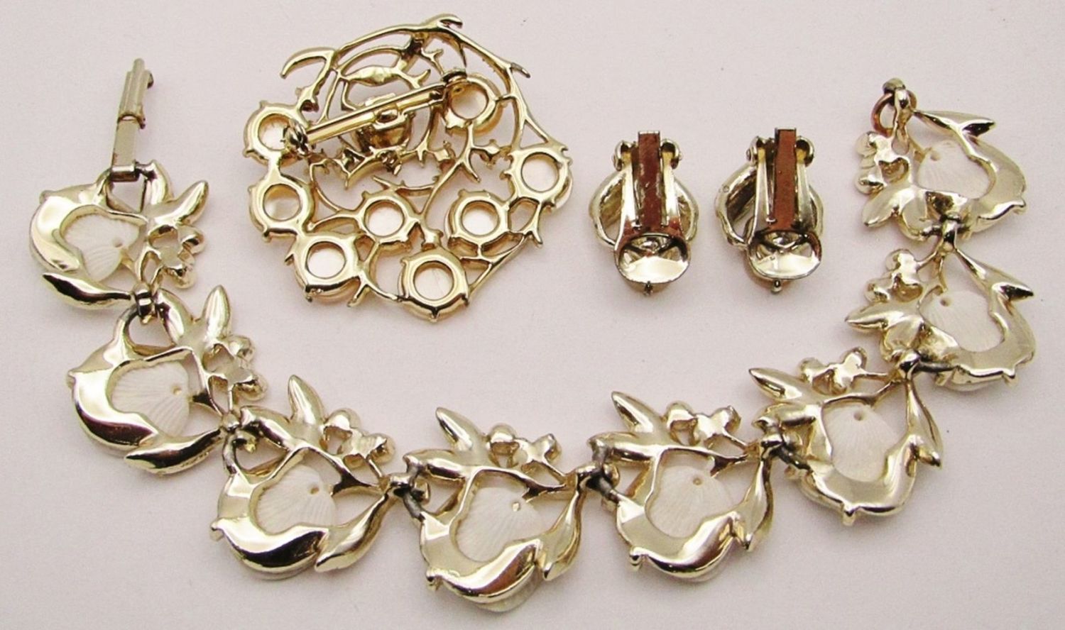 BROOCH WITH MOTHER OF PEARL AND RHINESTONES WITH MATCHING PAIR OF CLIP ON EARRINGS PLUS BONUS PANEL BRACELET WITH WHITE LUCITE ACCENTS-LEAF DESIGN-MEASURES 8 INCHES