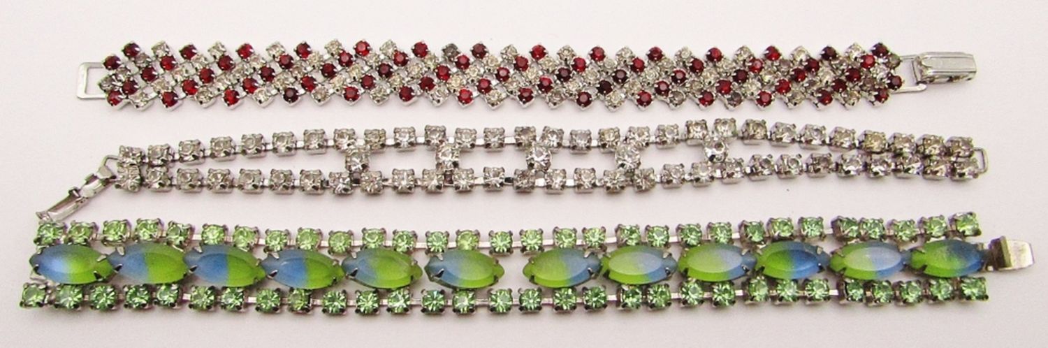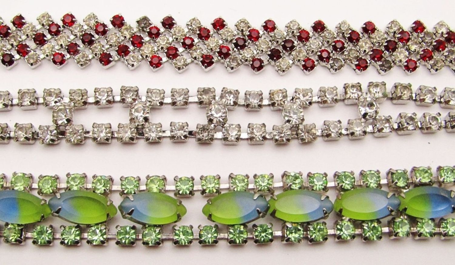CLEAR-RUBY RED-ELECTRIC GREEN RHINESTONES & MULTI TONED GREEN AND BLUE LUCITE-VARIOUS LENGTHS