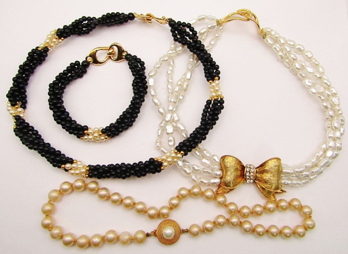 MULTI STRANDED BLACK & CULTURED PEARL NECKLACE AND BRACELET (1)MULTI STRANDED CULTURED PEARL NECKLACE WITH BOW PENDANT & (1)VTG PEARL NECKLACE-VARIOUS LENGTHS/STYLES