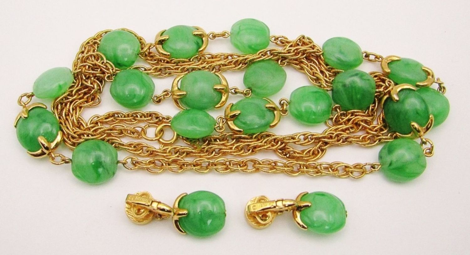 WITH GREEN STONE ACCENTS PLUS MATCHING PAIR OF CLIP ON DANGLY EARRINGS