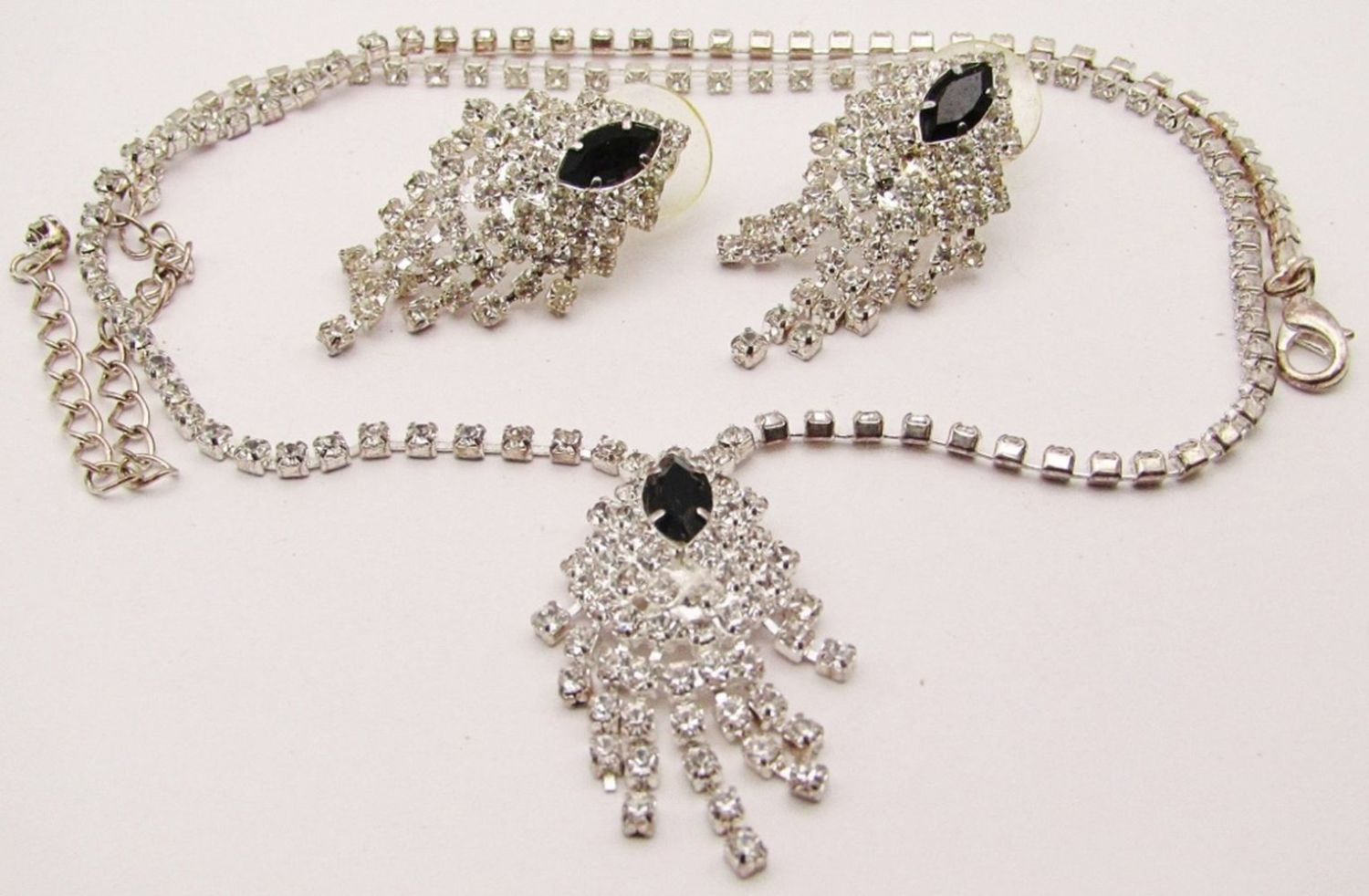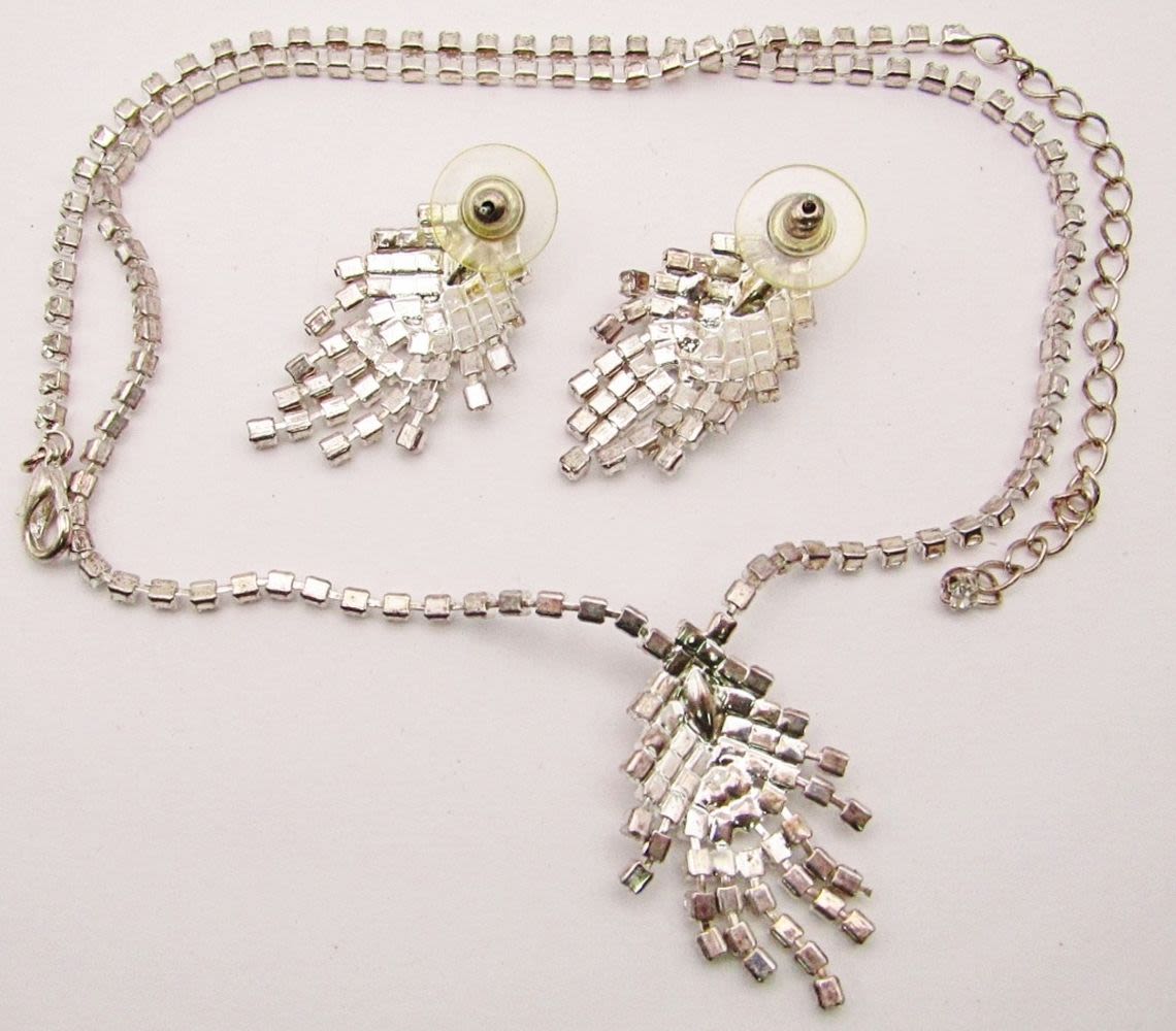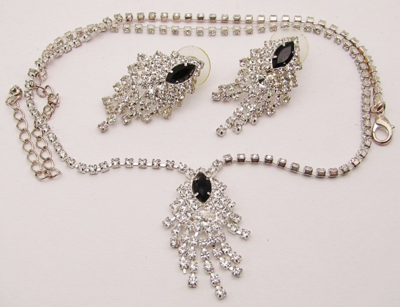 WITH NAVY BLUE RHINESTONE CENTER PENDANT PLUS MATCHING PAIR OF PIERCED EARRINGS-NECKLACE MEASURES 17 INCHES