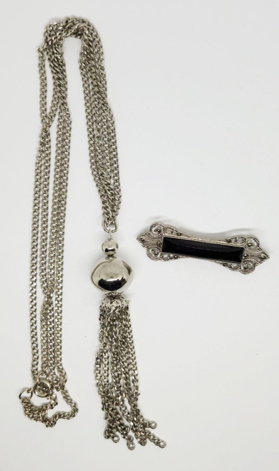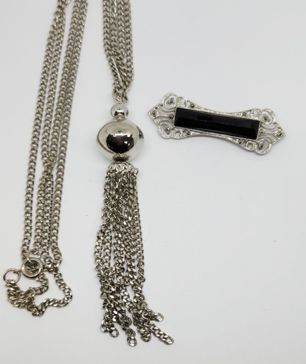 WITH TASSLE PLUS BONUS SILVER TONED RHINESTONE BROOCH WITH BLACK LUCITE CENTER-NECKLACE MEASURES 32 INCHES