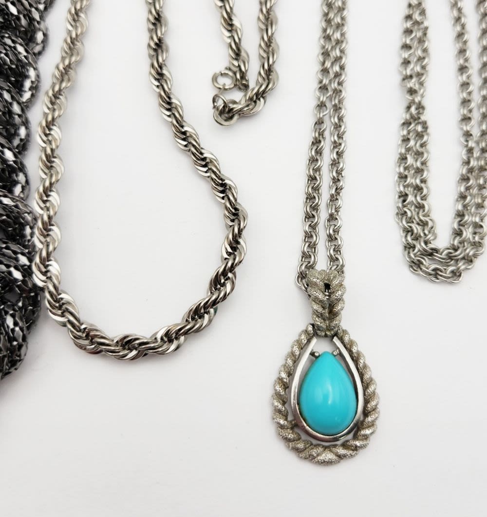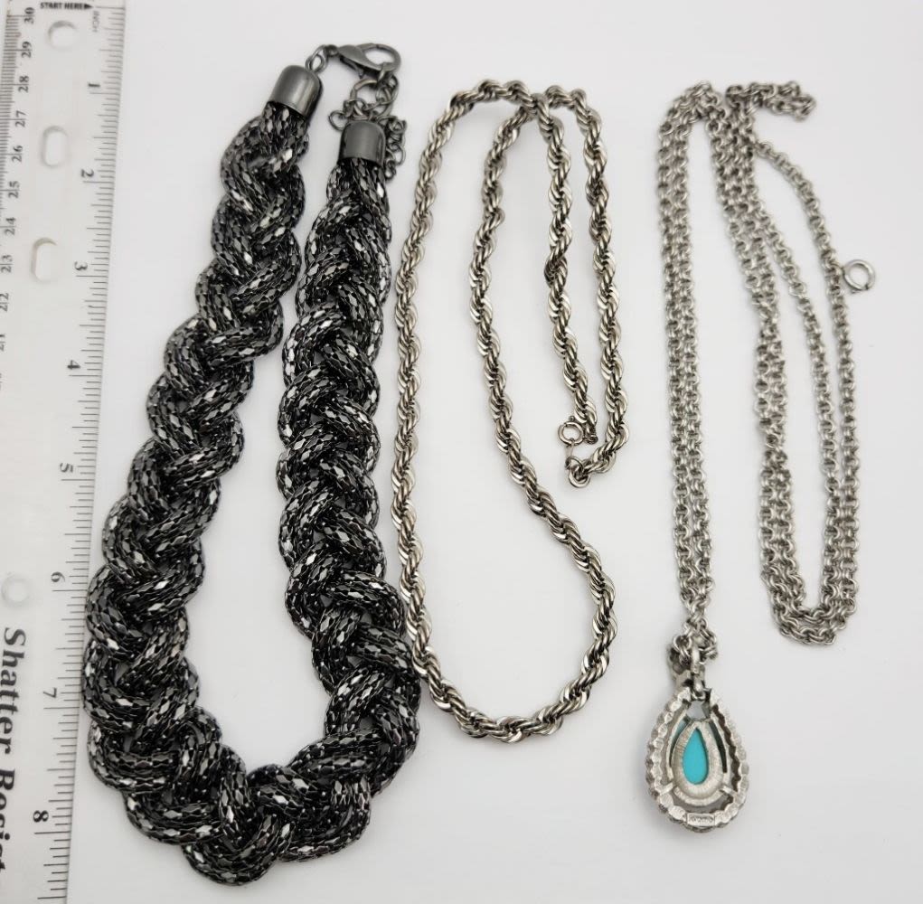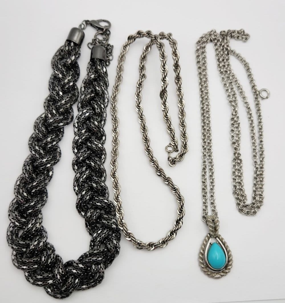 STRANDED WITH TEARDROP PENDANT TURQUOISE LUCITE CENTER (1)MULTI LAYERED BOX CHAIN BRAIDED STYLE & (1)AVON ROPE STYLE-VARIOUS LENGTHS/STYLES